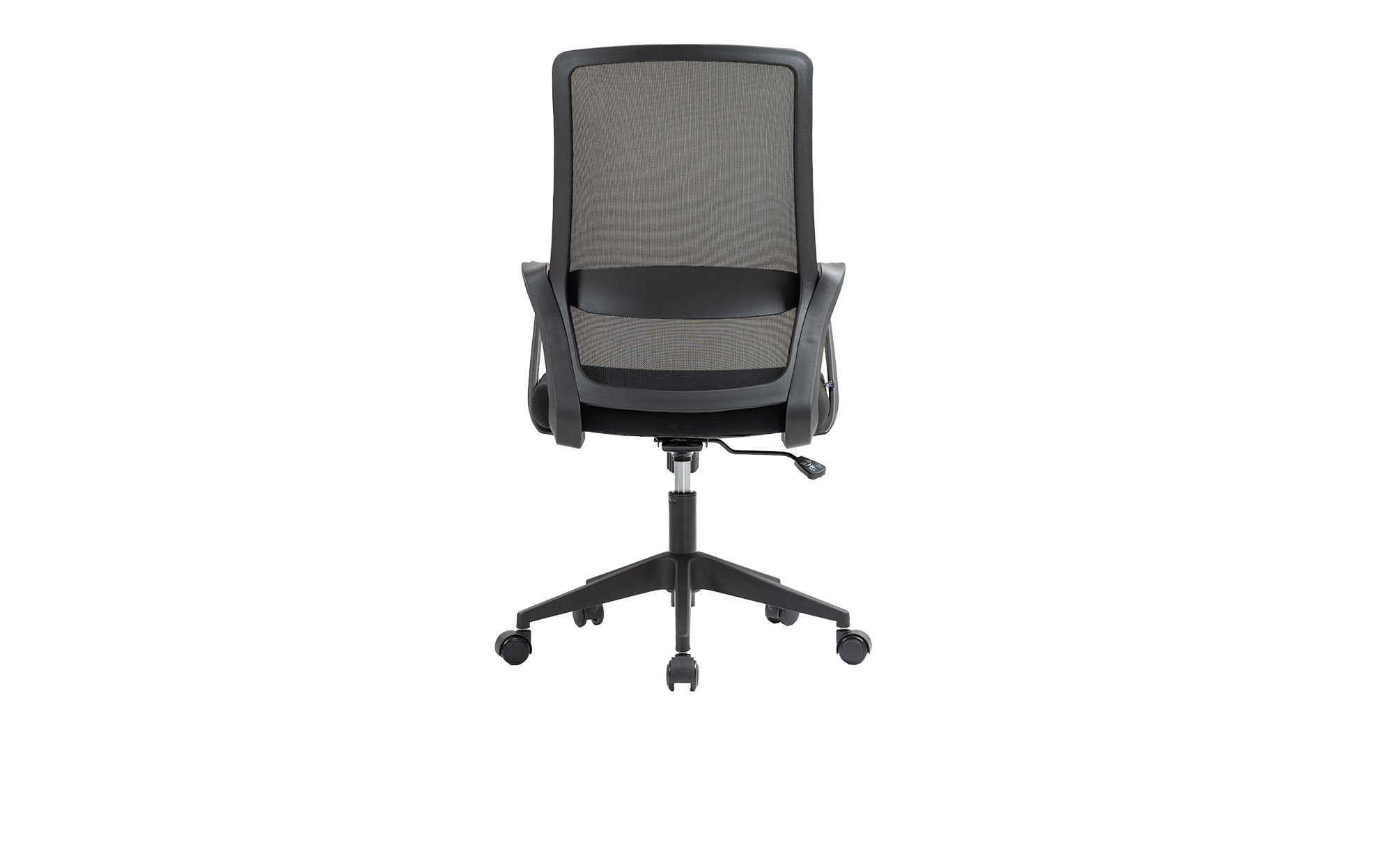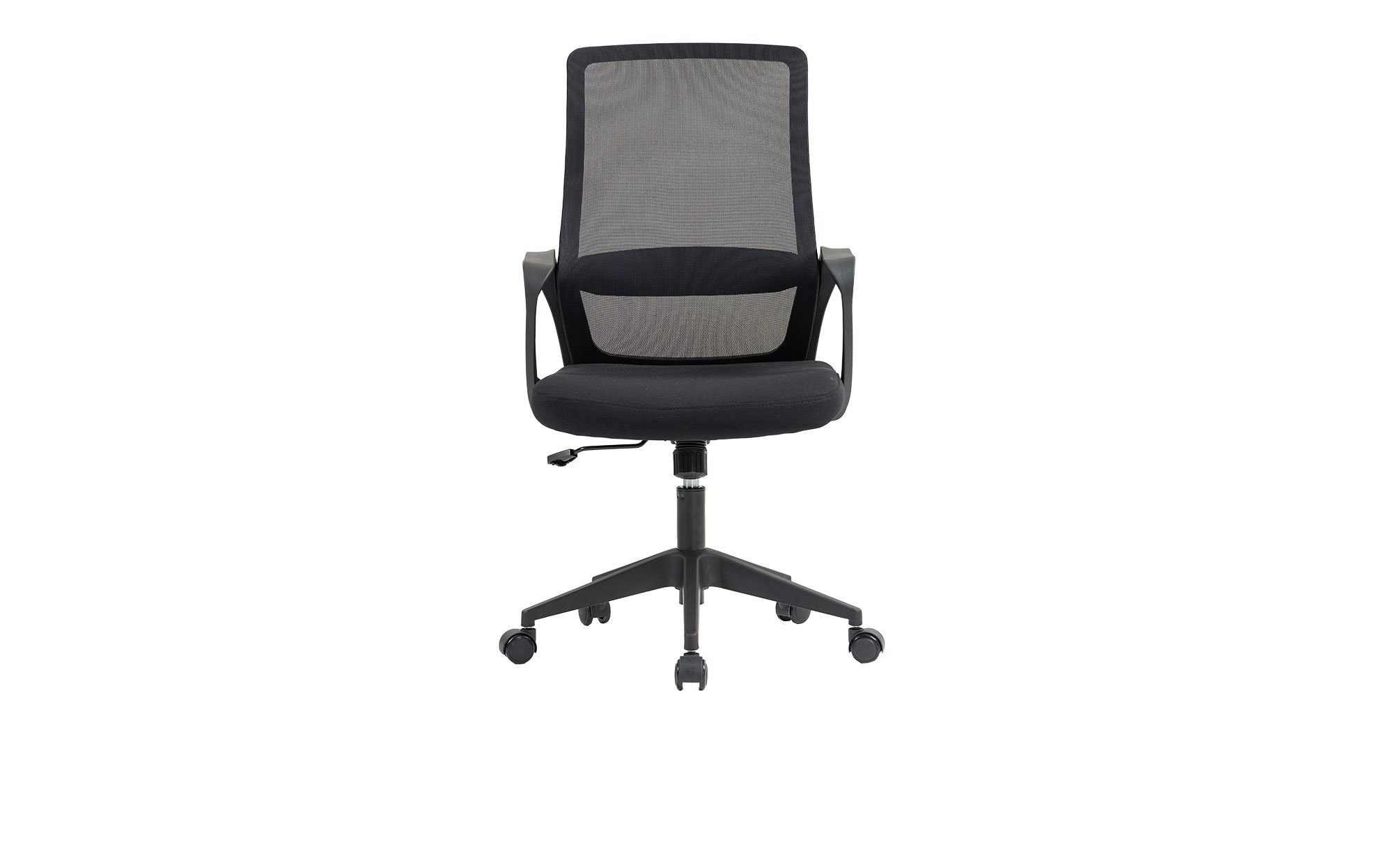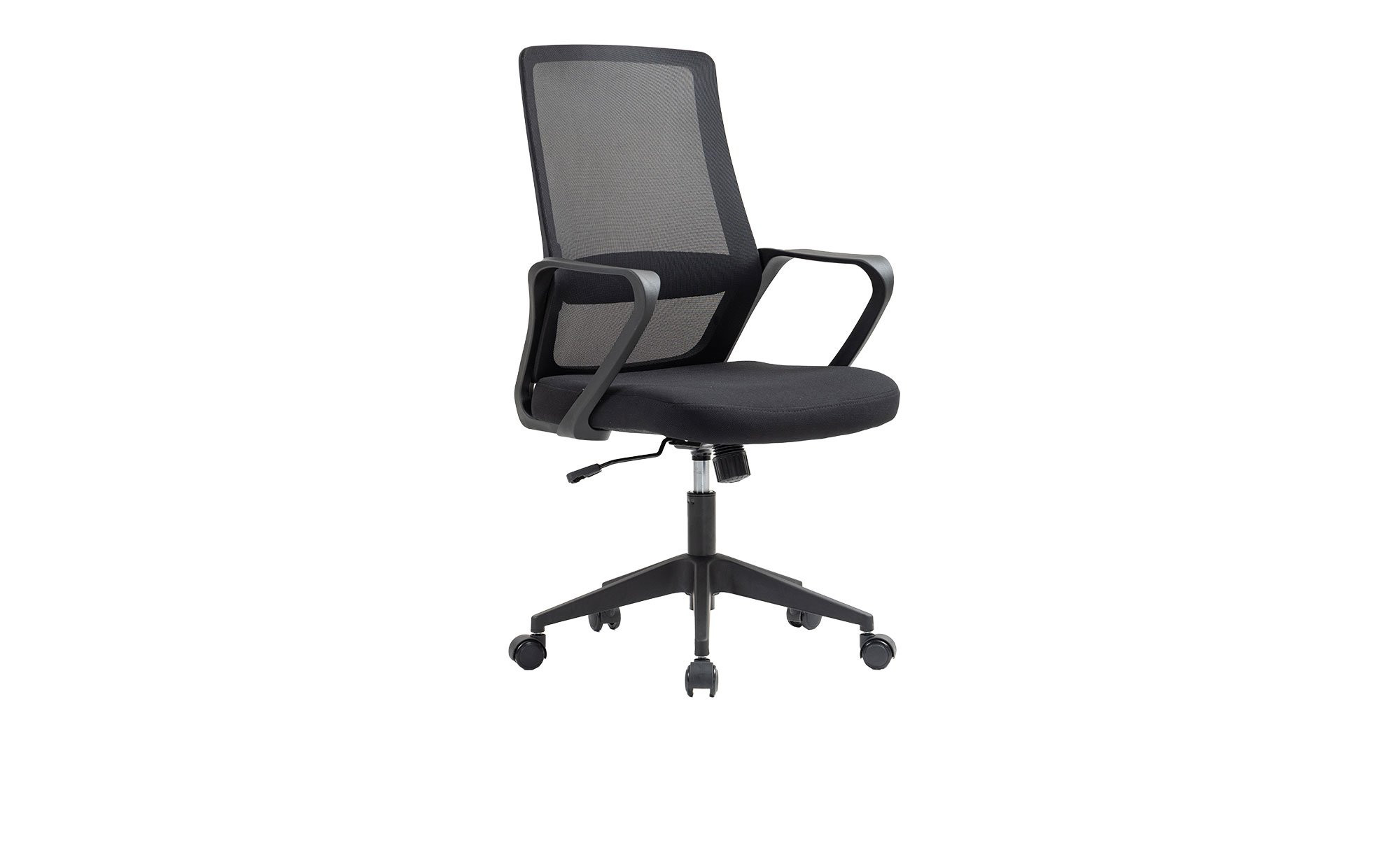 Der Artikel misst ca. 57 x 102 x 56 cm und ist mit einem schwarzen Stoffbezug sowie einem atmungsaktiven Meshgewebe bezogen. Auch das in ein Fußkreuz mündende Gestell ist schwarz. Neben einer angenehmen Schaumstoffpolsterung im Sitz erwartet Sie außerdem ein ergonomisch geformter Rücken. Darüber hinaus können Sie das drehbare Möbelstück stufenlos höhenverstellen und somit individuell anpassen.