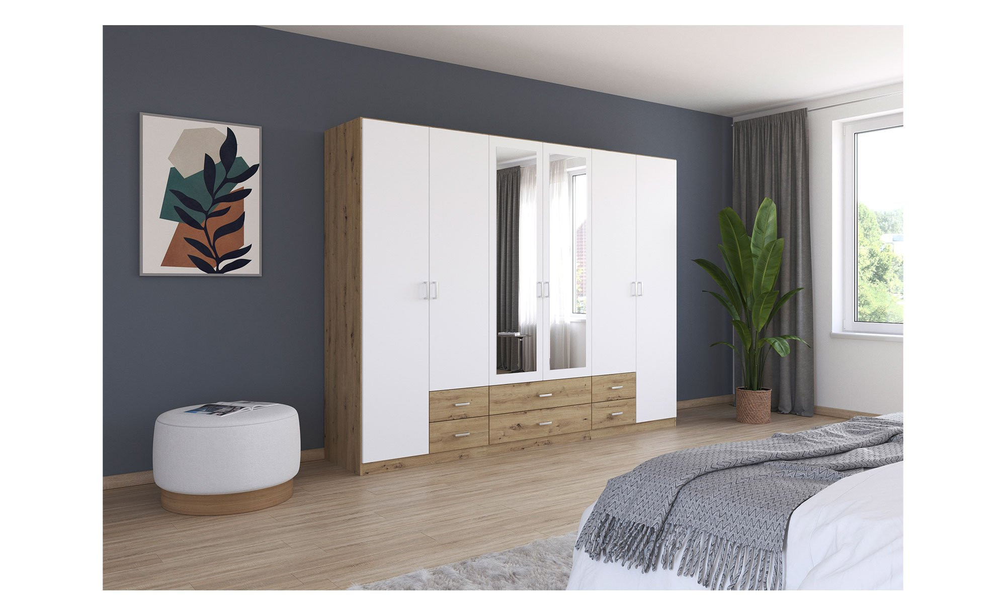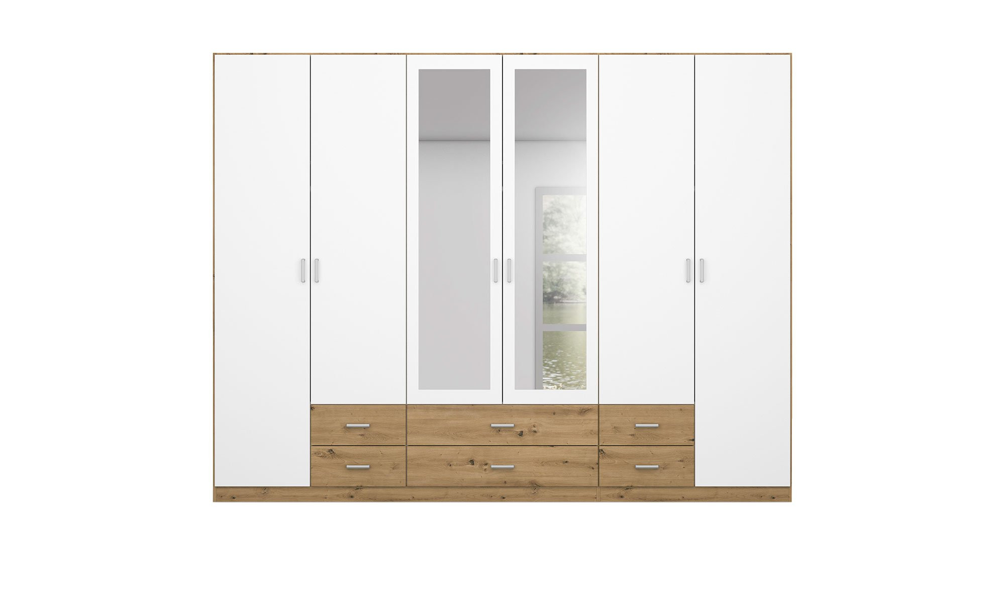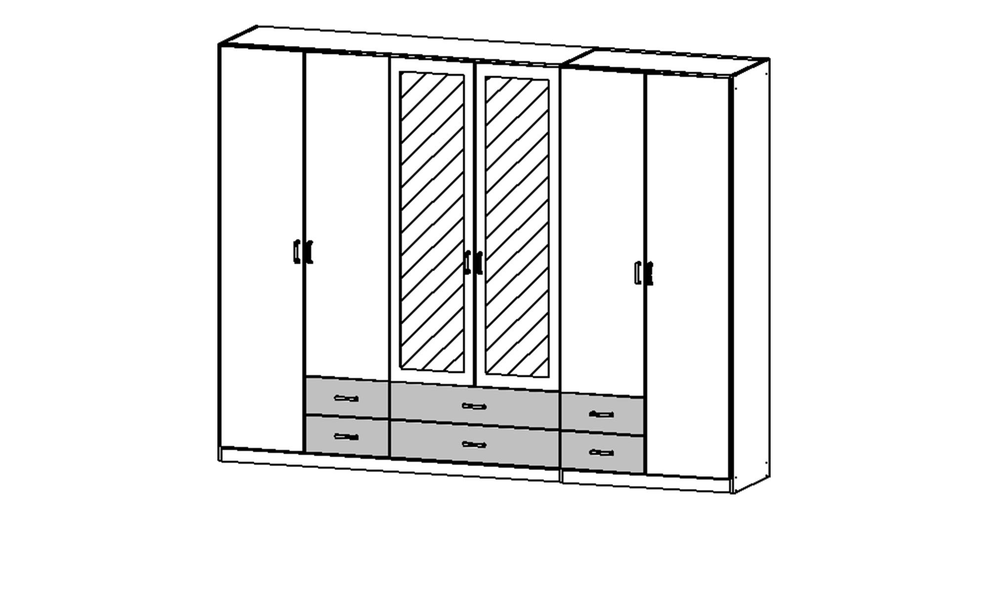 Gestaltet ist er in zeitlosem Alpinweiß. Die beiden mittleren Türen sind mit Spiegelflächen versehen und können optimal als Alternative zum Ganzkörperspiegel verwendet werden.