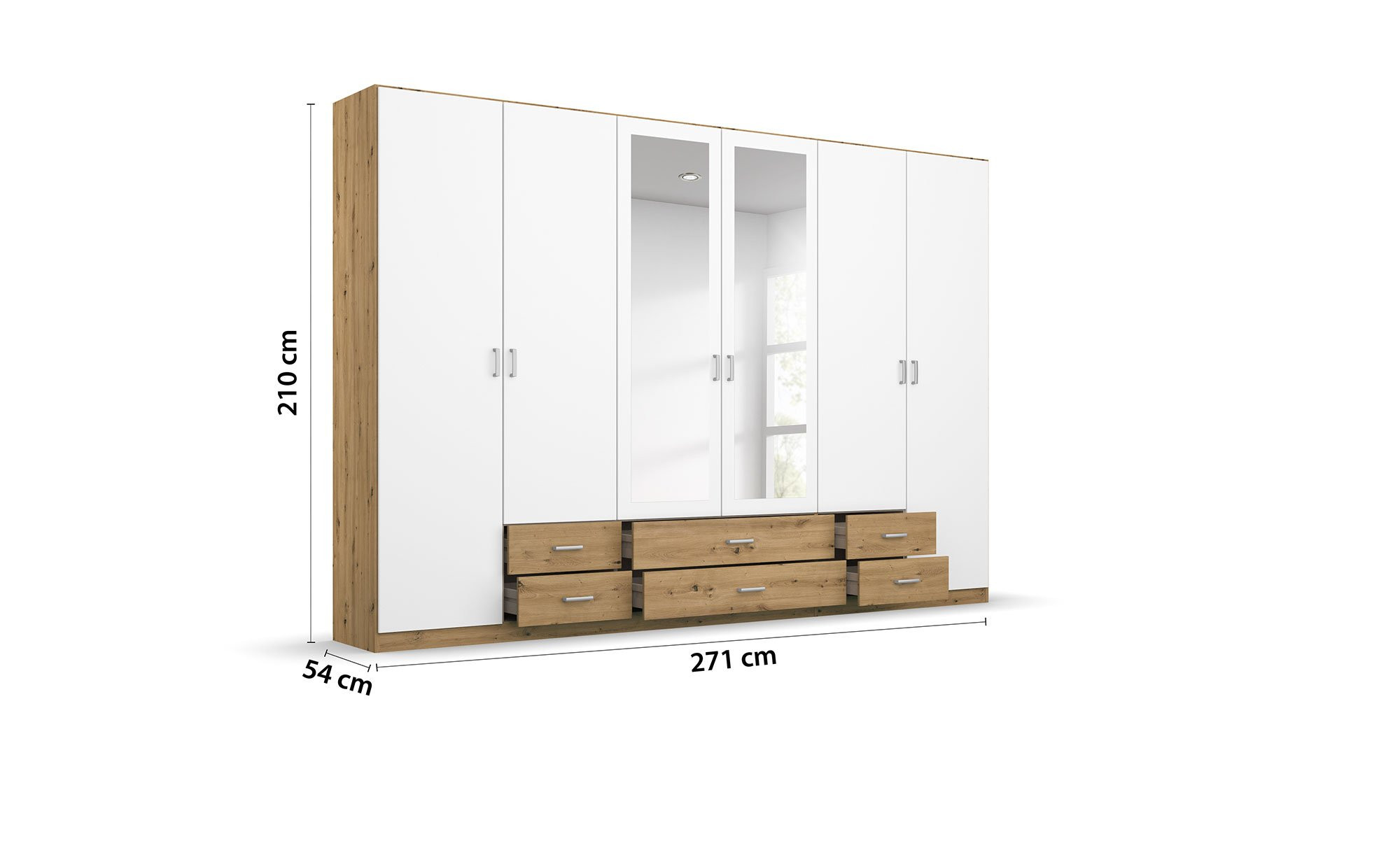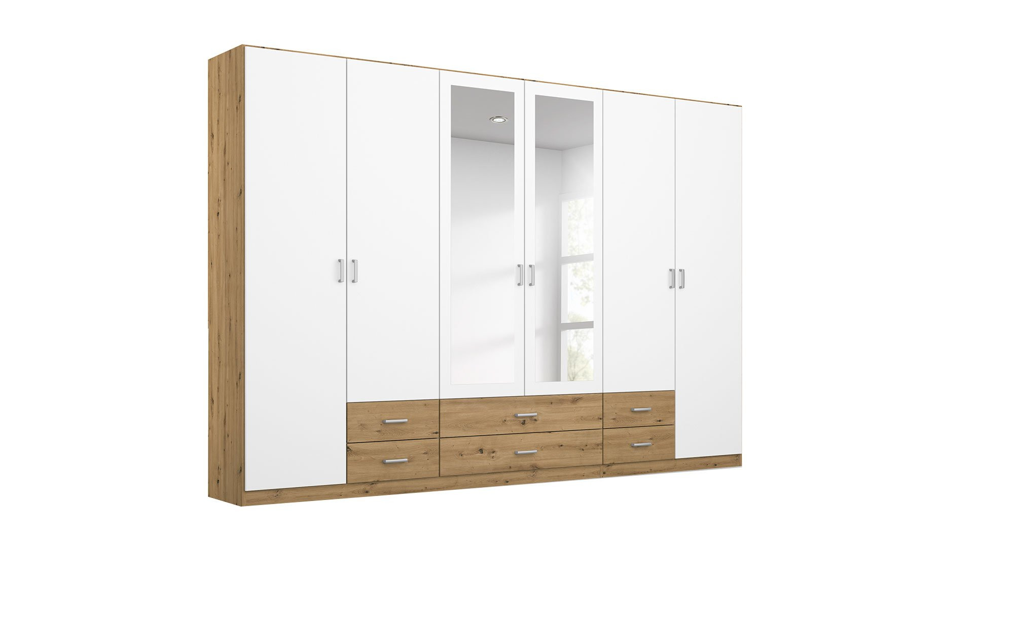 Dank eines geräumigen Innenlebens fällt es ganz einfach Ordnung zu halten. Insgesamt stehen Ihnen hinter den sechs Drehtüren drei Einlegeböden und drei Kleiderstangen zur Verfügung. Sechs Schubladen vervollständigen die Ausstattung.