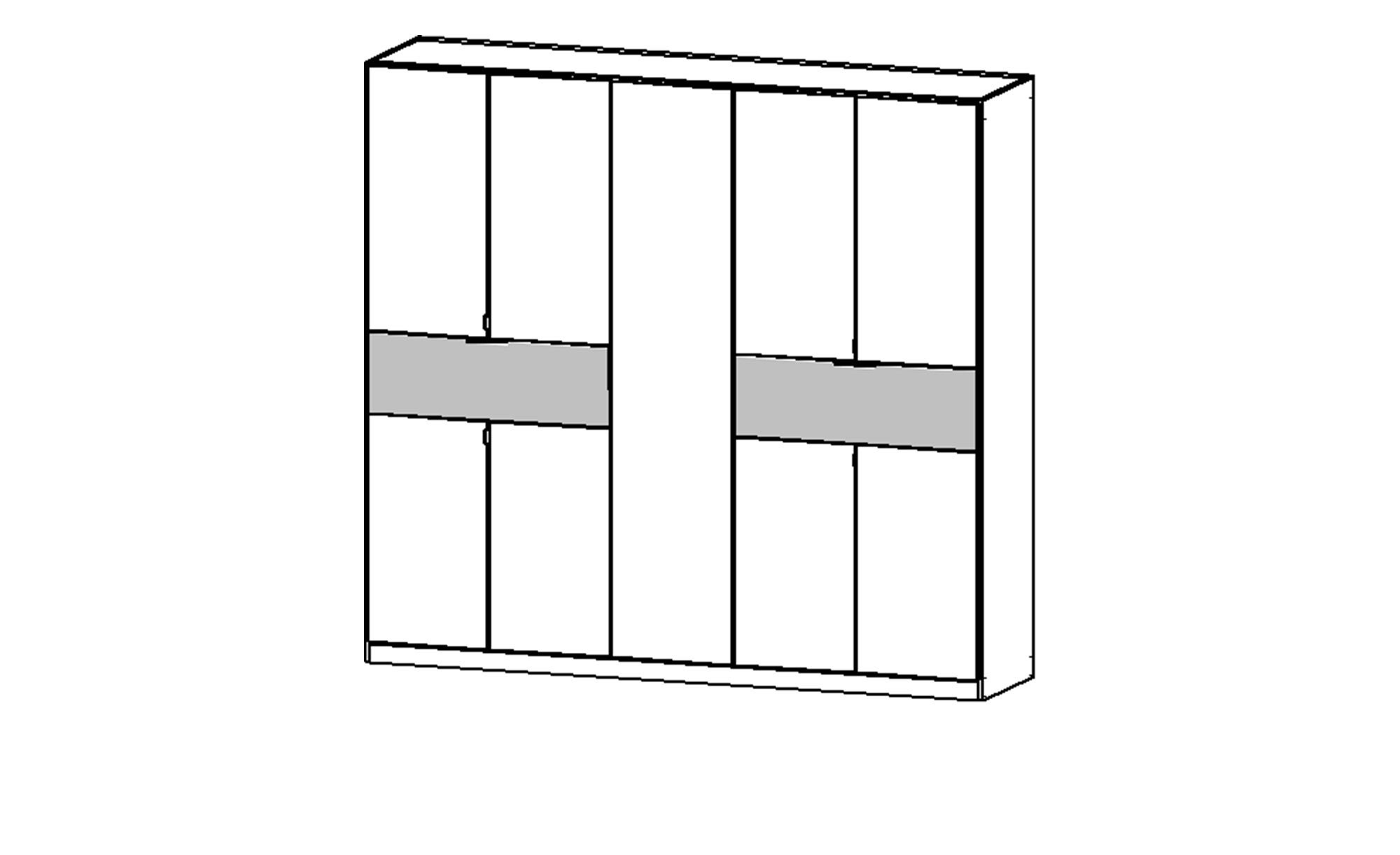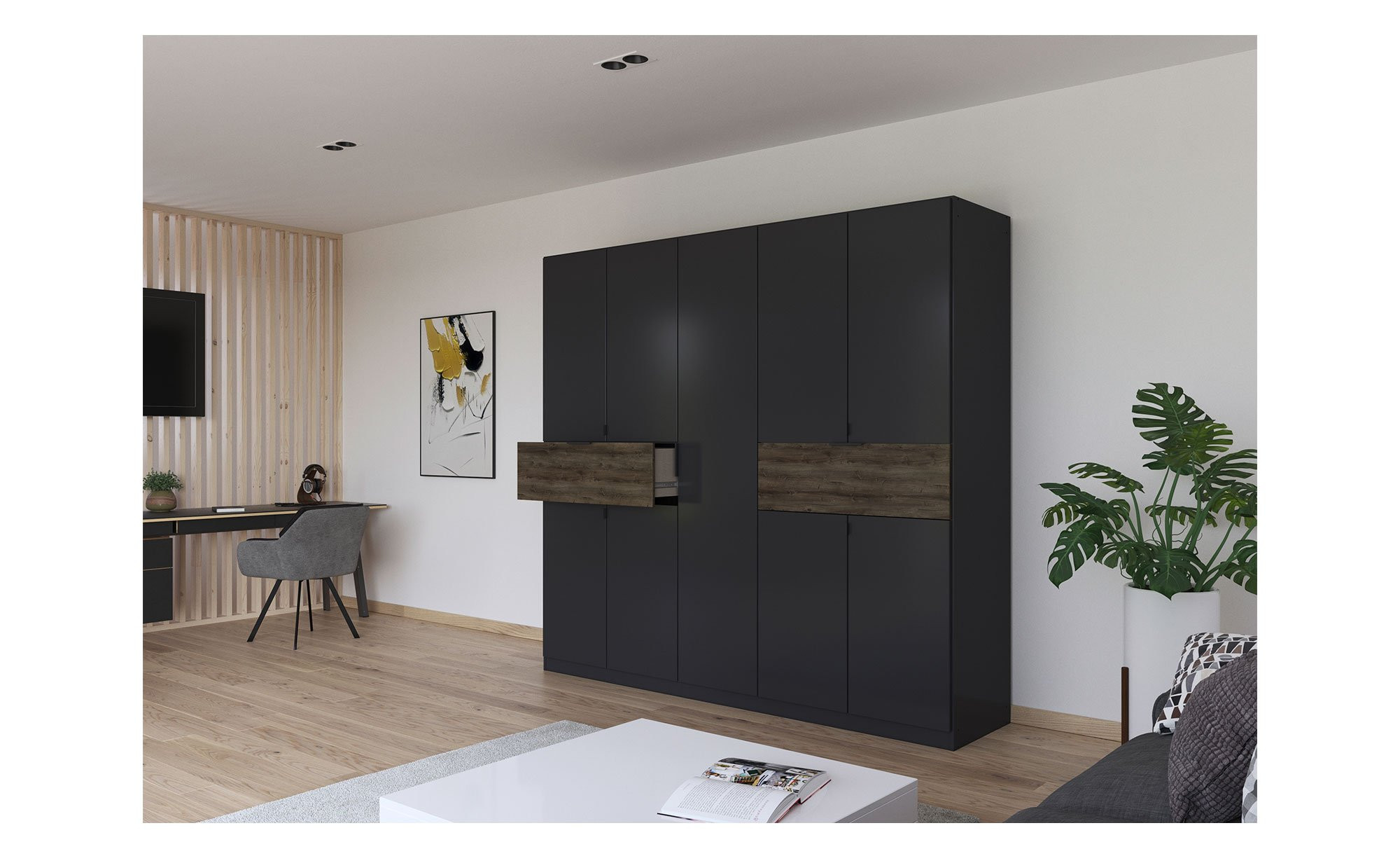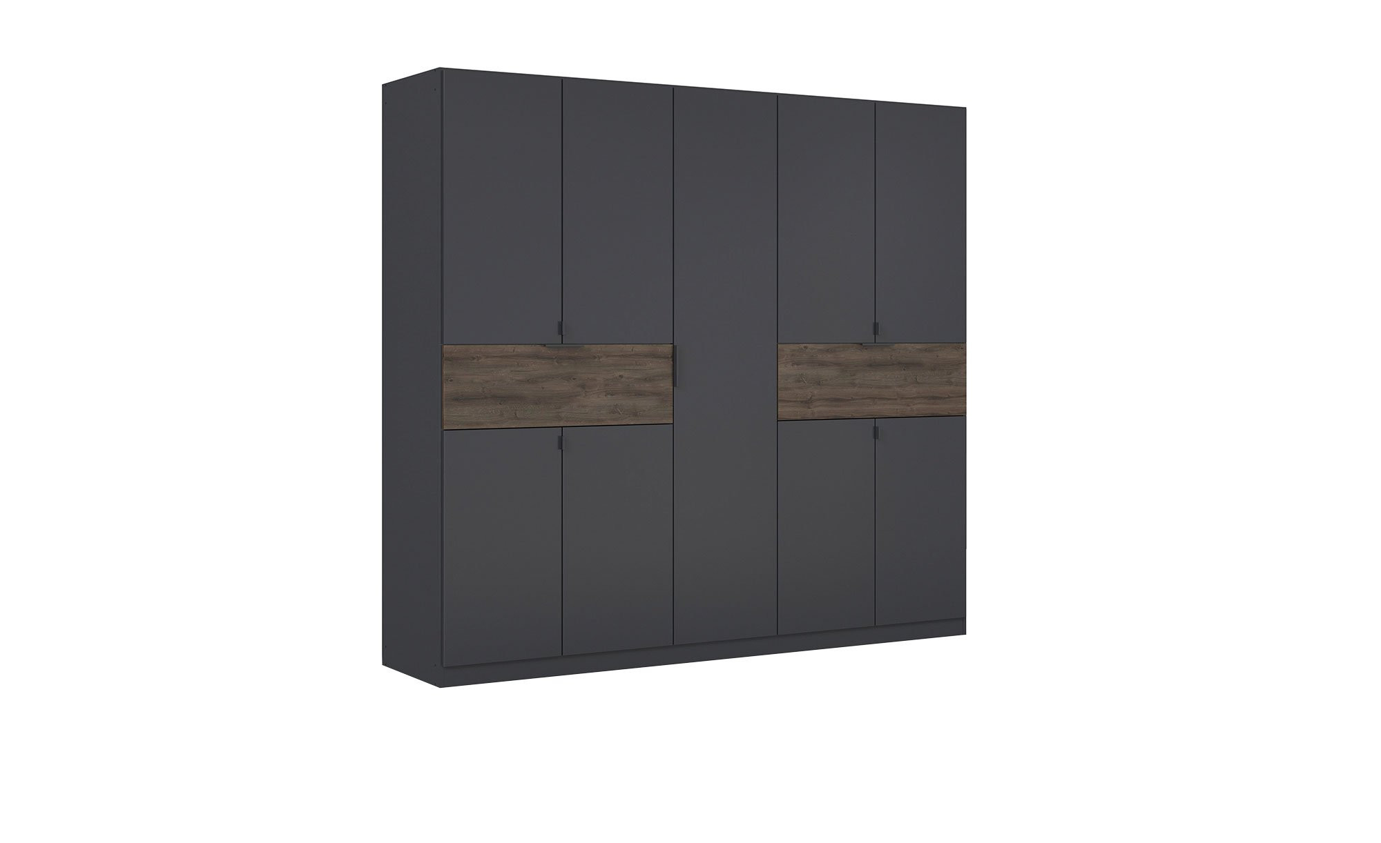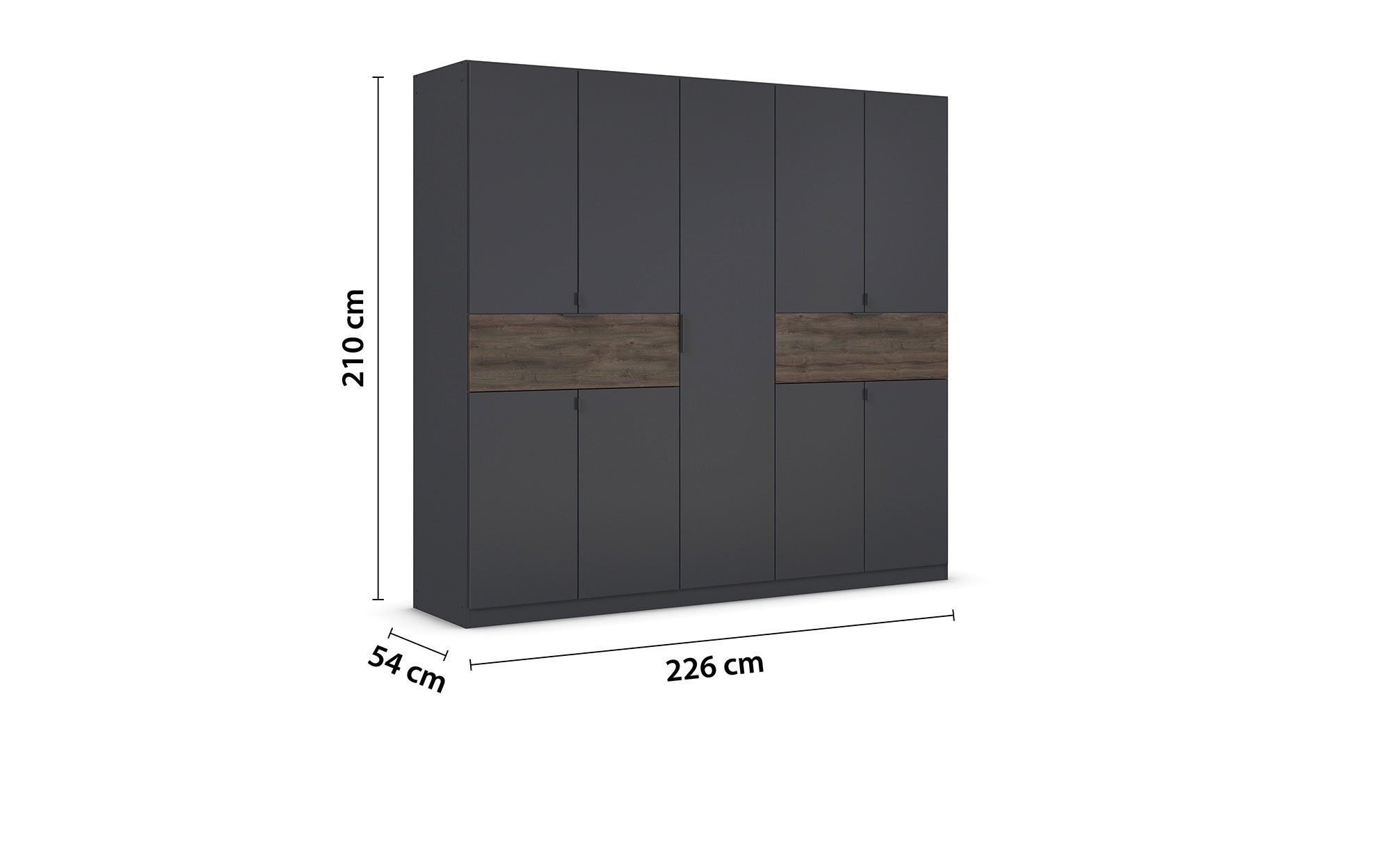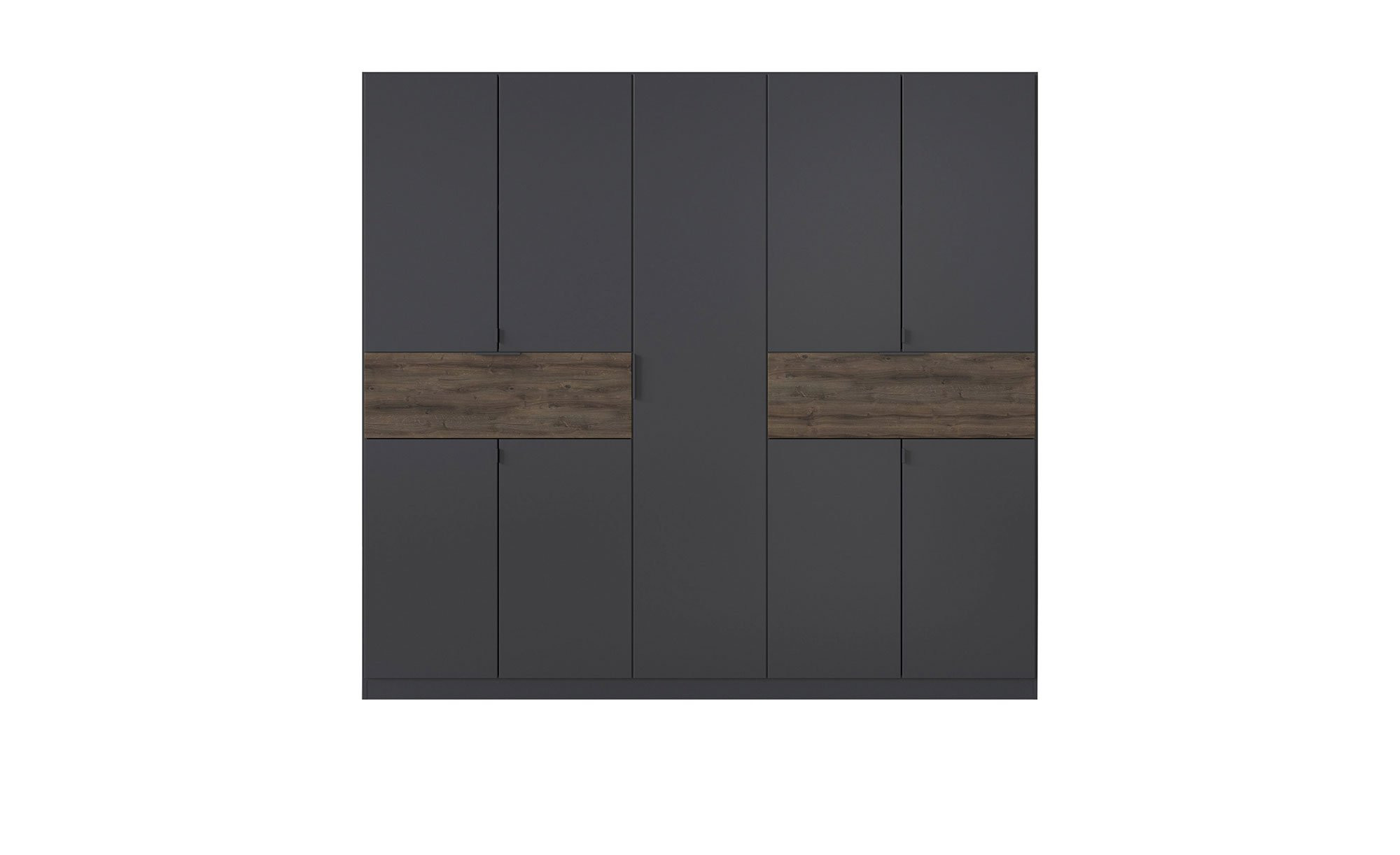 Front und Korpus des ca. 226 x 210 x 54 cm großen Möbelstücks bestehen aus Holzwerkstoff in einem edlen Grau metallic. Als Absetzung befindet sich an der Vorderseite der Schubkästen zudem ein dunkles Atlantic Oak-Dekor.