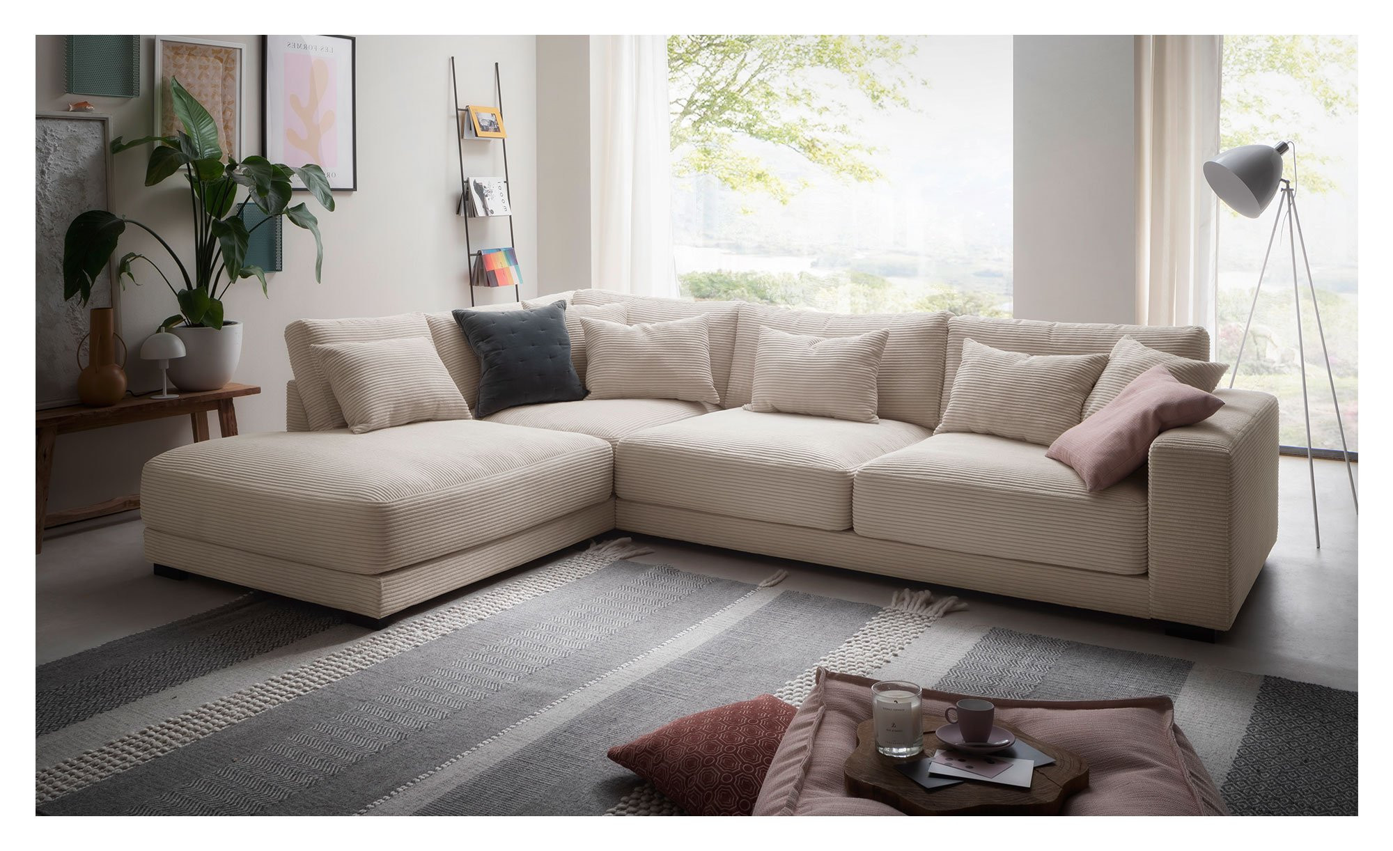 Das ca. 310 x 85 x 220 cm große Sofa ist in einem beigen Cordstoff gehalten, der sowohl die Sitzfläche als auch die Rückseite umschließt. Im Lieferumfang sind außerdem fünf großzügige Rückenkissen sowie vier Zierkissen im selben Stoff enthalten. Zusätzlich sorgen zwei Zierkissen in Rosa und Türkisblau für einen gelungenen Farbakzent. Abgerundet wird das Design durch elegante Holzfüße in Wenge.