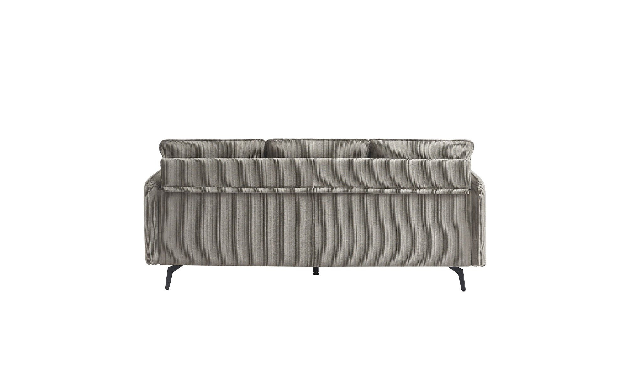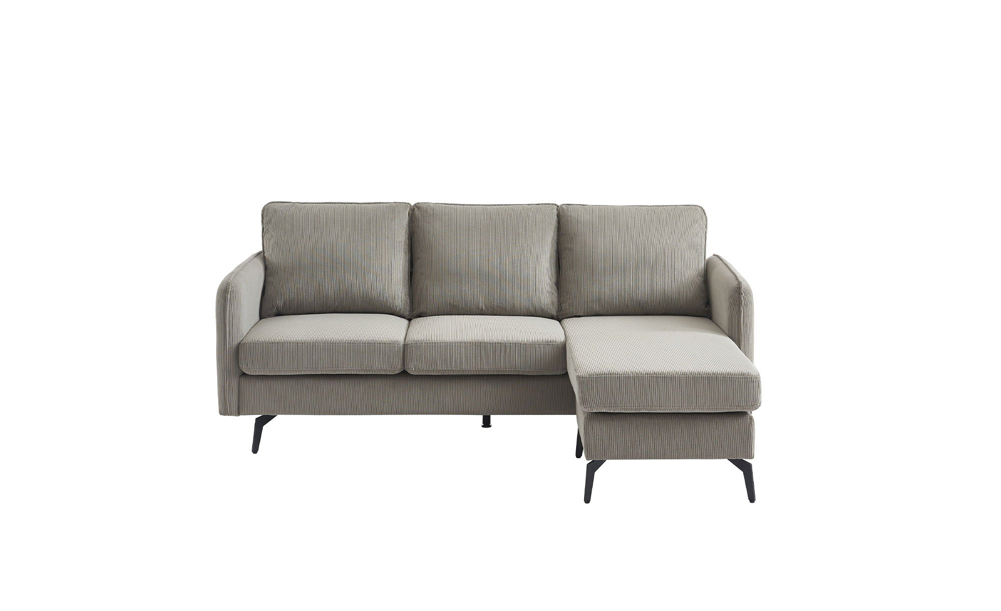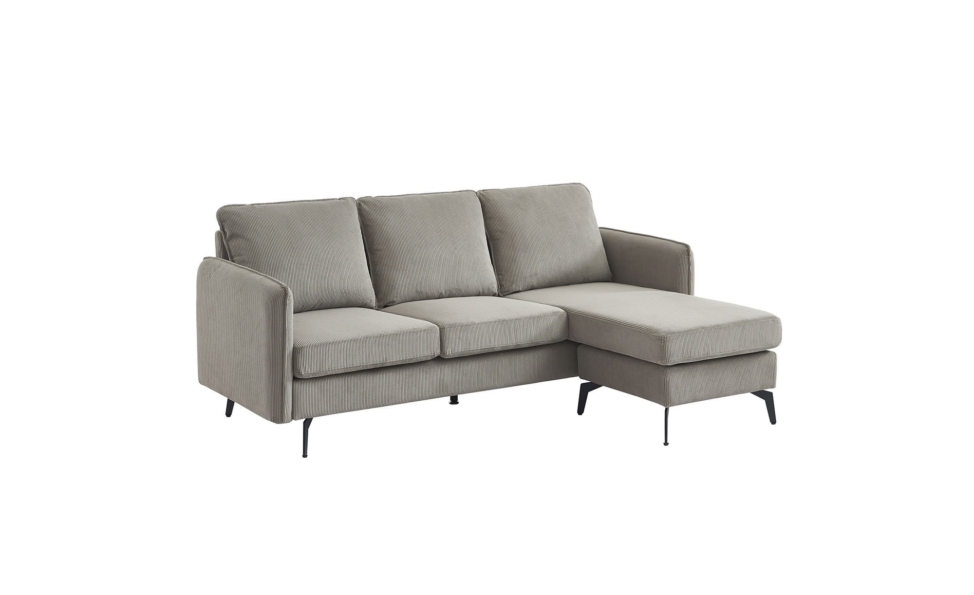 Sie können das Möbelstück sowohl als 3-Sitzer mit Hocker als auch als Ecksofa nutzen. Es begeistert mit einem grauen Cordstoff, inklusive echtem Rücken. Außerdem dürfen Sie sich auf ca. 14 cm hohe Füße aus schwarzem Eisen freuen.