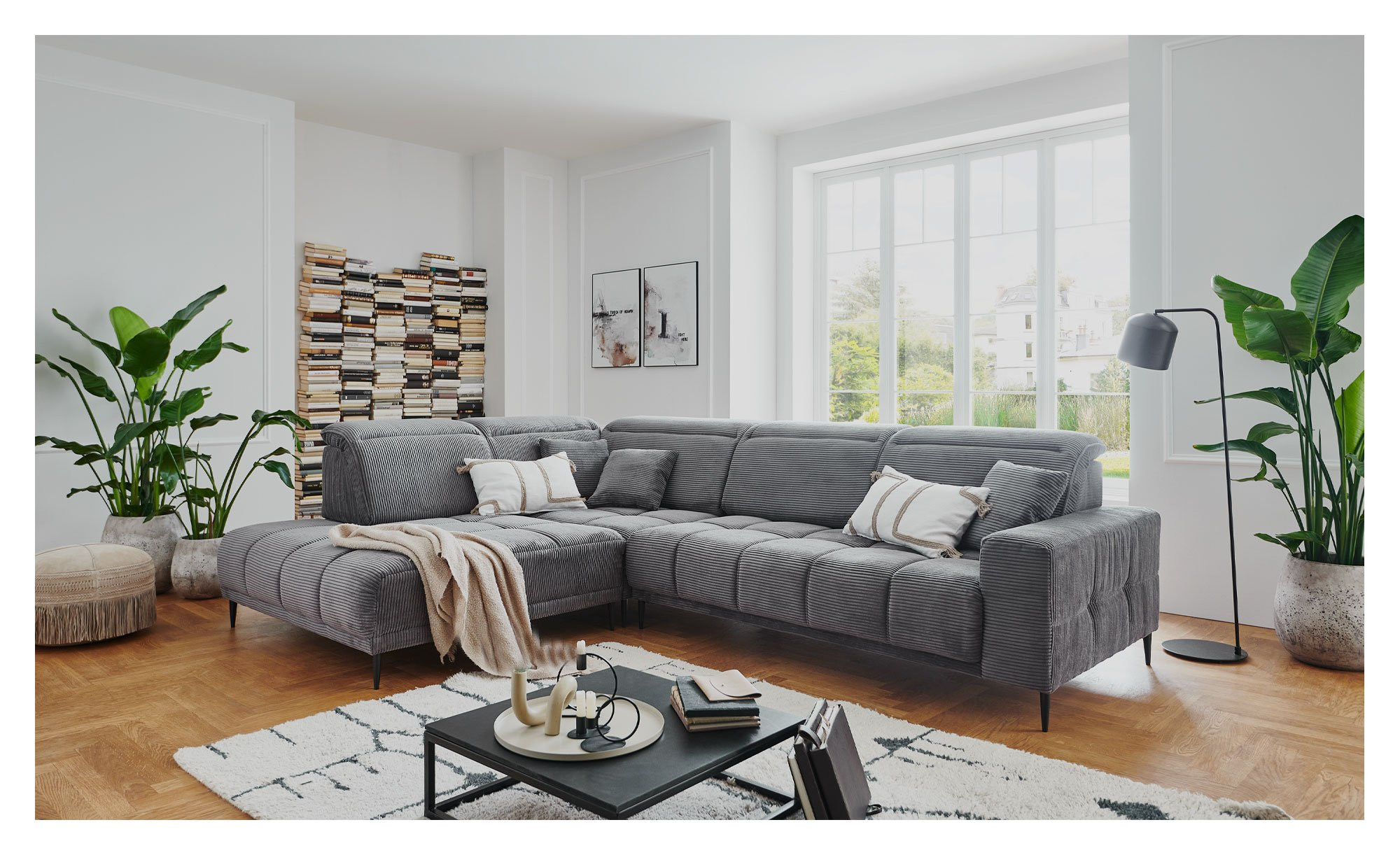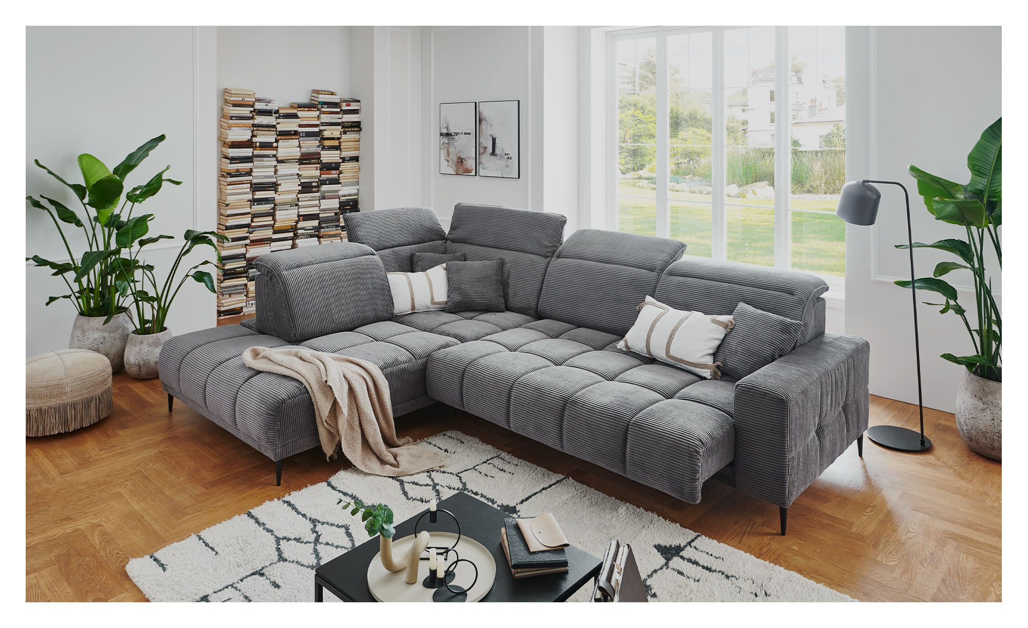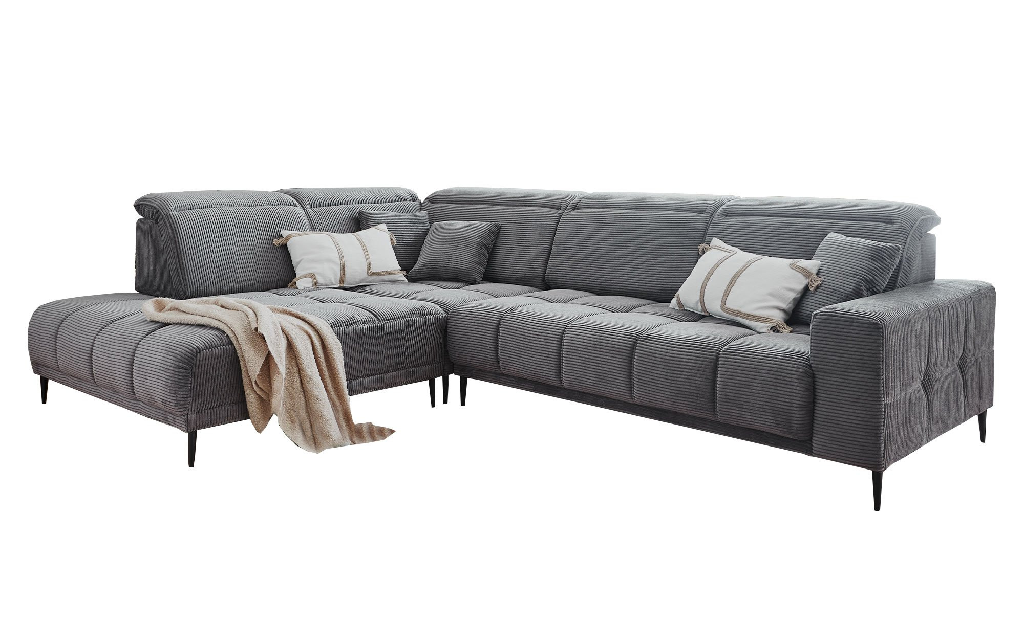 Das Ecksofa Luan zieht dank seines grauen Cord-Stoffbezugs (ca. 317 x 87-107 x 230 cm) alle Blicke auf sich und schafft sofort eine einladende Atmosphäre in Ihrem Wohnzimmer. Der echt bezogene Rücken ermöglicht flexible Stellmöglichkeiten, während drei mitgelieferte Zierkissen im gleichen Stoff und schwarze Metallfüße das stilvolle Gesamtbild abrunden.
