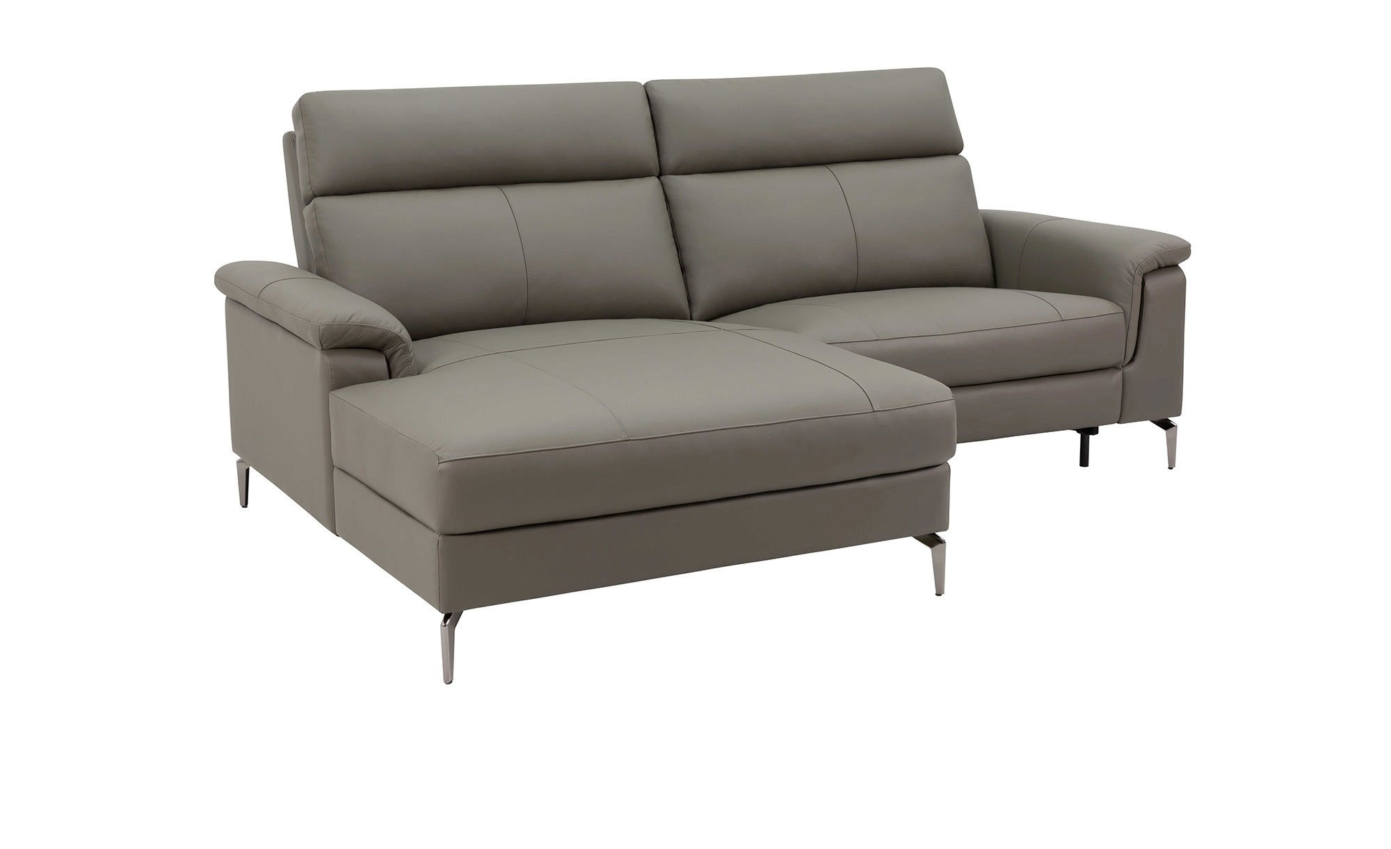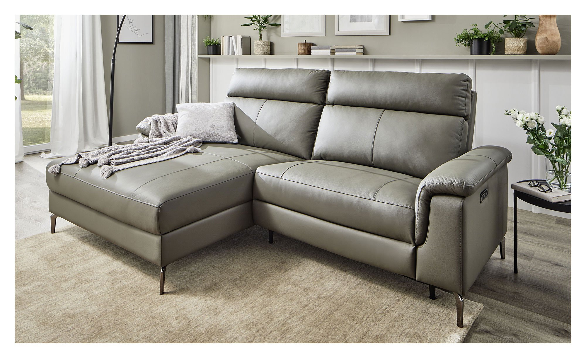 Mehr Platz, mehr Komfort, mehr Stil – unser Ecksofa Uelzen setzt ein Statement und hat das Potenzial, zum neuen Lieblingsort im Wohnzimmer zu werden! Das großzügig gestaltete, linksseitig ausgerichtete Möbelstück ist mit einem hochwertigen Materialmix aus Leder und PVC in warmem Braun bezogen, der für eine einladende Atmosphäre sorgt. Da auch der Rücken vollständig echt ist, lässt sich das Sofa flexibel im Raum positionieren. Filigrane Metallfüße setzen einen modernen Akzent und runden das Erscheinungsbild ab.