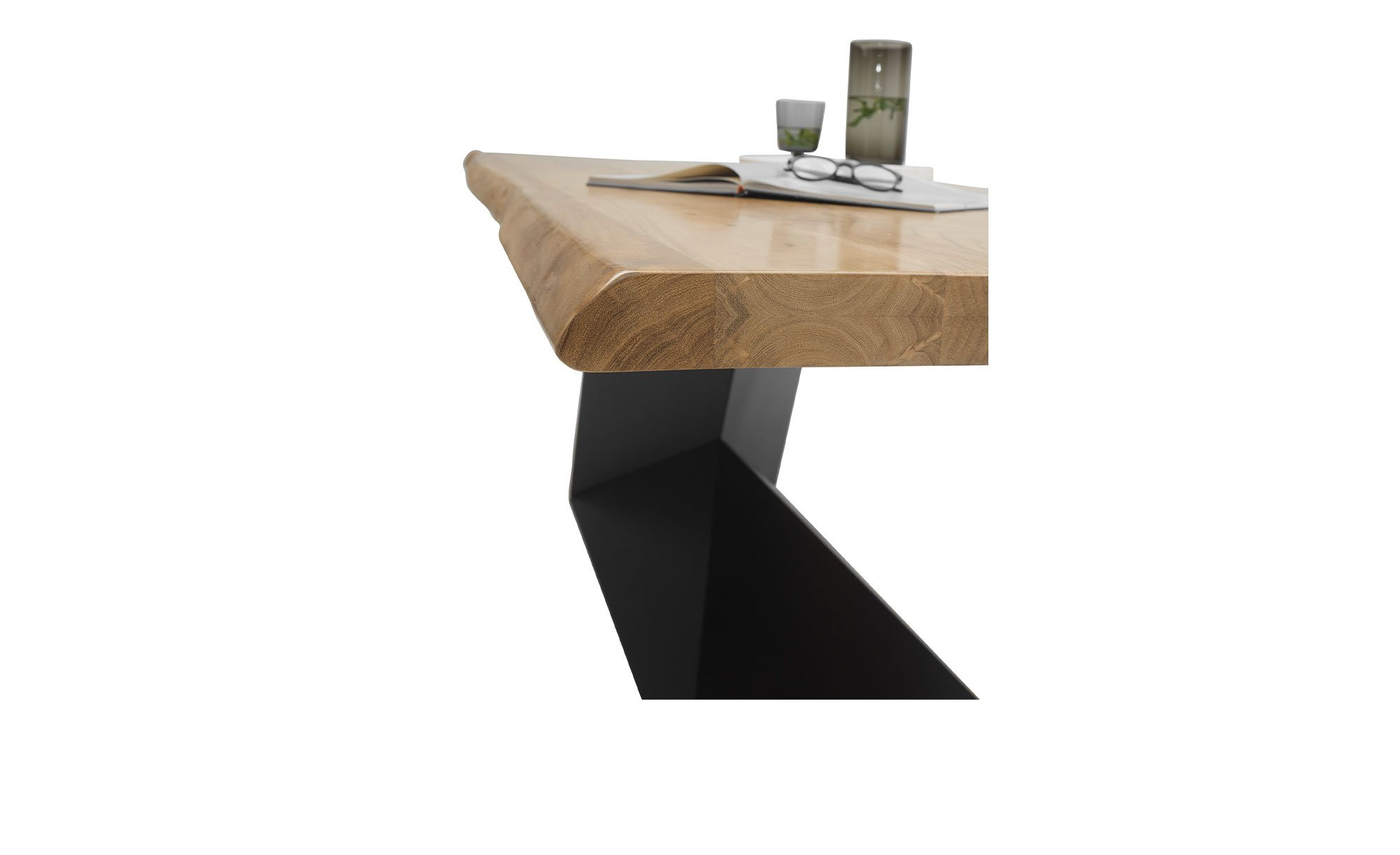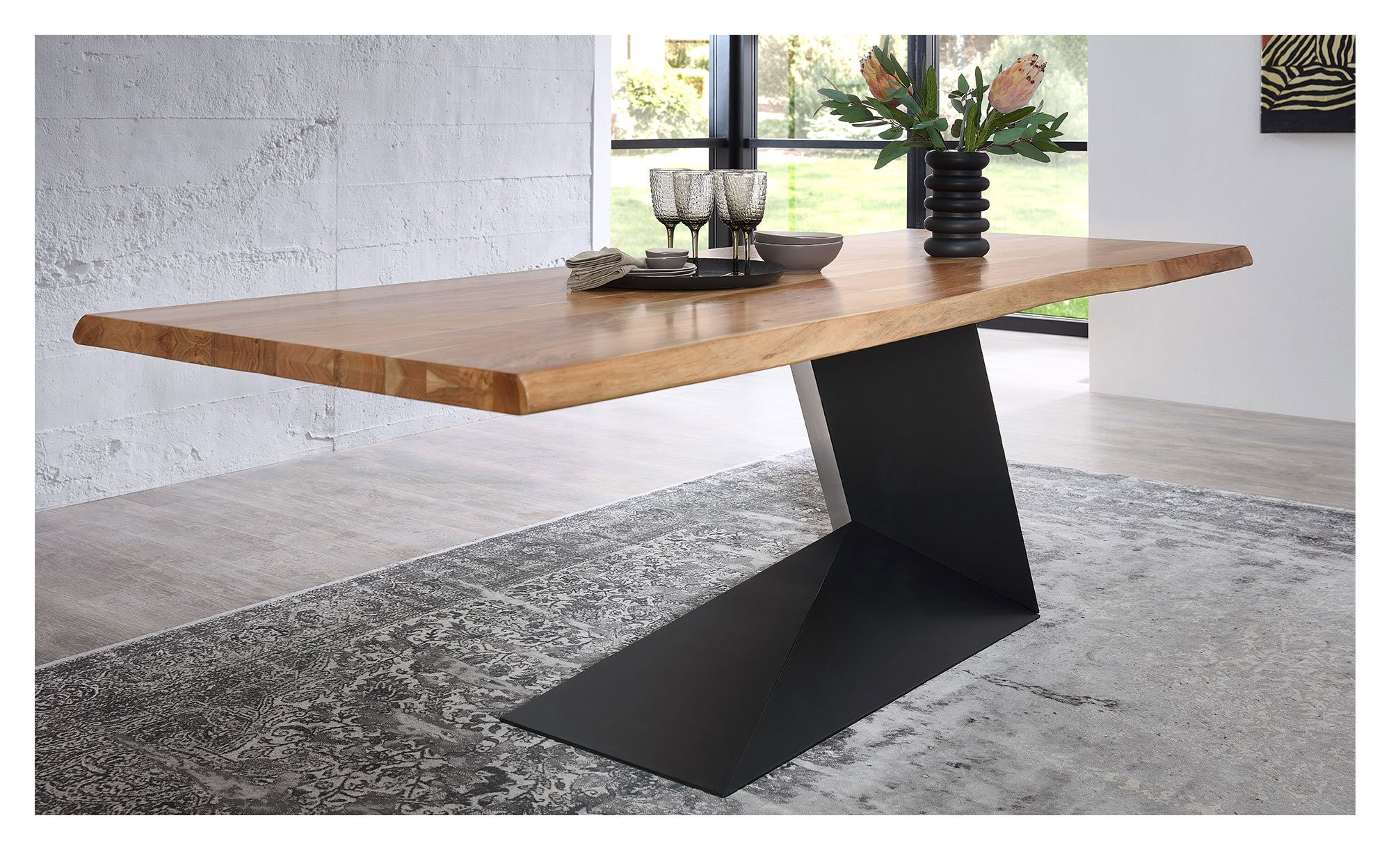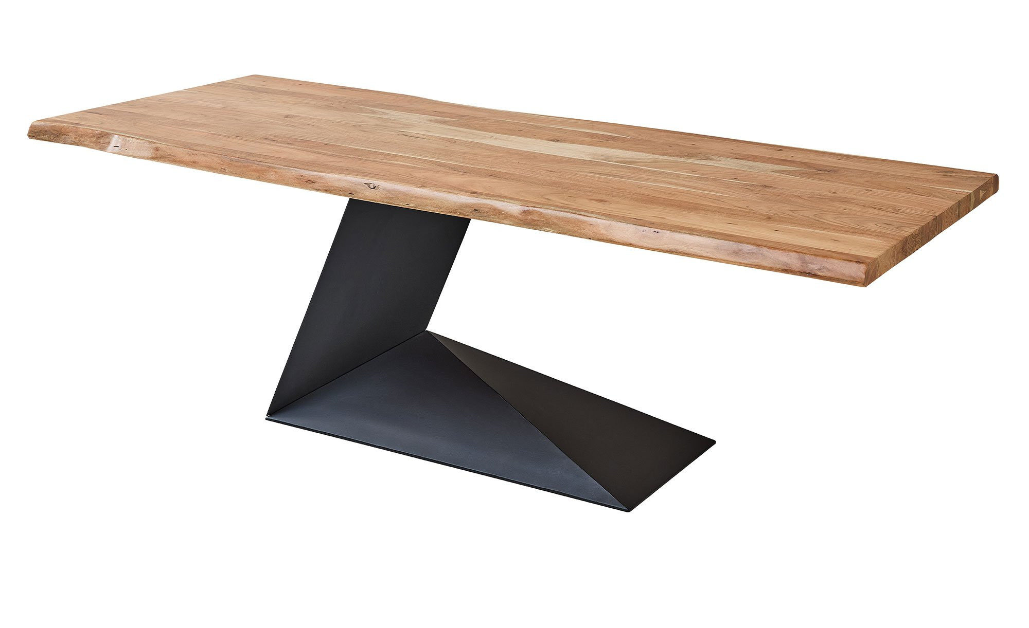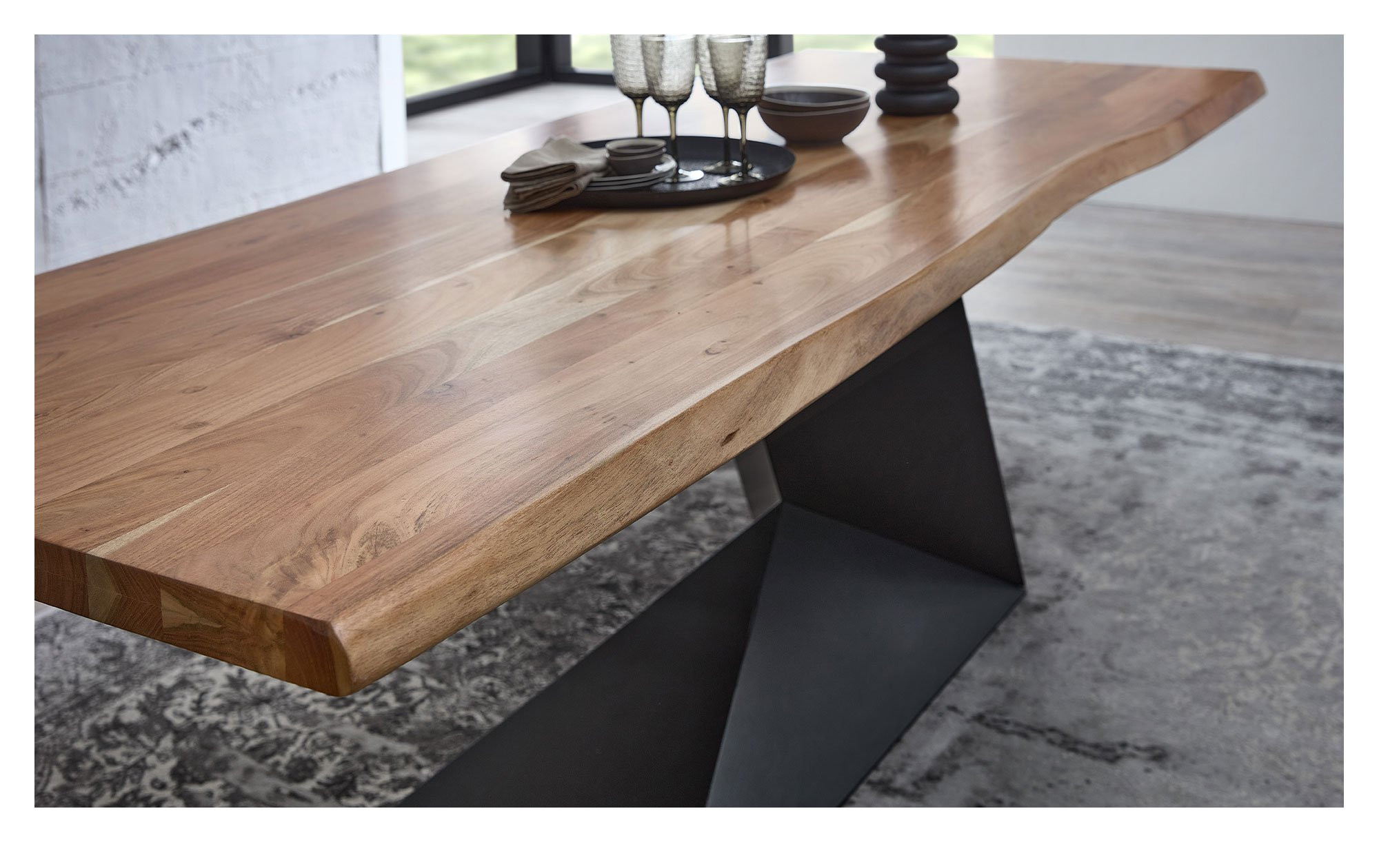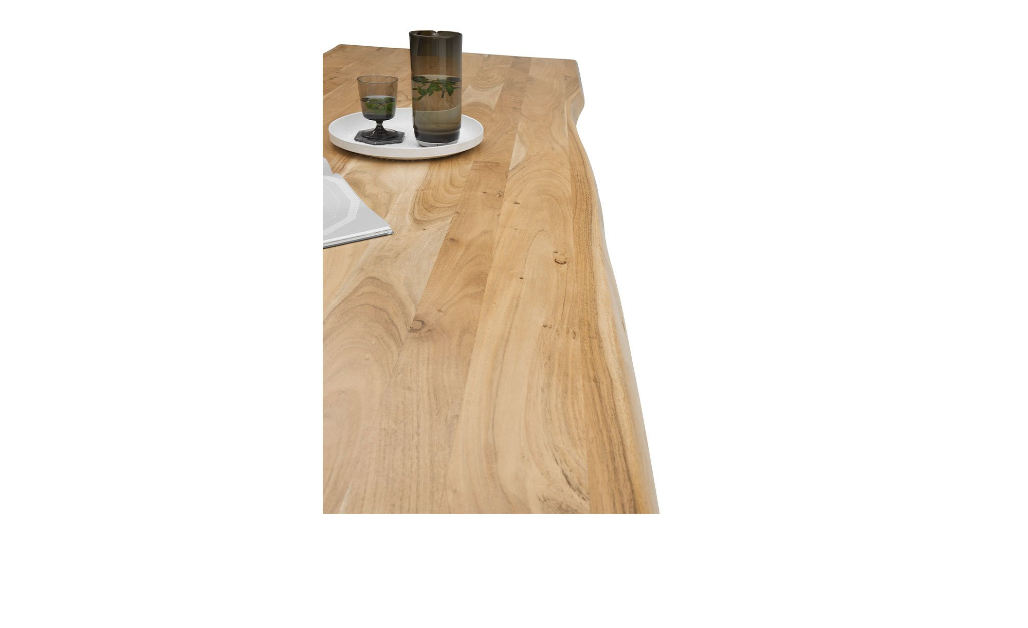 Die rechteckige Platte des ca. 240 x 76 x 100 cm großen Möbelstücks besteht aus massiver Akazie mit lackierter Oberfläche. Besonders beeindruckend ist ihre doppelte Baumkante, die für einen ursprünglichen, robusten Charme sorgt.