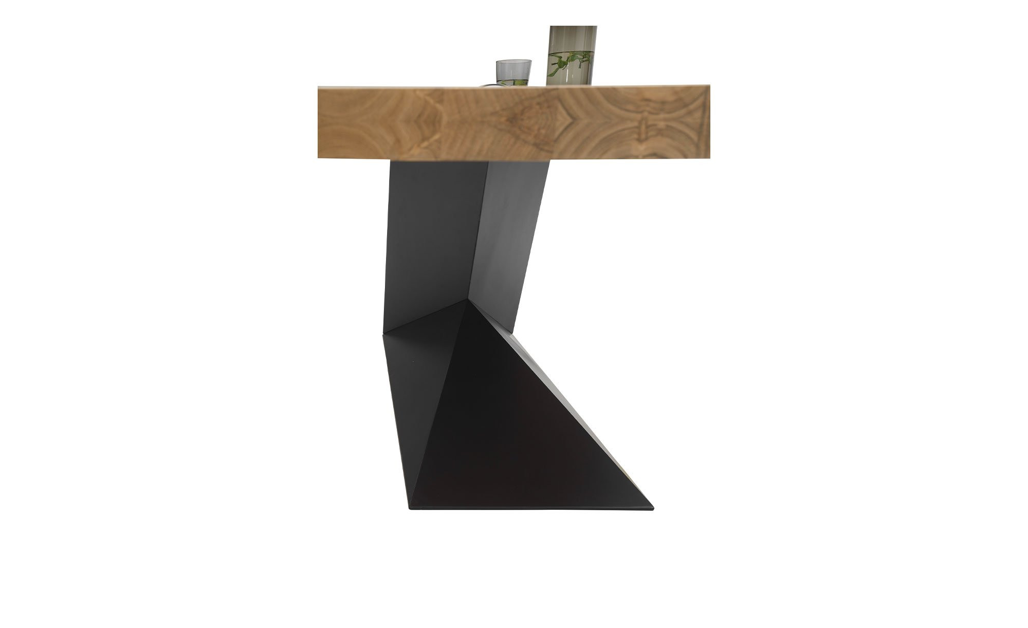 Abgerundet wird das Erscheinungsbild durch ein mit dem natürlichen Material kontrastierendes Metallgestell in stylisher L-Form. Es ist schwarz pulverbeschichtet.