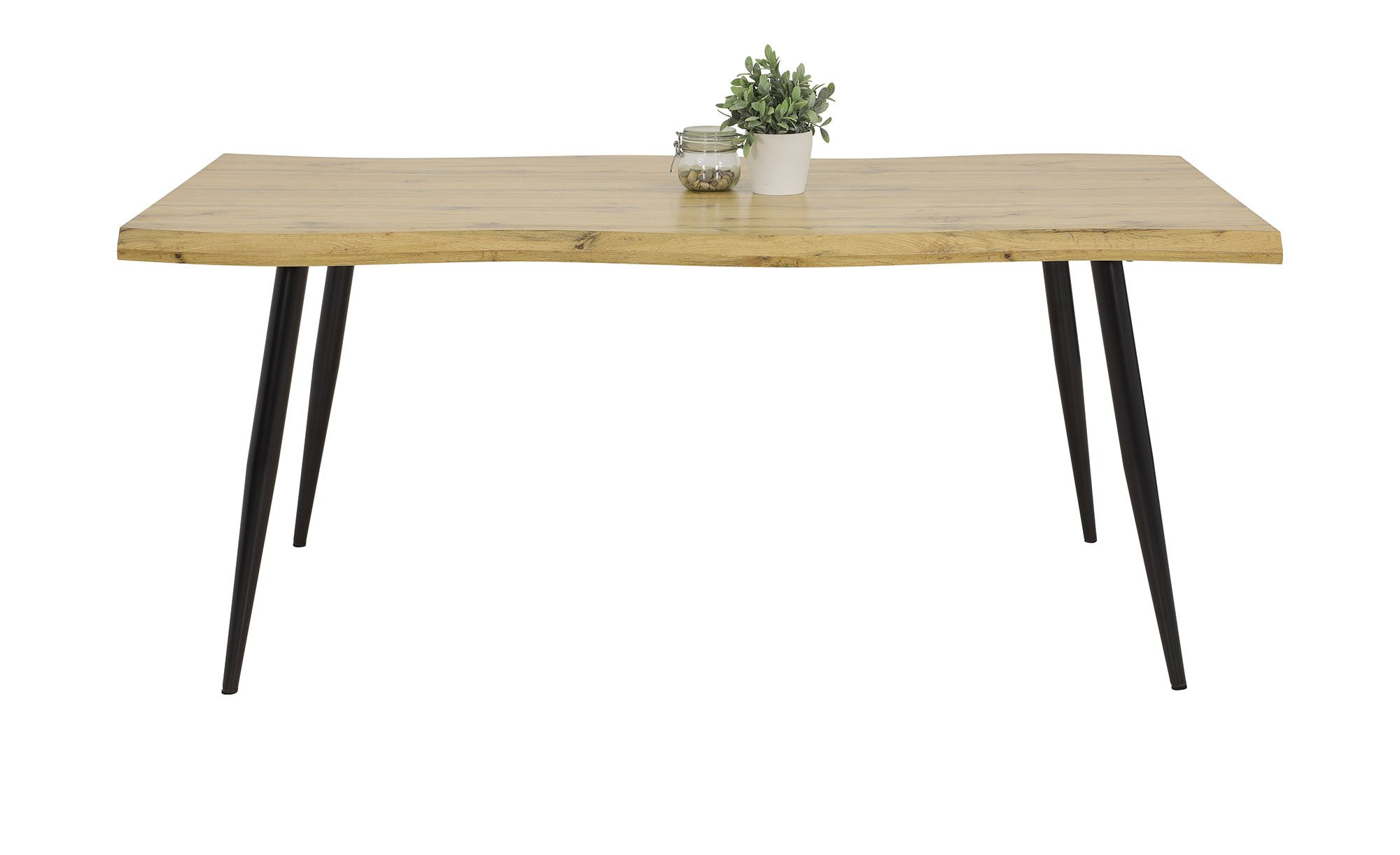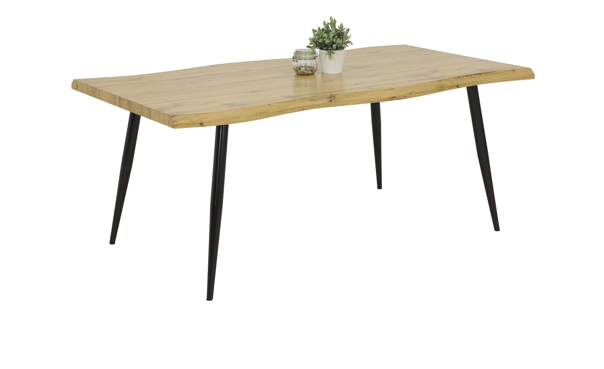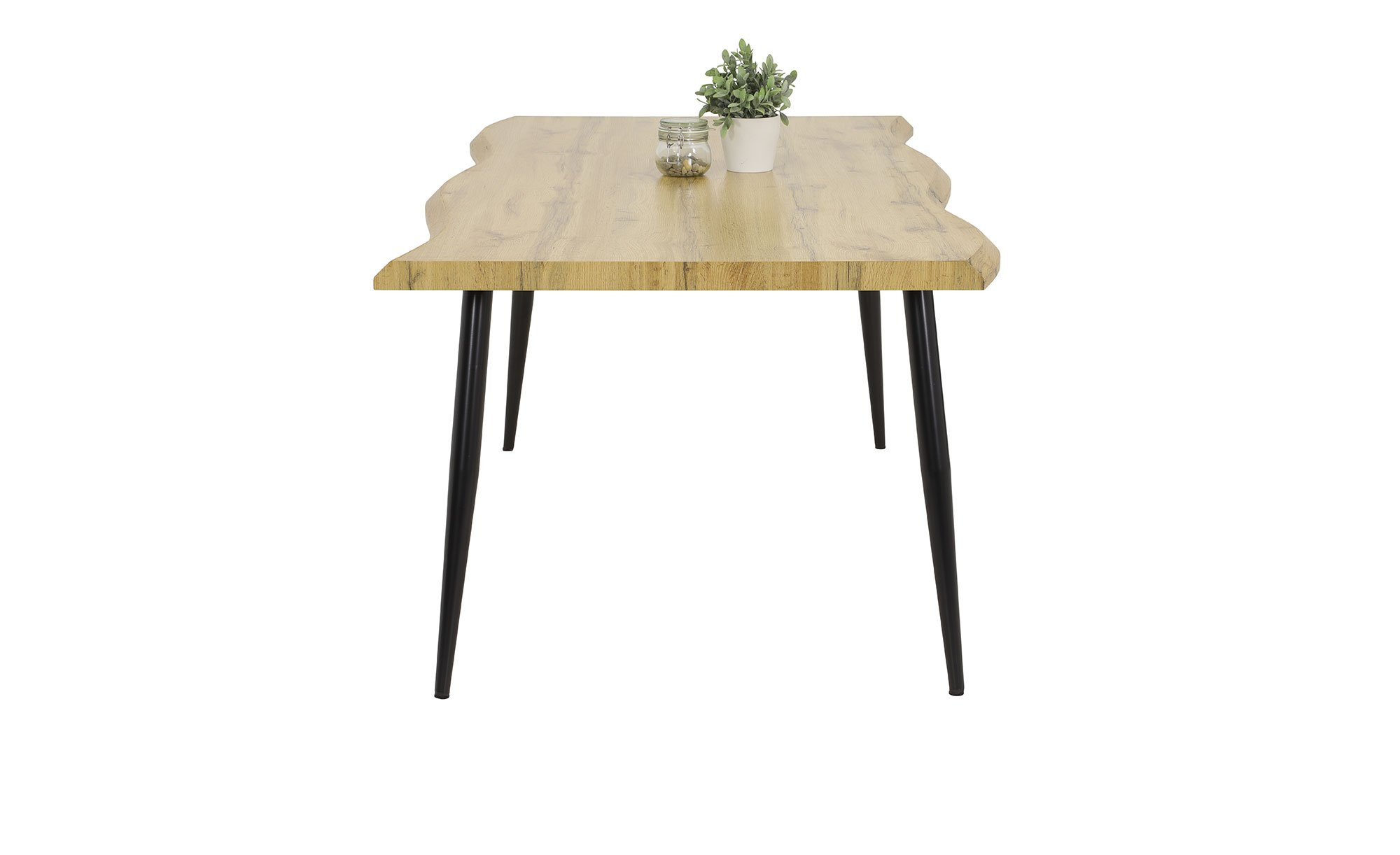 Der rechteckige Tisch verfügt über eine Platte aus Holzwerkstoff, die dank ihres Wildeiche-Dekors und zusätzlicher Baumkanten-Optik für einen natürlichen Charme sorgt. Ihre Melaminharzbeschichtung schützt sie zudem wirkungsvoll vor Kratzern und sonstigem Verschleiß.