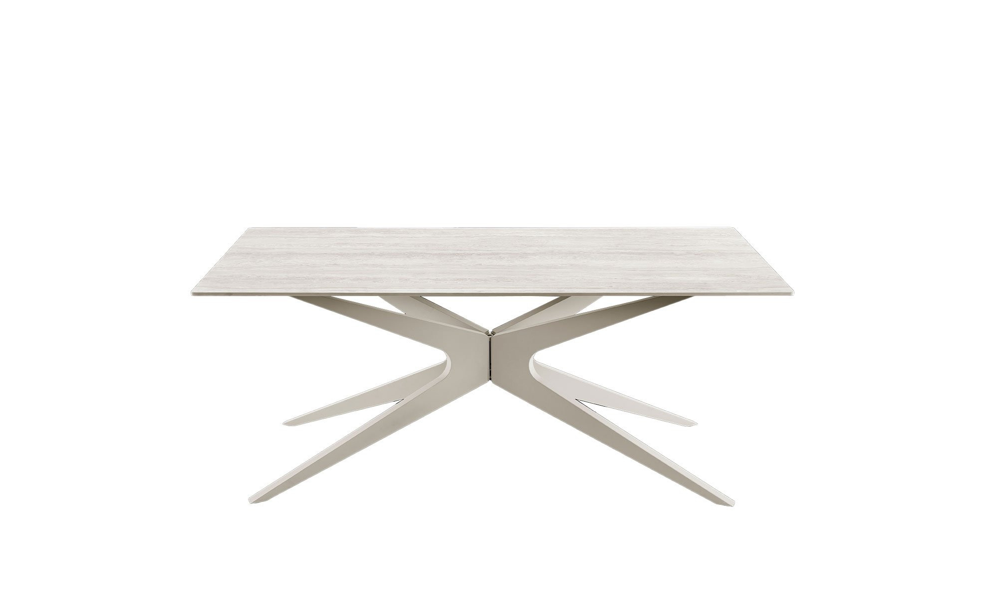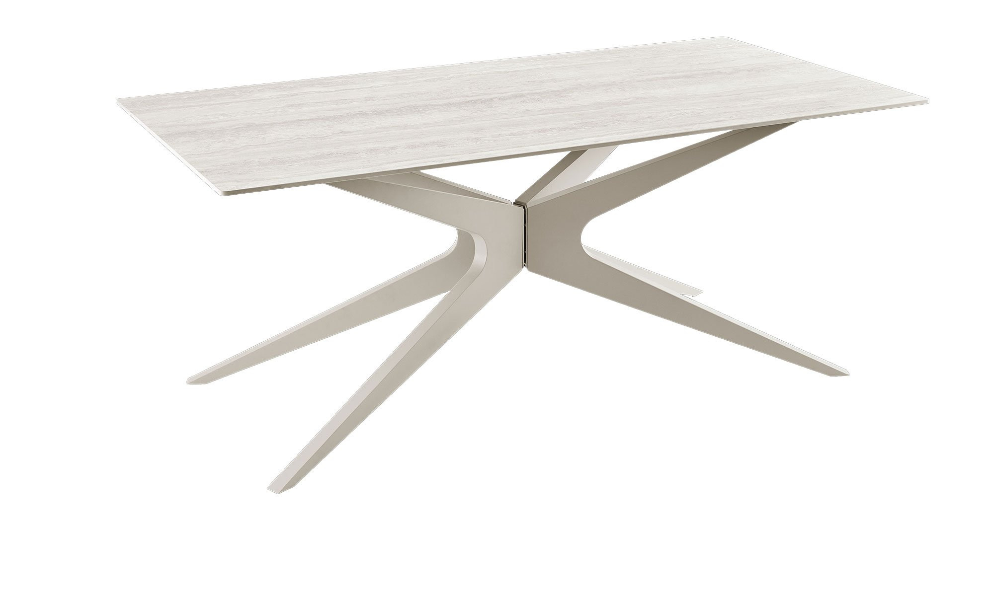 Das stabile Metallgestell in der Farbgebung Grau-Sand sorgt für einen sicheren Stand und überzeugt zugleich mit seinem besonderen, modernen Design. Die rechteckige Tischplatte aus weißer Keramik misst ca. 180 x 75 x 90 cm und bietet eine robuste sowie pflegeleichte Oberfläche für den täglichen Gebrauch.