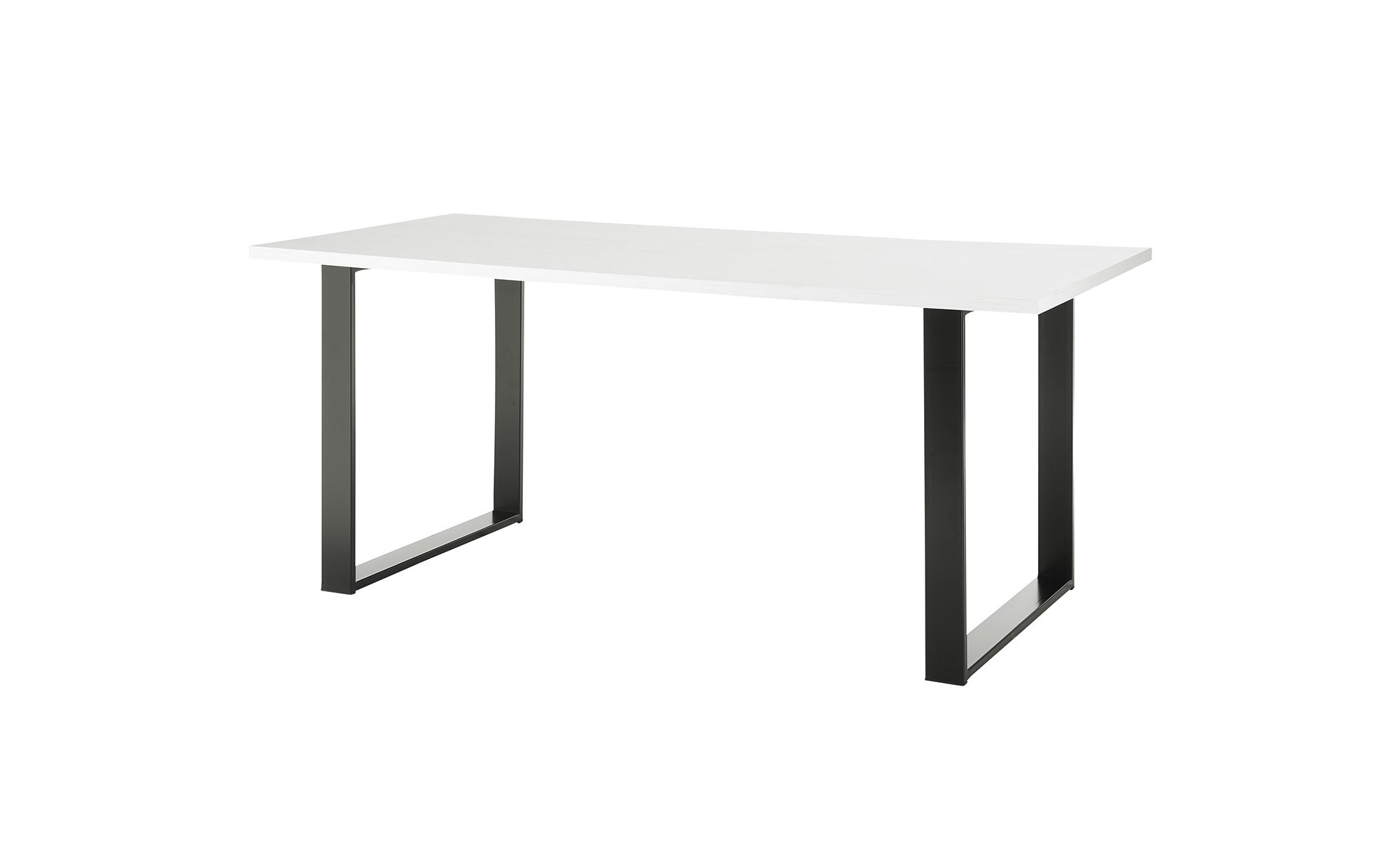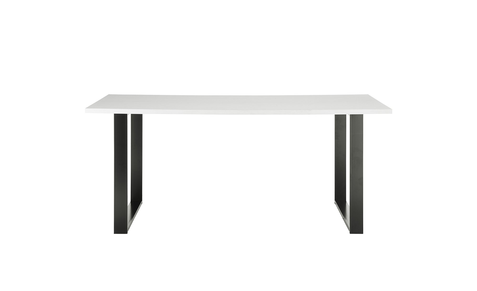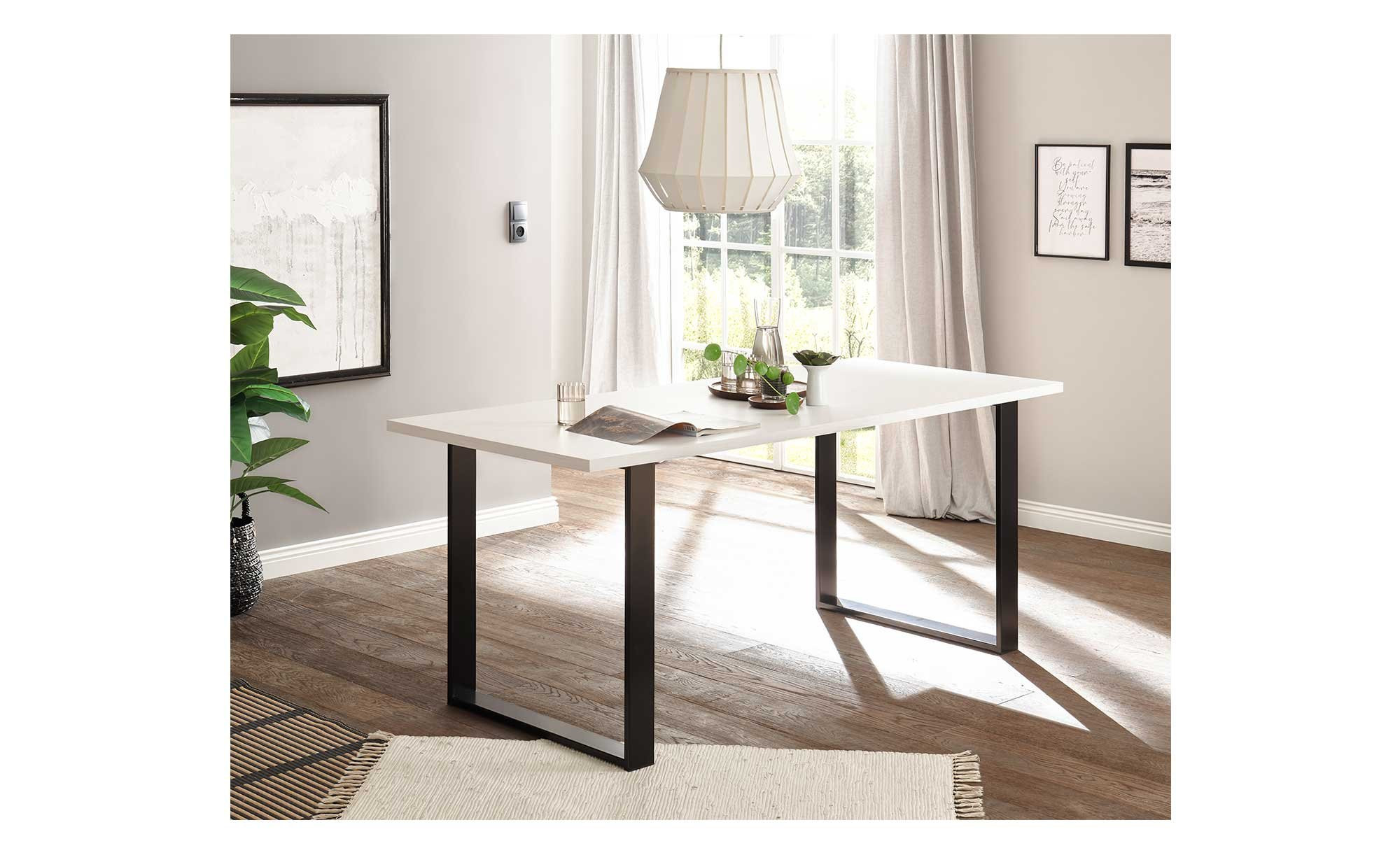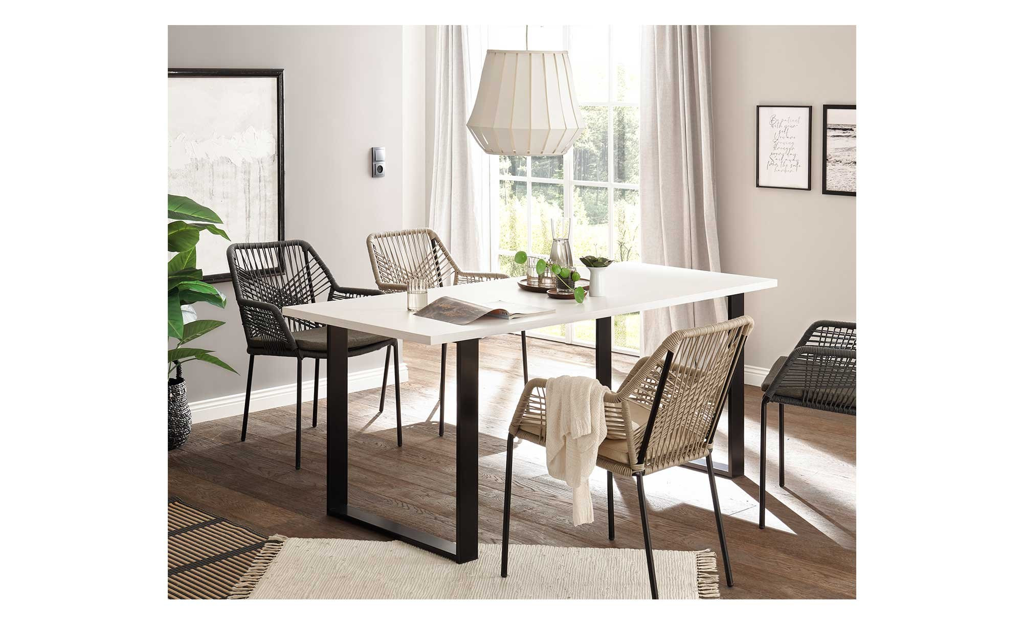 Die Tischplatte besteht aus Holzwerkstoff in attraktivem Pinie weiß-Dekor und ist mit einer strapazierfähigen Melaminbeschichtung versehen. Ein schwarzes Metallgestell in Kufenform verleiht dem Tisch Stabilität und einen modernen Look.