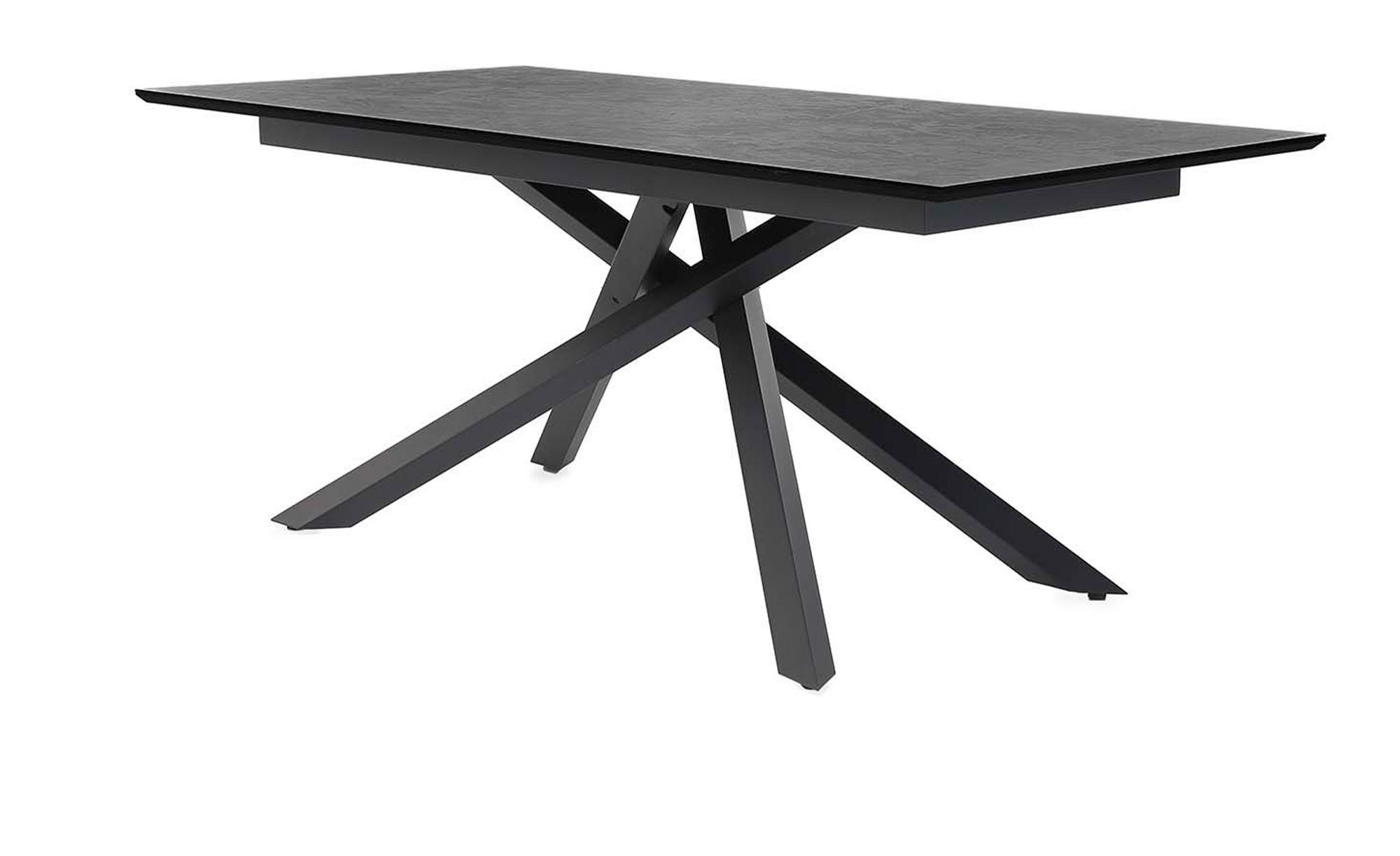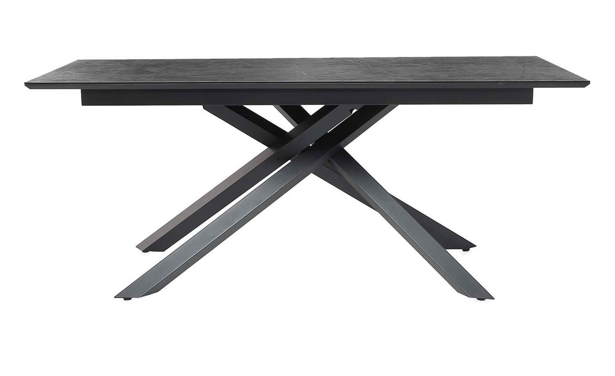 Die Platte des ca. 180 x 76 x 90 cm großen Tisches ist rechteckig und besteht aus ca. 2,5 cm starkem MDF-Holzwerkstoff. Bedruckt ist sie in einer anthrazitfarbigen Marmor-Optik und passt somit hervorragend zum sternförmigen Metallgestell in Schwarz.
