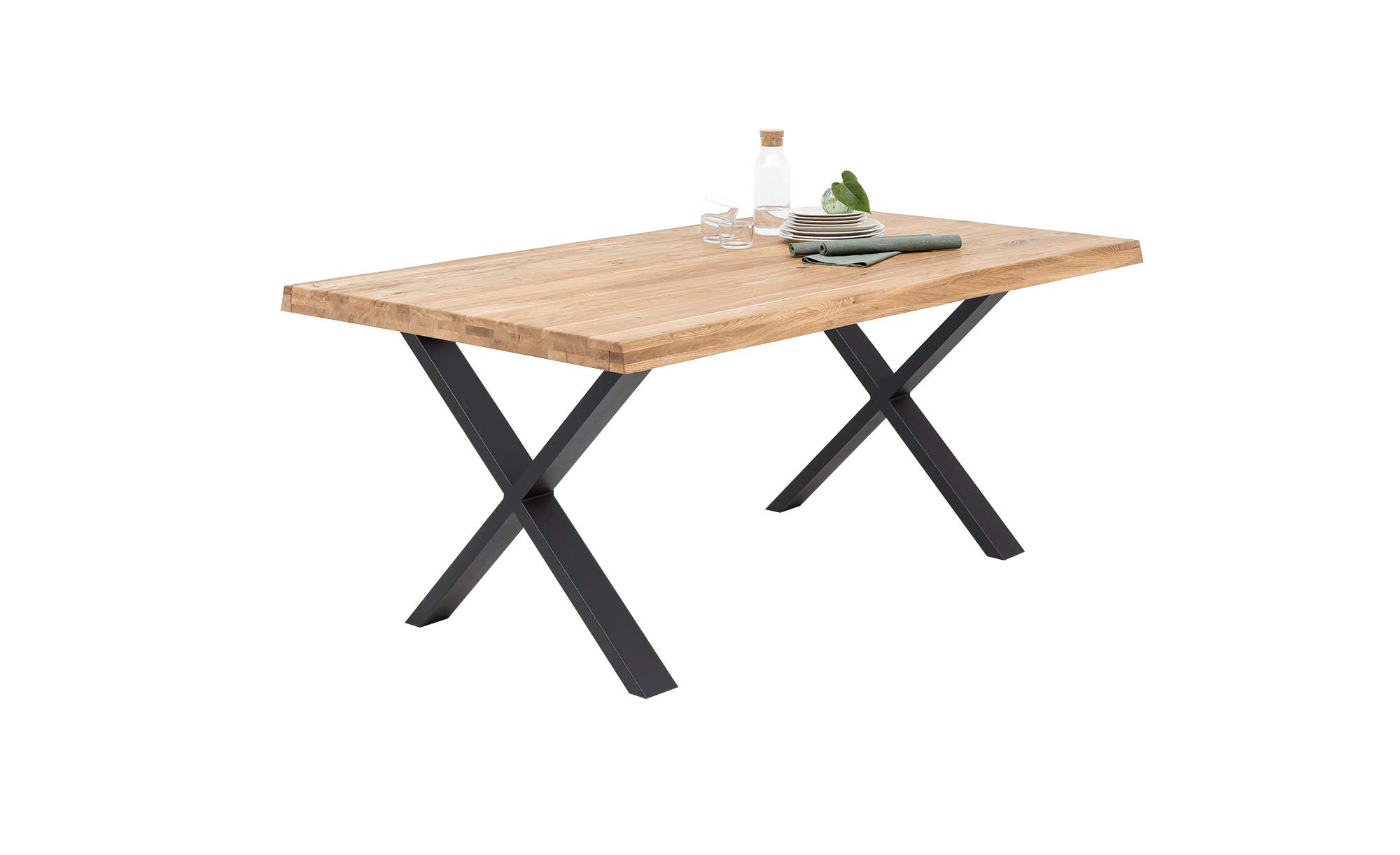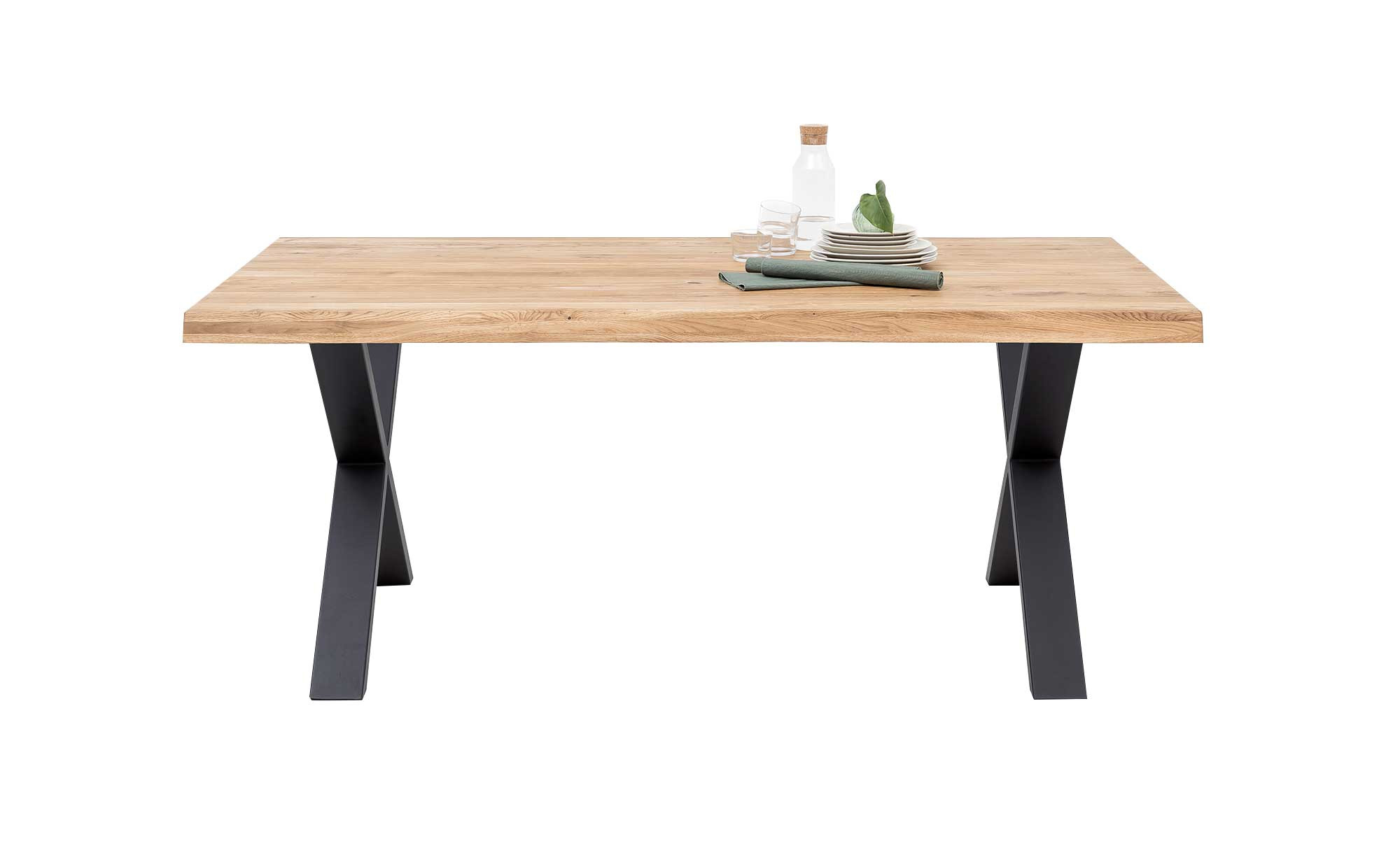 Getragen wird die Tischplatte von einem schwarzen Metallgestell mit X-Fuß, das für Stabilität und modernes Design sorgt. Durch die Kombination aus robustem Metall und hochwertigem Massivholz entsteht ein langlebiges Möbelstück, das zugleich stilvolle Akzente in Ihrem Essbereich setzt. Mit dem Esstisch vito Siga holen Sie sich ein naturnahes, raues Flair in Ihr Zuhause, das Funktionalität und Design perfekt vereint.