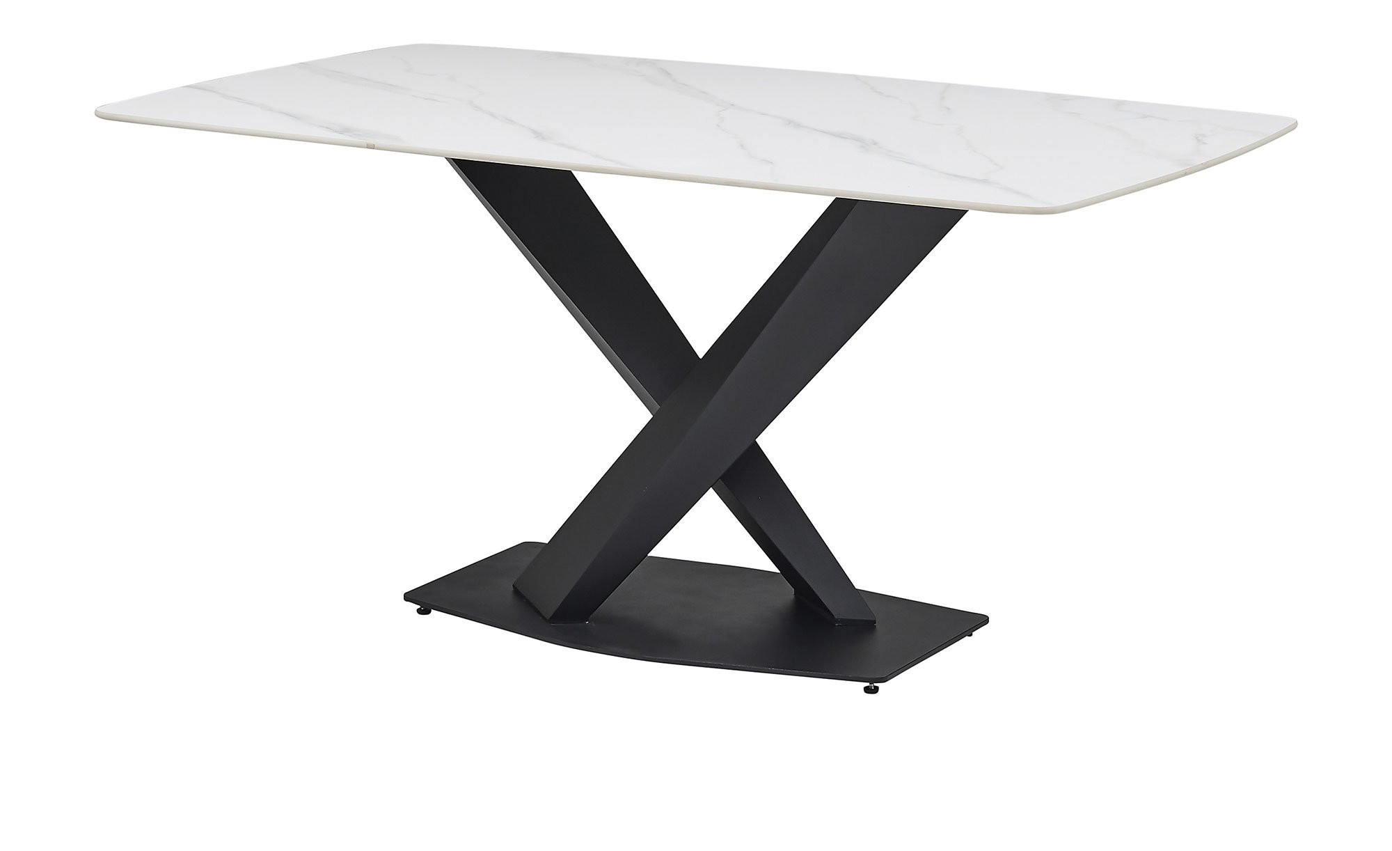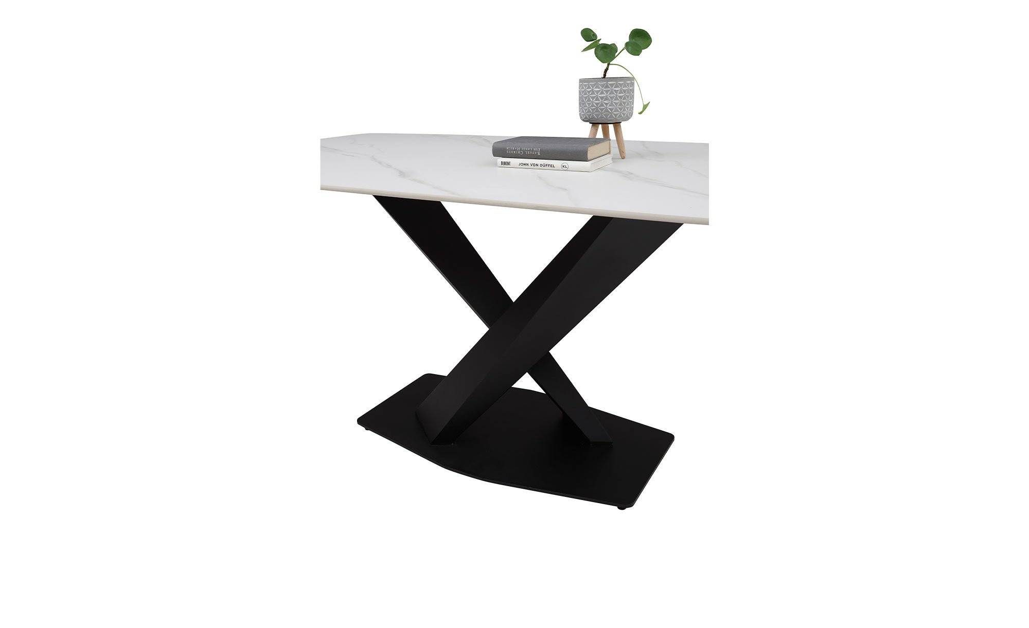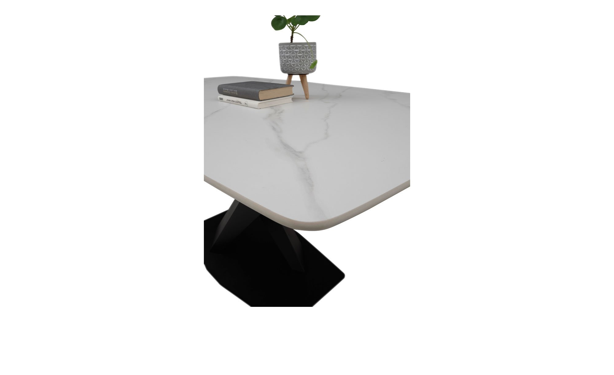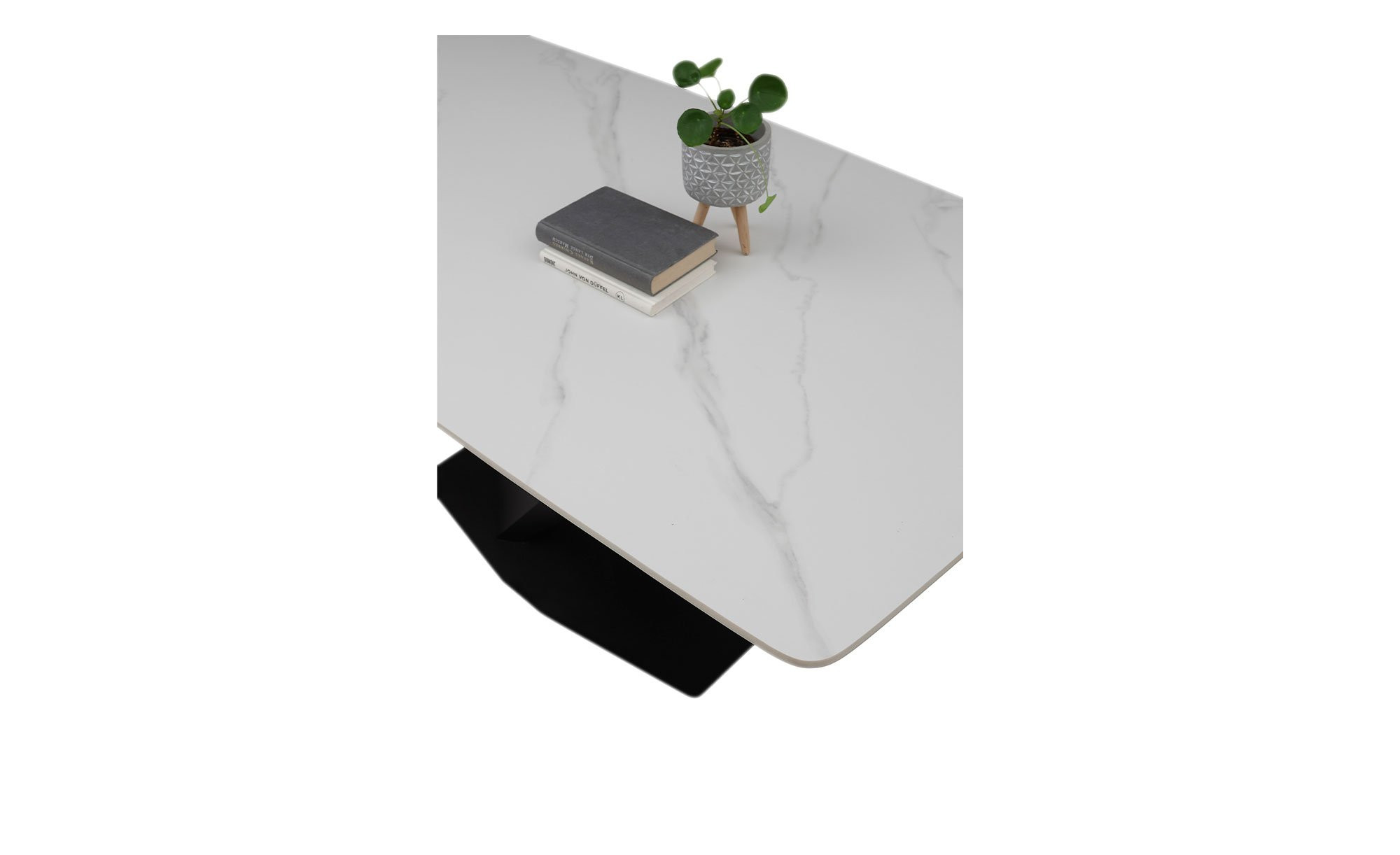 Auf einem schwarzen Metallgestell samt Bodenplatte verfügt der ca. 180 x 75 x 90 cm umfassende Artikel über eine besonders ansprechende Tischplatte. Sie ist rechteckig und besteht aus Keramik in weißer Marmorierung.