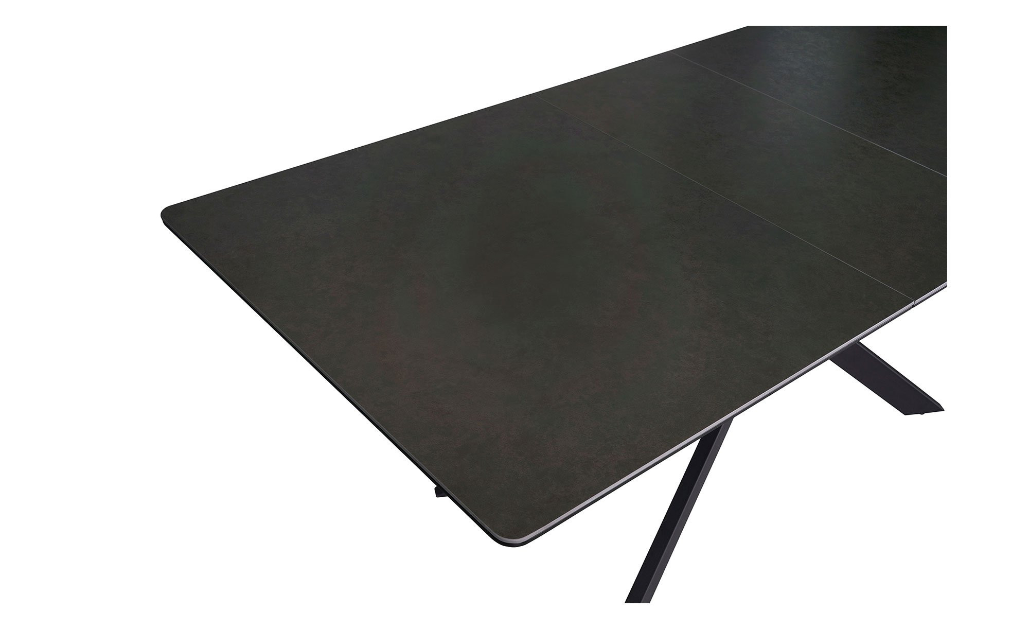 Das Möbelstück verfügt über ein pulverbeschichtetes Gestell aus schwarzem Eisenrohr. Dieses trägt die rechteckige Platte, die aus MDF mit einer Auflage aus ca. 6 mm starker chinesischer Keramik in Dunkelgrau gefertigt wurde.