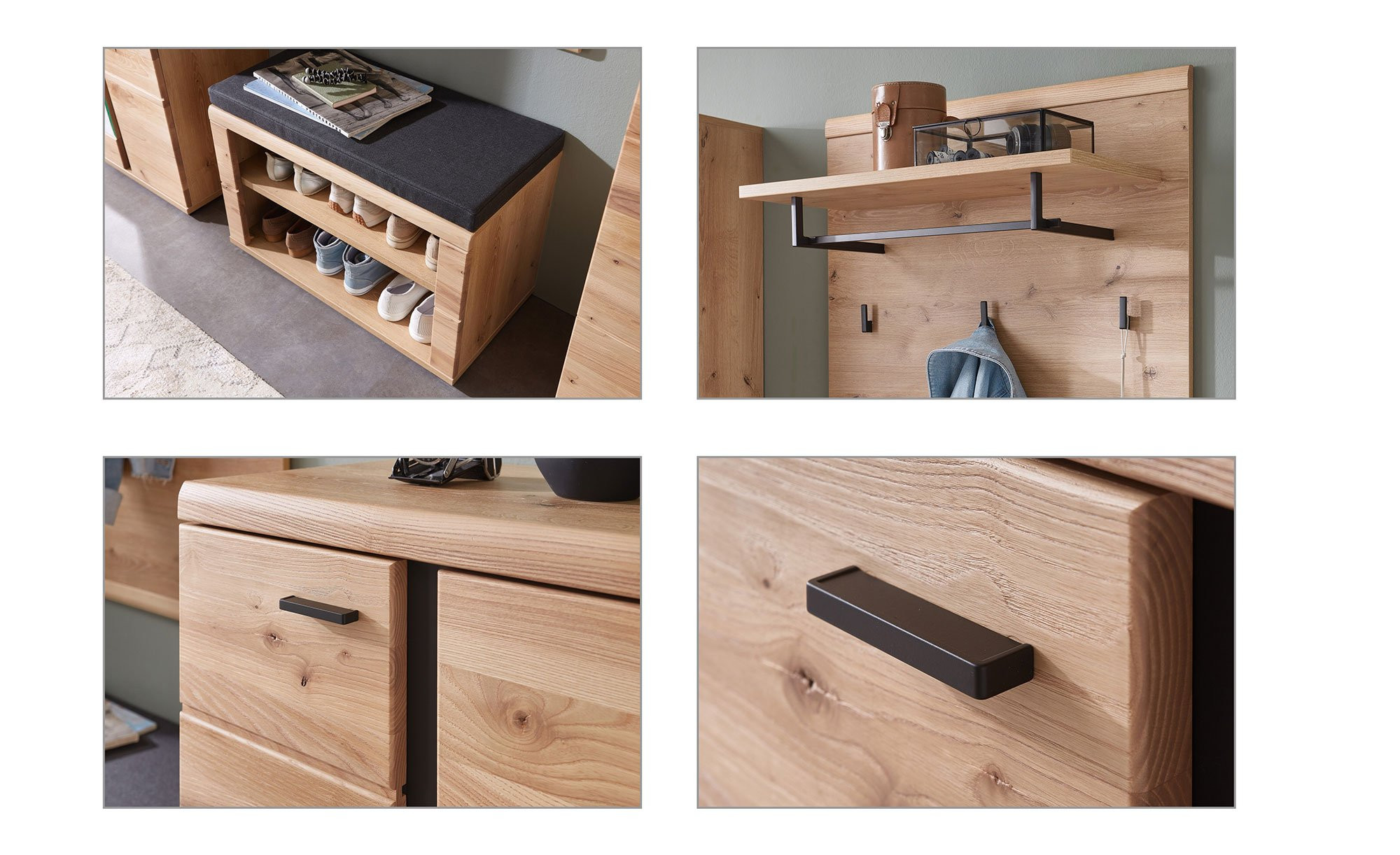 An der Front des ca. 80 x 120 x 30 cm großen Möbelstücks erwartet Sie gebürstete Altesche. Das massive Holz besteht aus einer durchgehenden Lamelle und ist mit fünf schwarzen Haken aus Metall sowie einer Garderobenstange ausgestattet. Zusätzlich gibt es eine Hutablage für Ihre Kopfbedeckung.