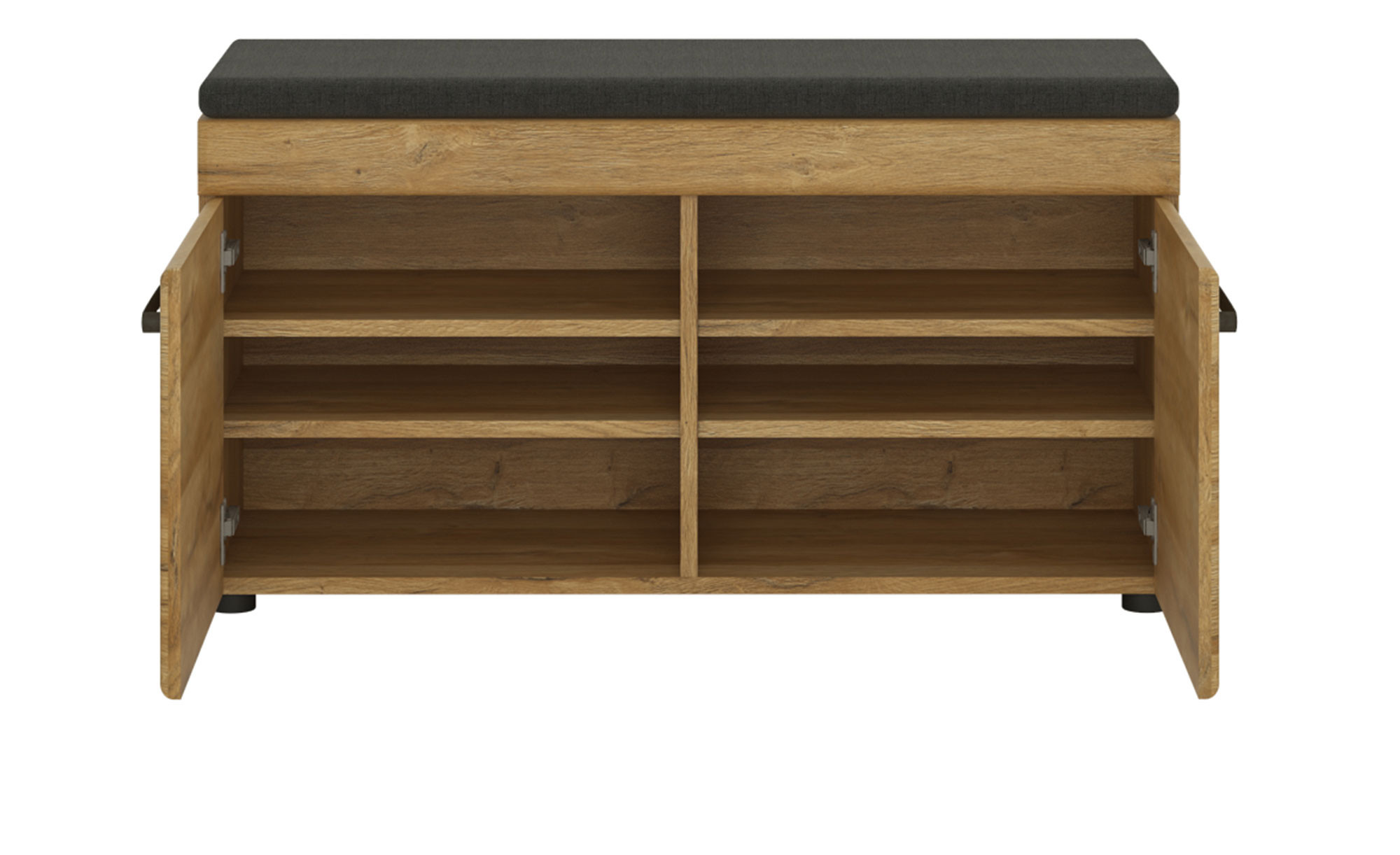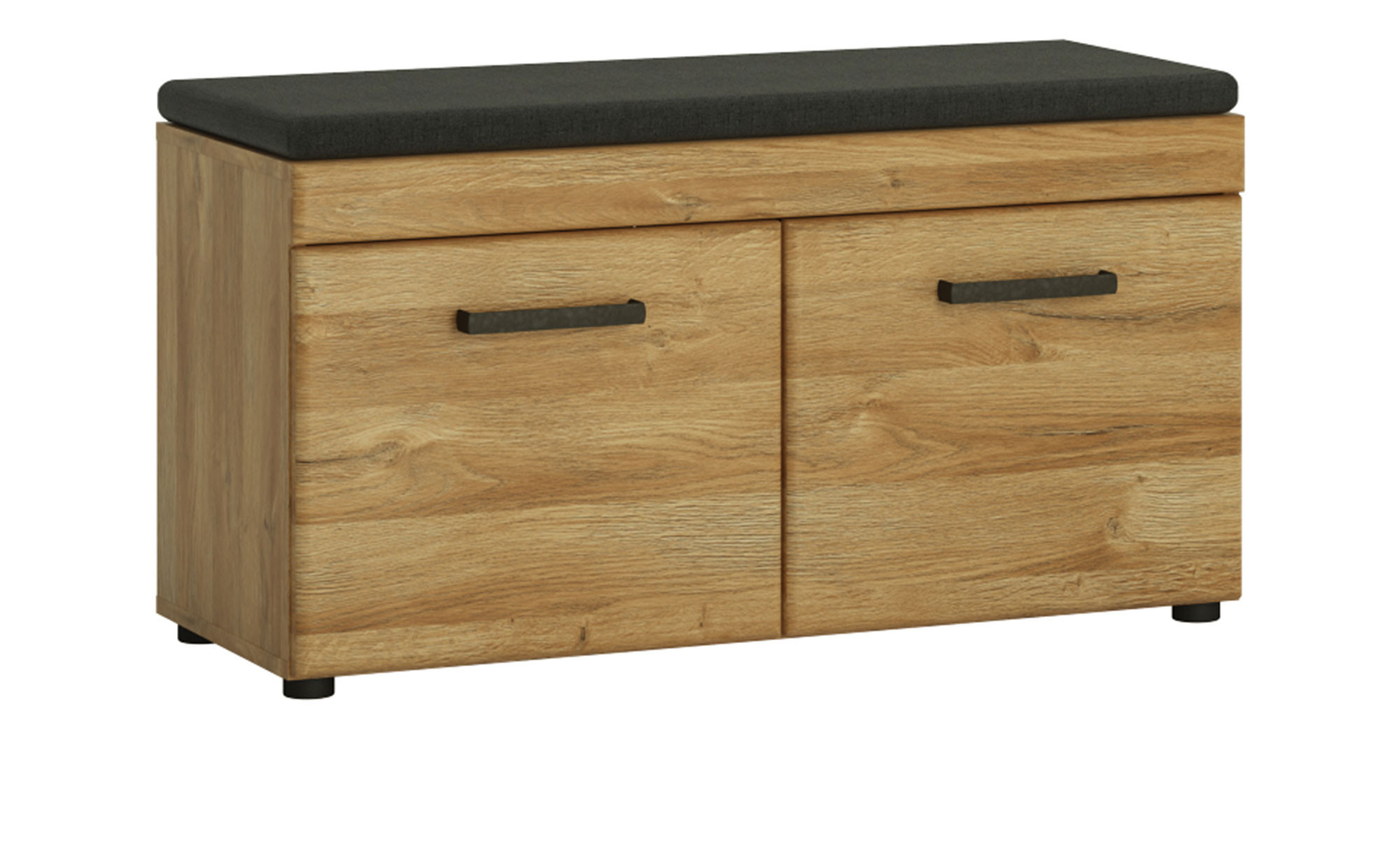 Front und Korpus der ca. 93 x 47 x 38 cm großen Bank wurden jeweils im natürlich wirkenden Dekor Grandson Eiche gestaltet. Innen und an der Rückwand findet sich hingegen ein Wotan Eiche-Look. Schwarze Füße aus Kunststoff und der Antik Zinn-Stil der Metallgriffe runden das Bild ab.