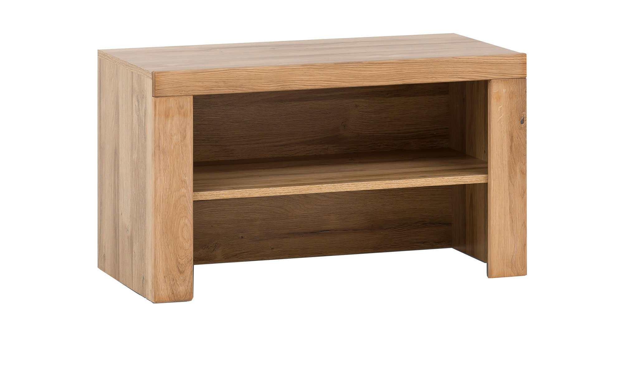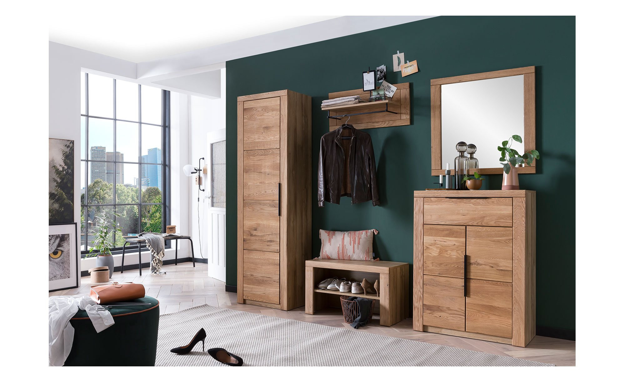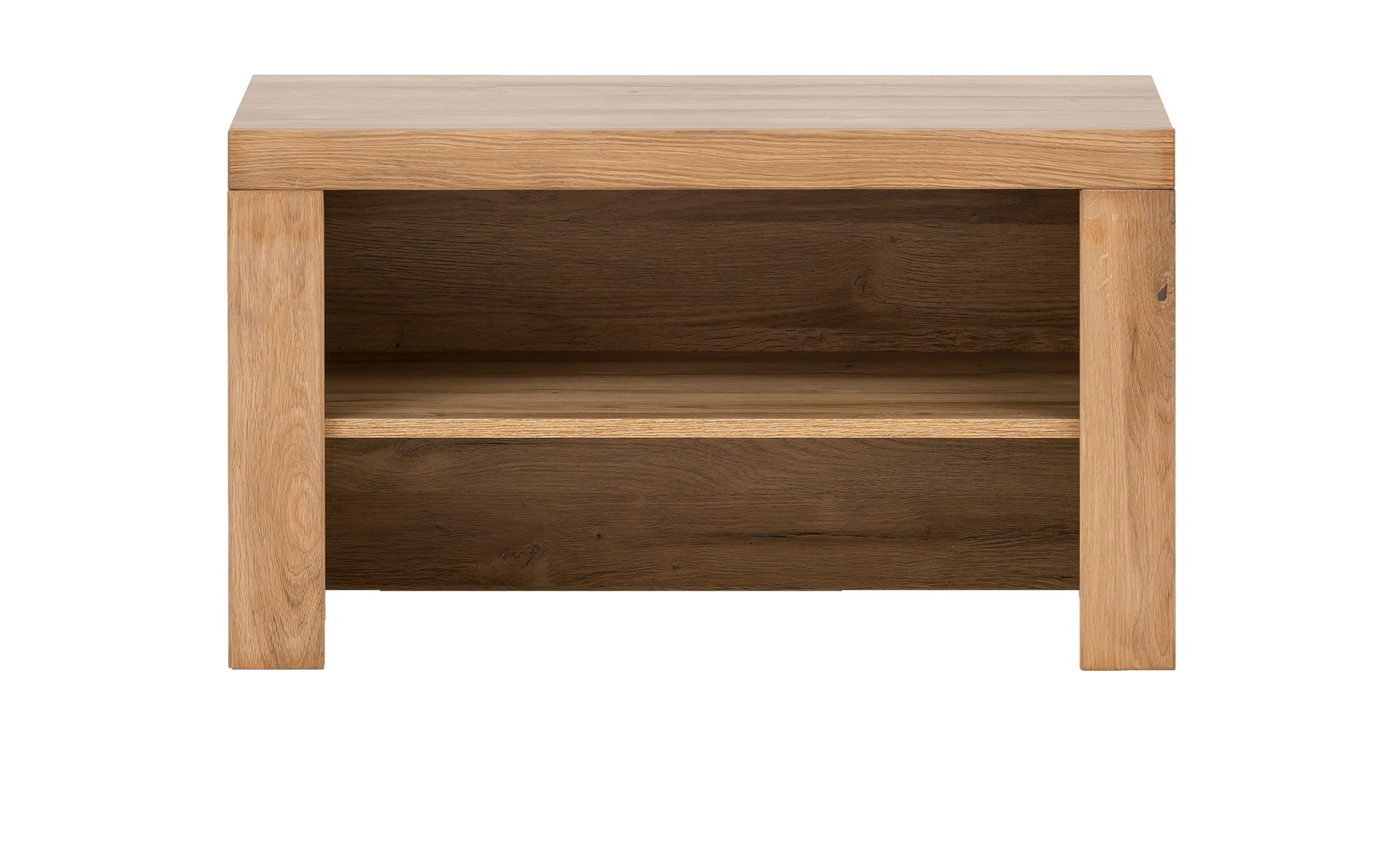 Die rustikale Optik verdankt die teilmassive Bank ihrem Trendholz Eiche-Look. Sie verfügt über einen Korpus und eine Rückwand aus Holzwerkstoff im Dekor Eiche sowie über massive, geölte Eiche-Fronten mit durchgehenden Lamellen. Auch das Innendekor ist eichefarben.