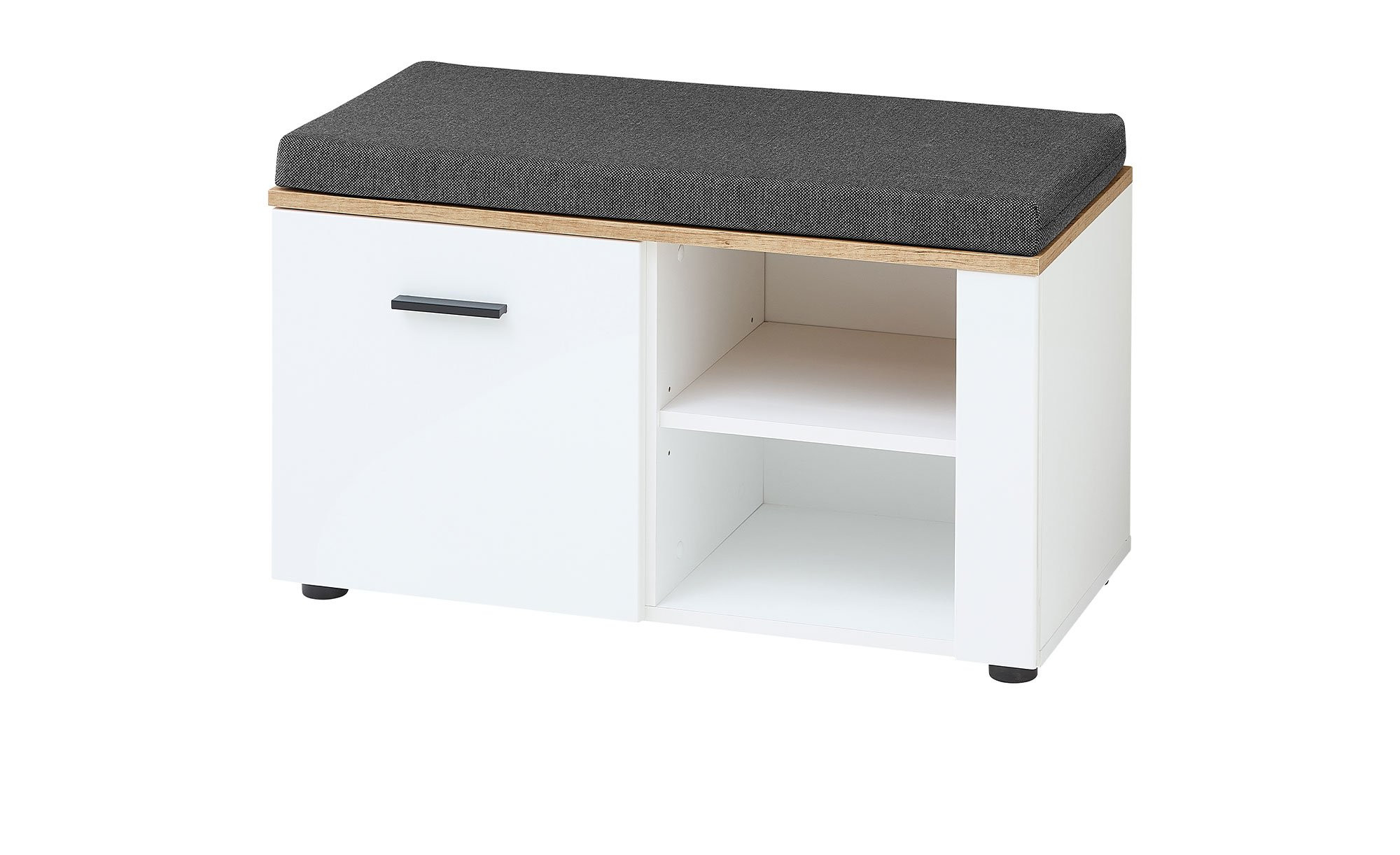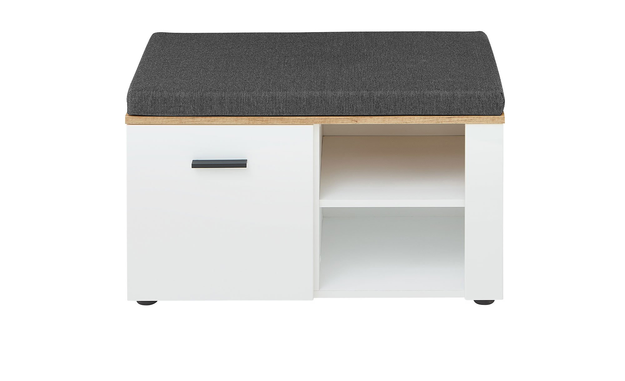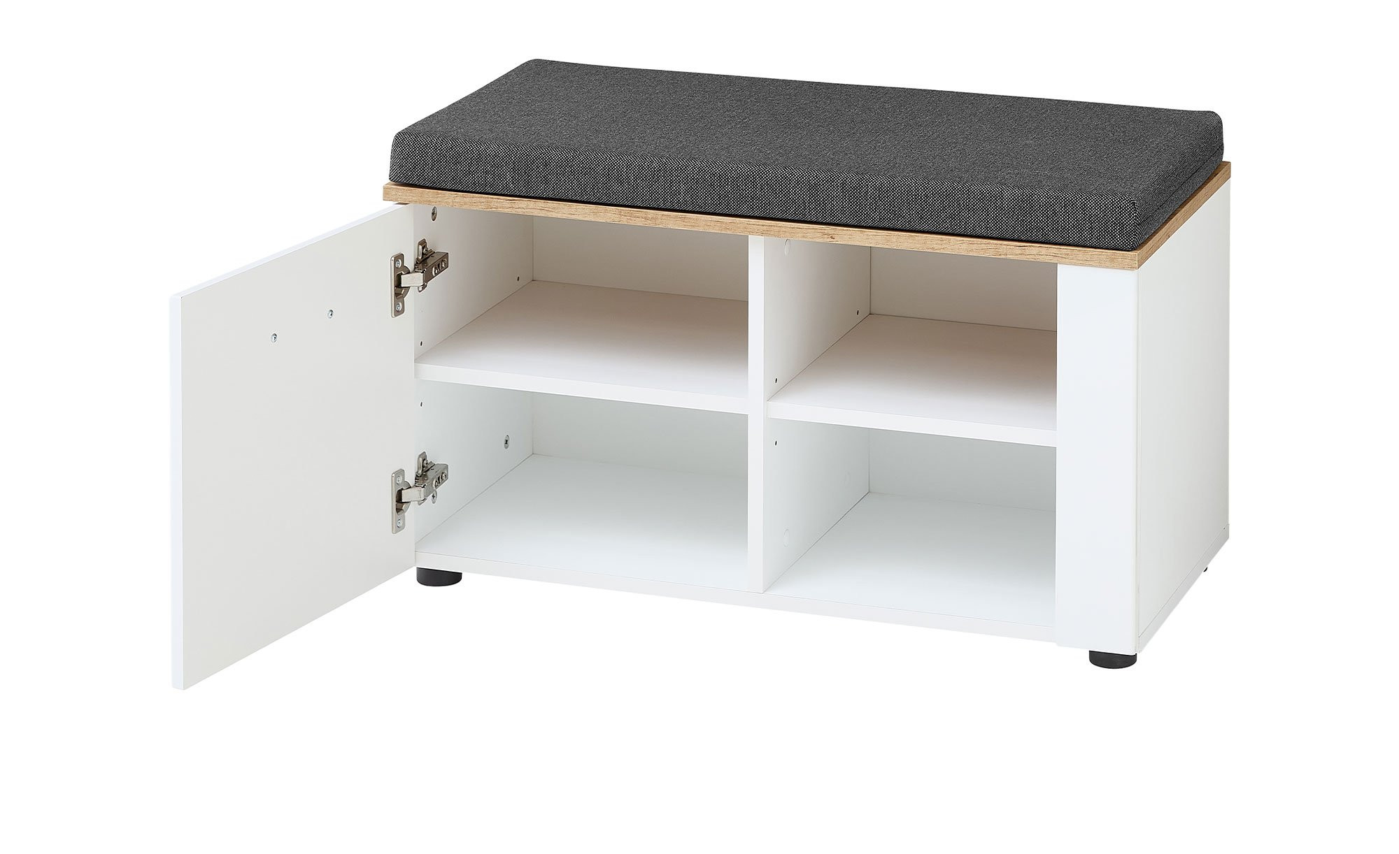 Für Unterbringungsmöglichkeiten sorgen Fächer hinter einer gedämpften Tür und zwei offene Fächer. Außerdem ist ein Sitzkissen mit Schaumstofffüllung aus 100 % Polyurethan im Angebot enthalten. Sein anthrazitfarbiger Bezug besteht aus robustem Polyester.