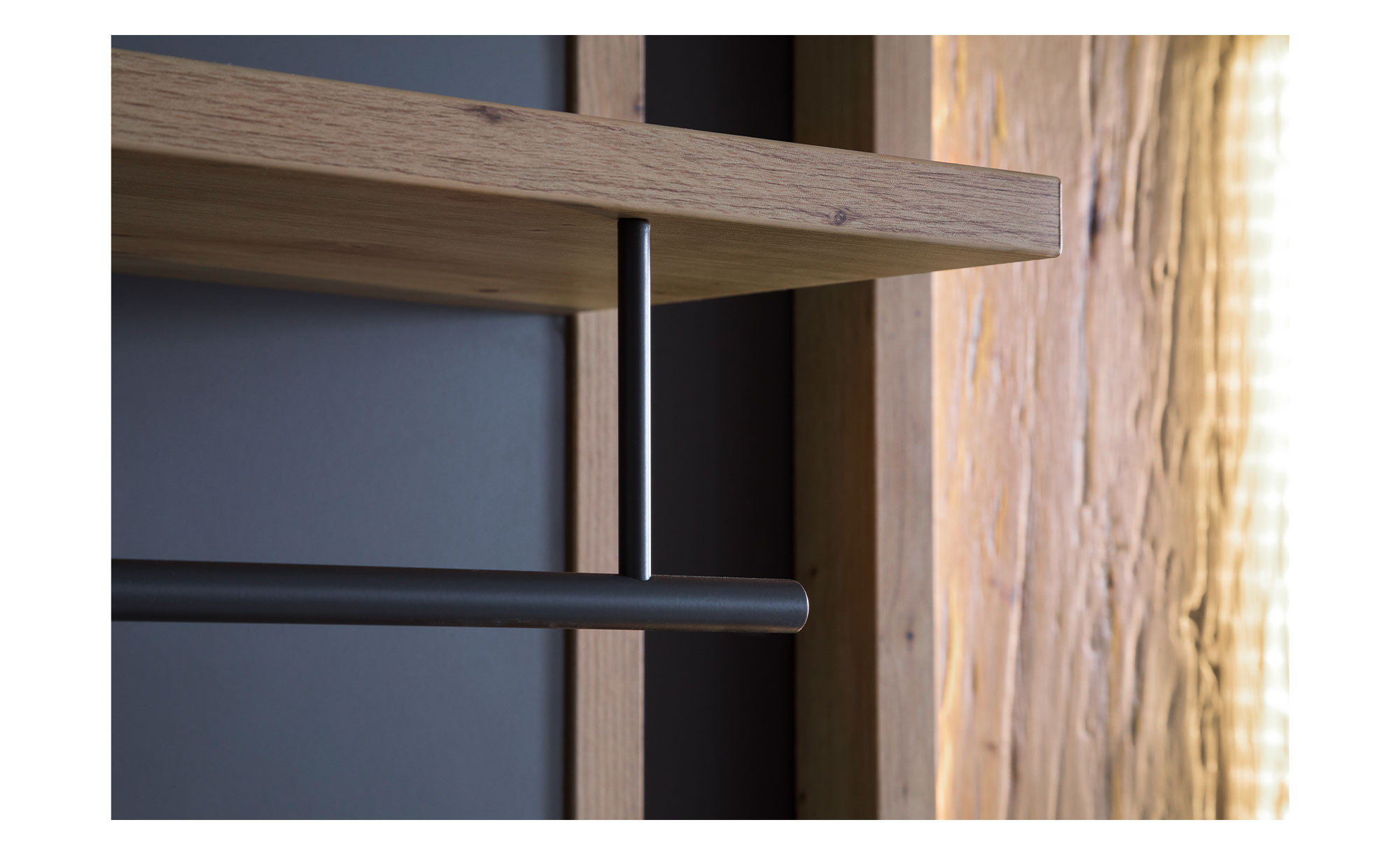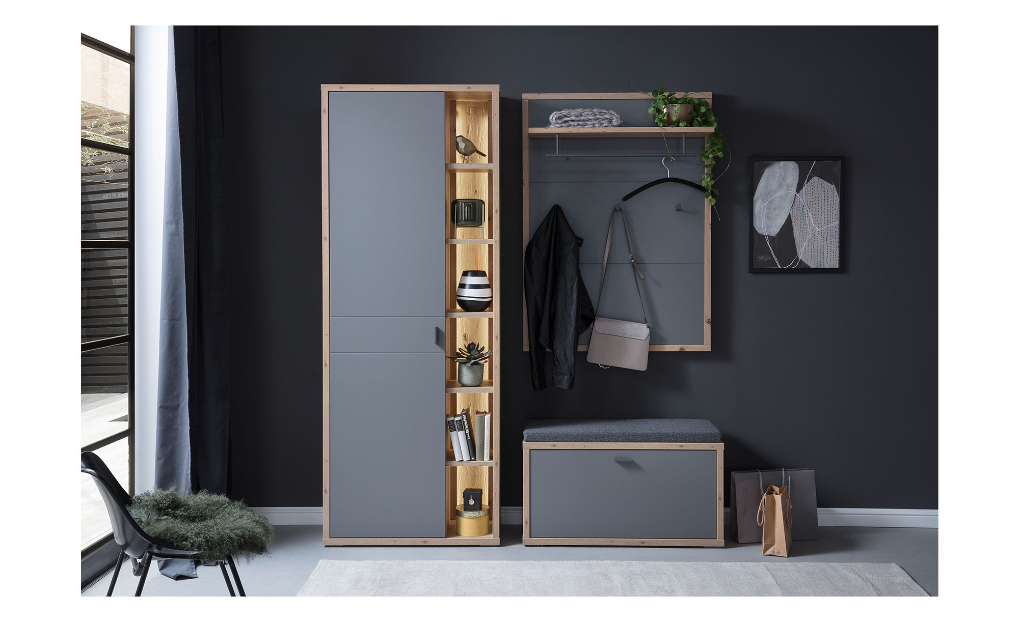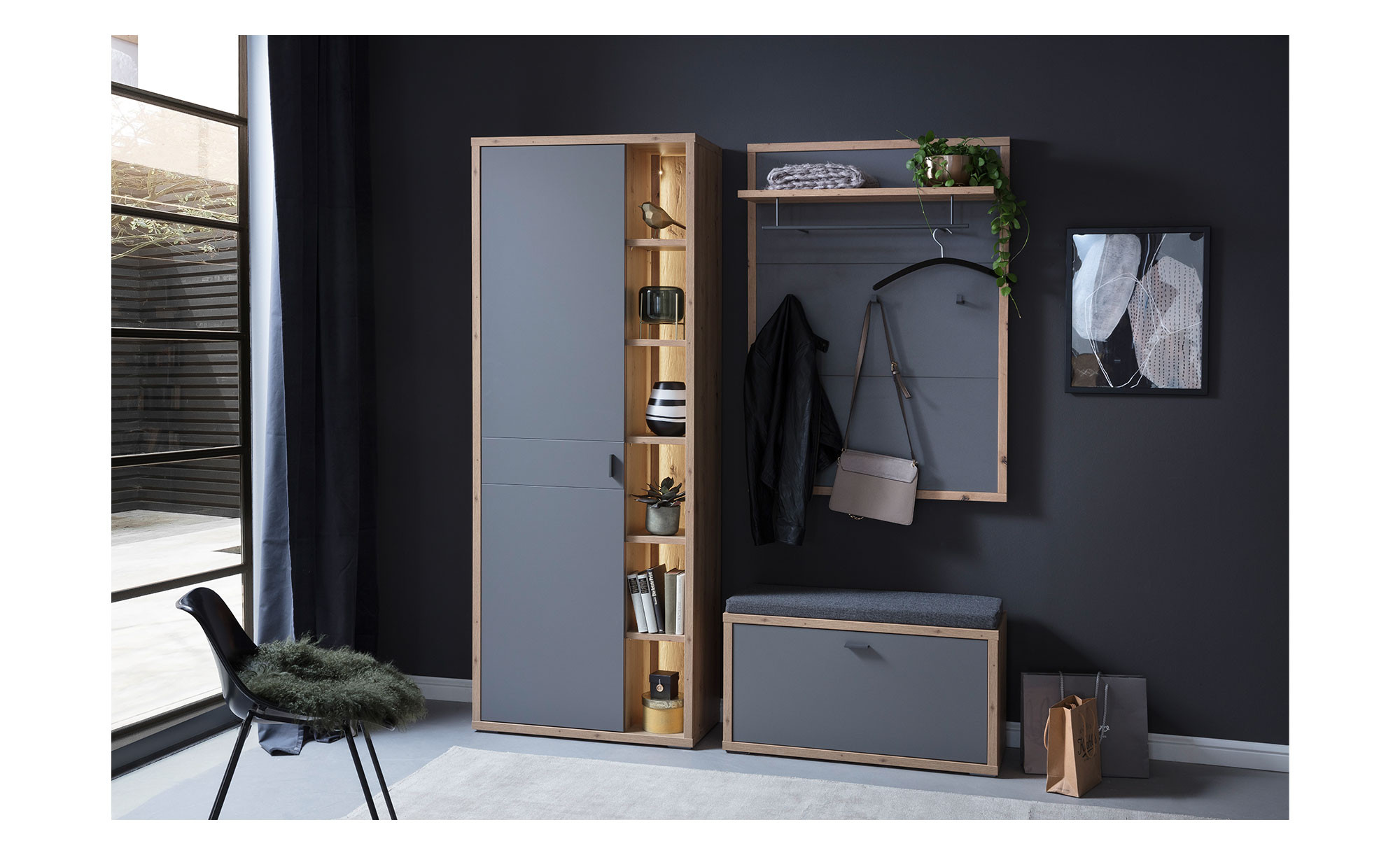 Zum ca. 86 x 118 x 32 cm großen Paneel gehören zusätzlich eine Hutablage und eine schwarzgraue Kleiderstange. Außerdem wurden drei praktische Haken integriert.