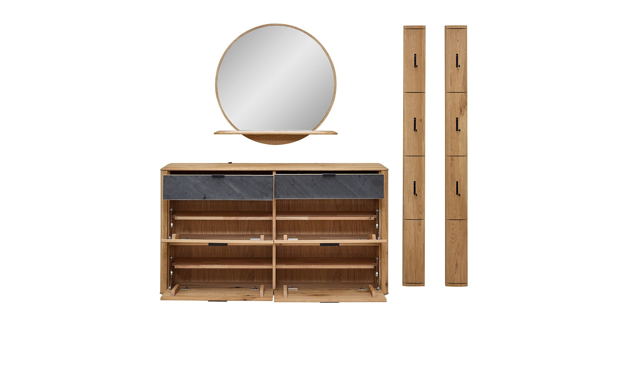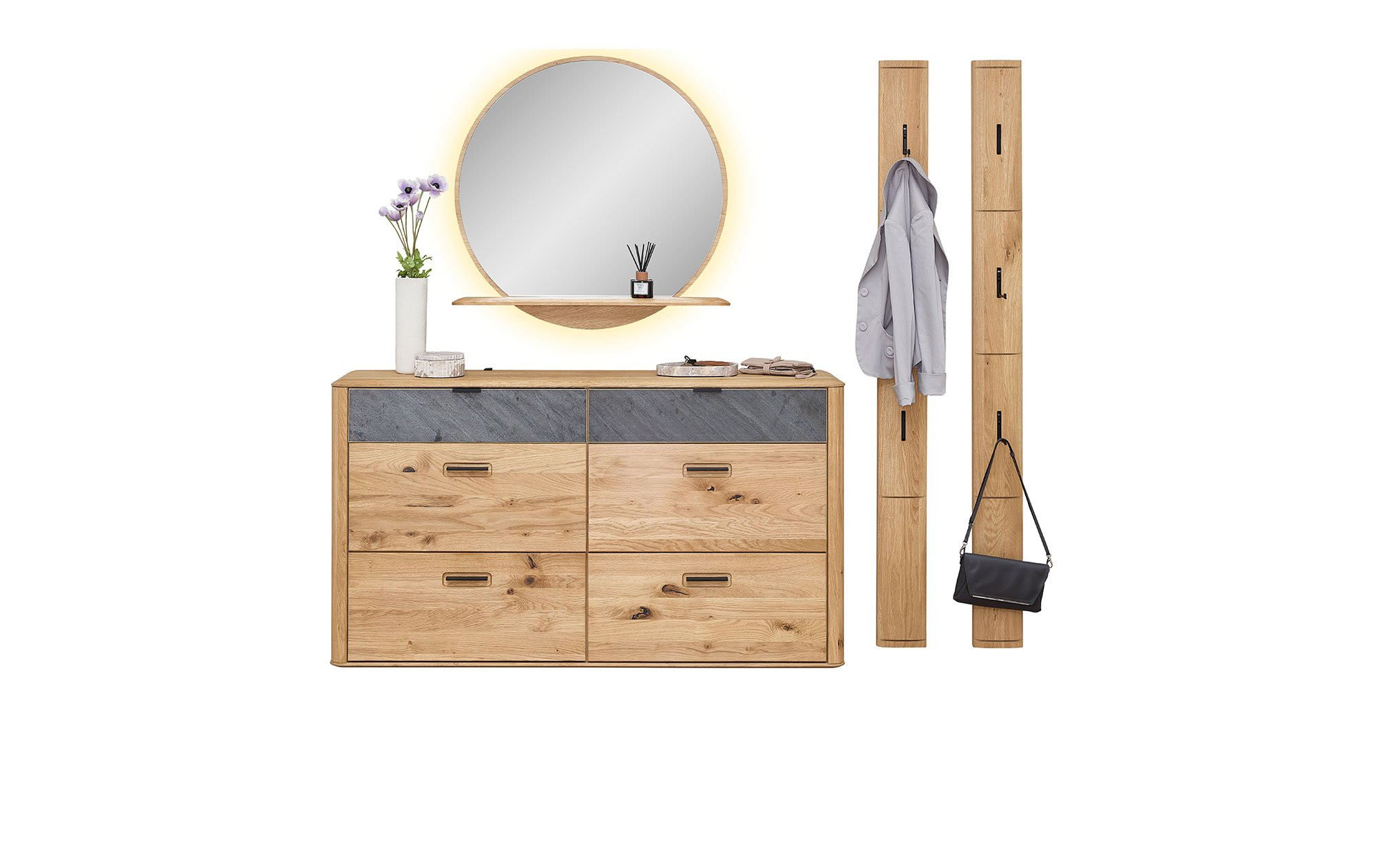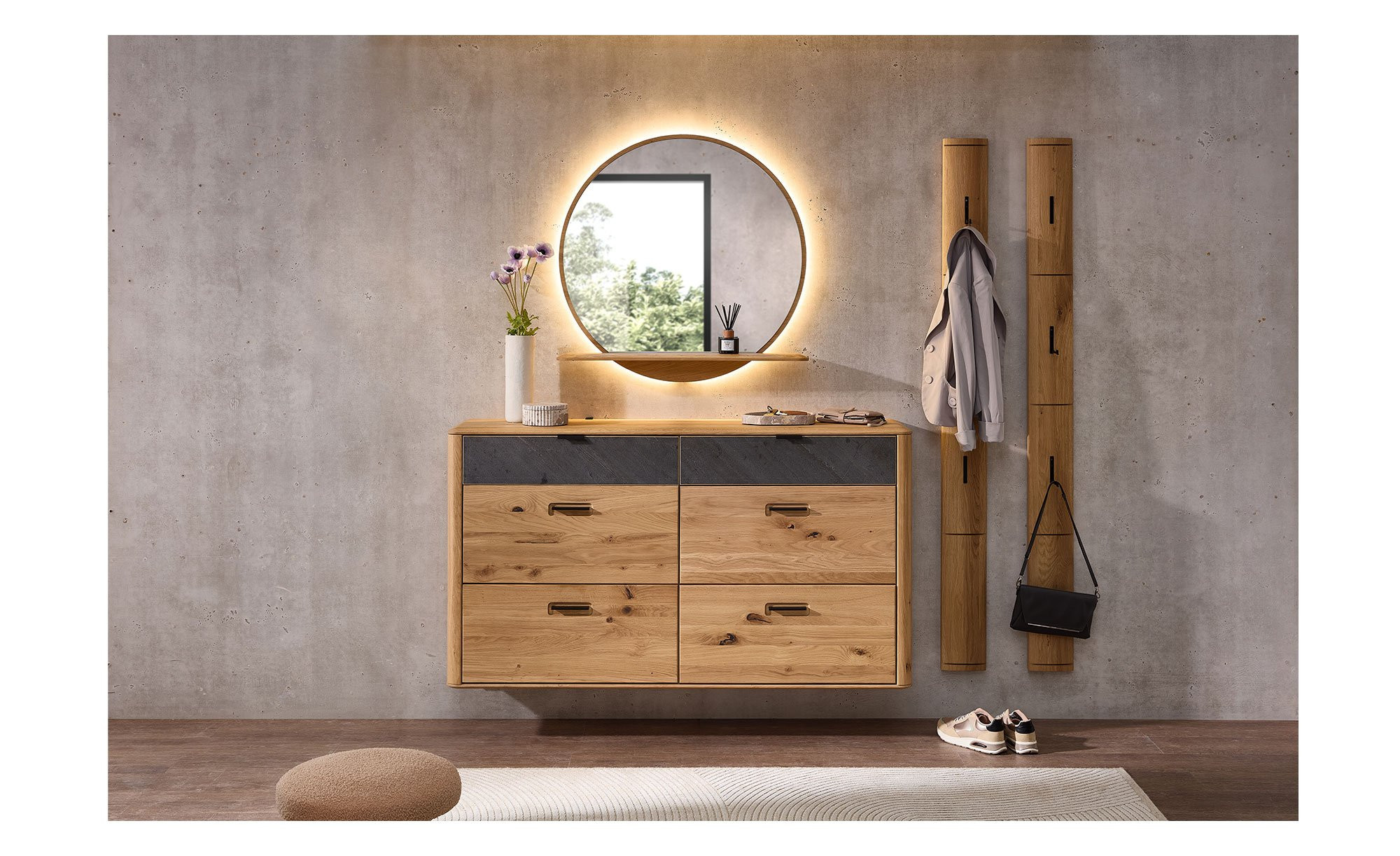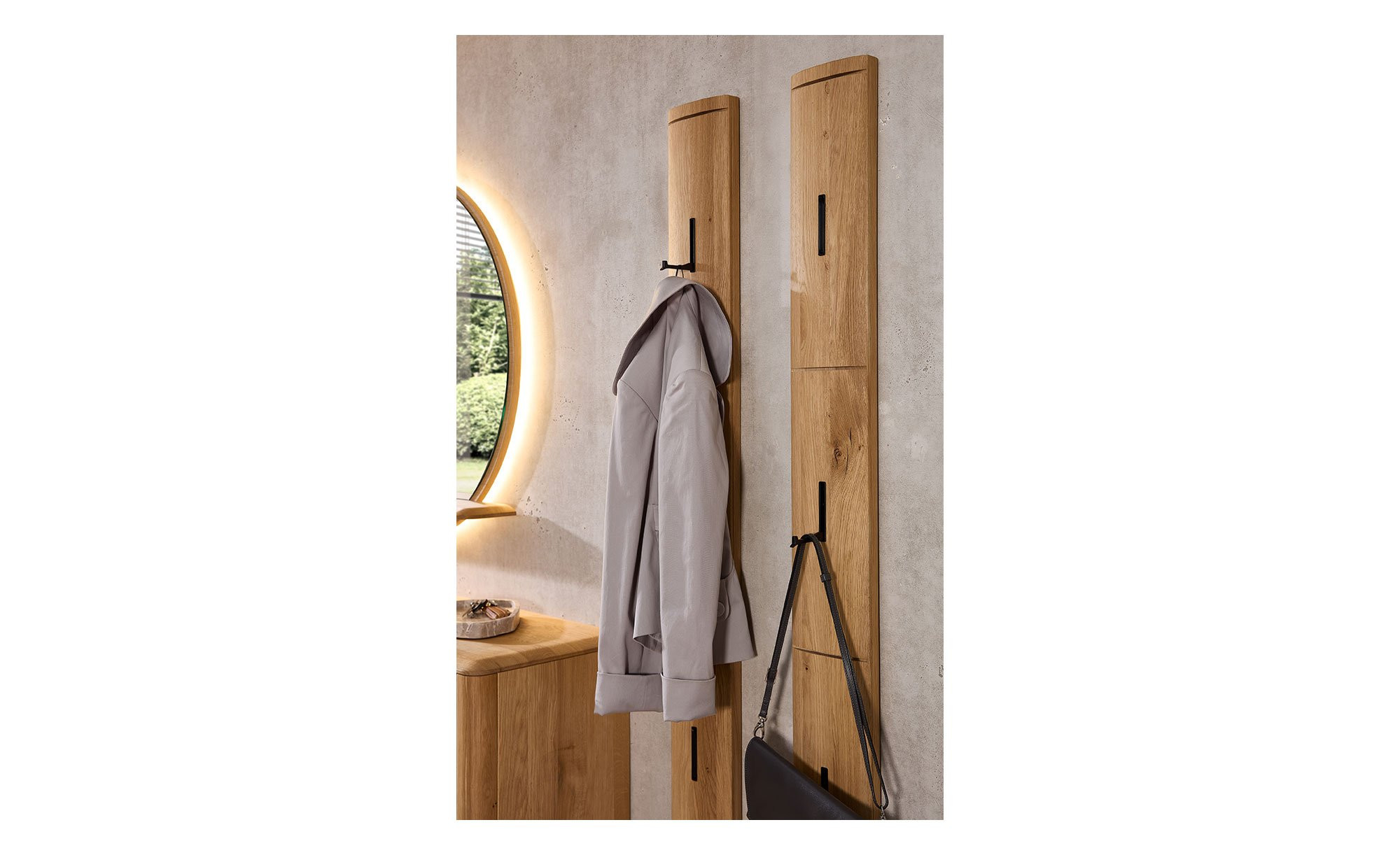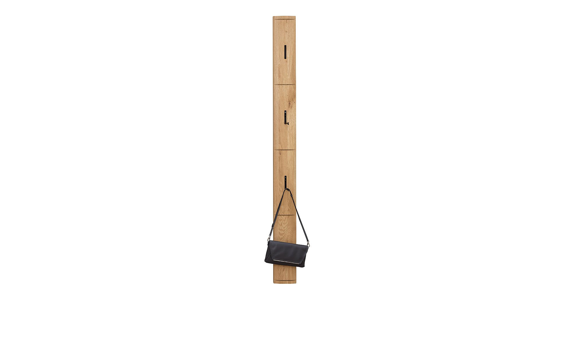 Die Front des ca. 15 x 180 x 17 cm großen Artikels besteht aus massiver Wildeiche mit einer durchgehenden Lamelle. Drei integrierte Klapphaken sorgen für unterschiedlich hohe Aufhänge-Optionen und ein modernes Design.