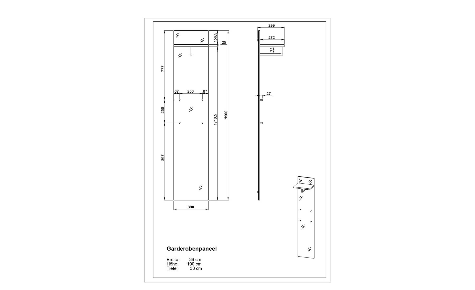 Neben (bzw. über) den vier Kleiderhaken und einer Kleiderstange verfügt das ca. 39 x 190 x 30 cm große Garderobenpaneel vito Siriano auch über eine praktische Hutablage.
