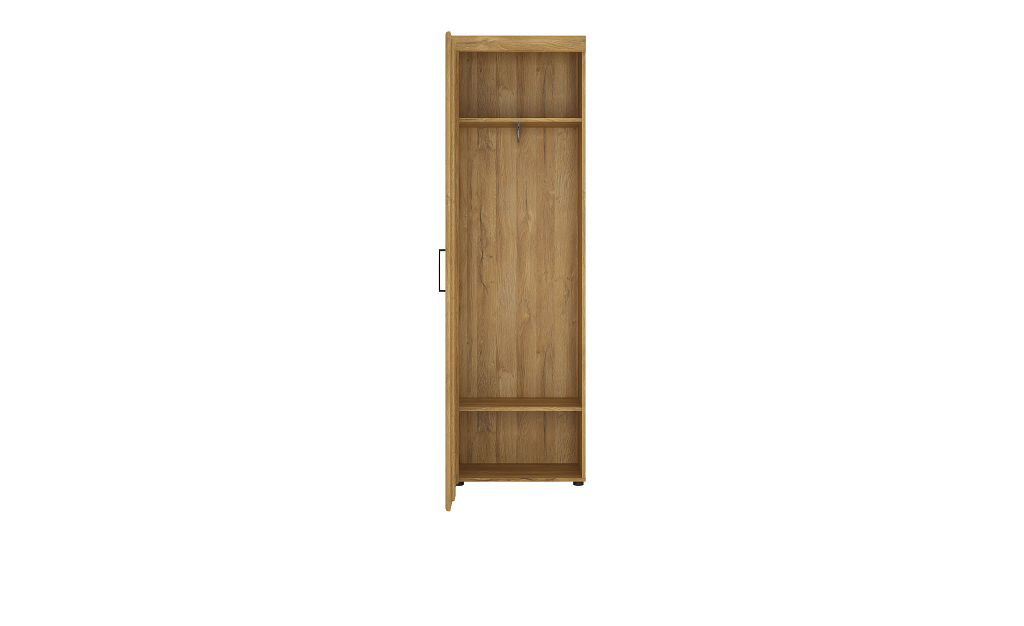 Zum ca. 58 x 195 x 37 cm großen Schrank gehört eine gedämpfte Tür mit linksseitigem Anschlag. Im Innern des Möbels erwarten Sie eine Kleiderstange, zwei Böden und somit drei Fächer.