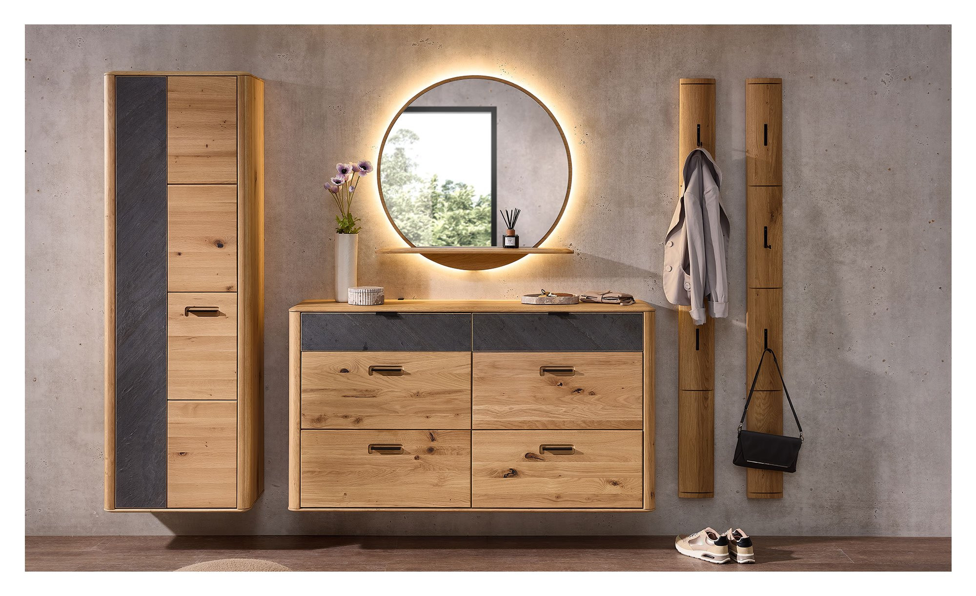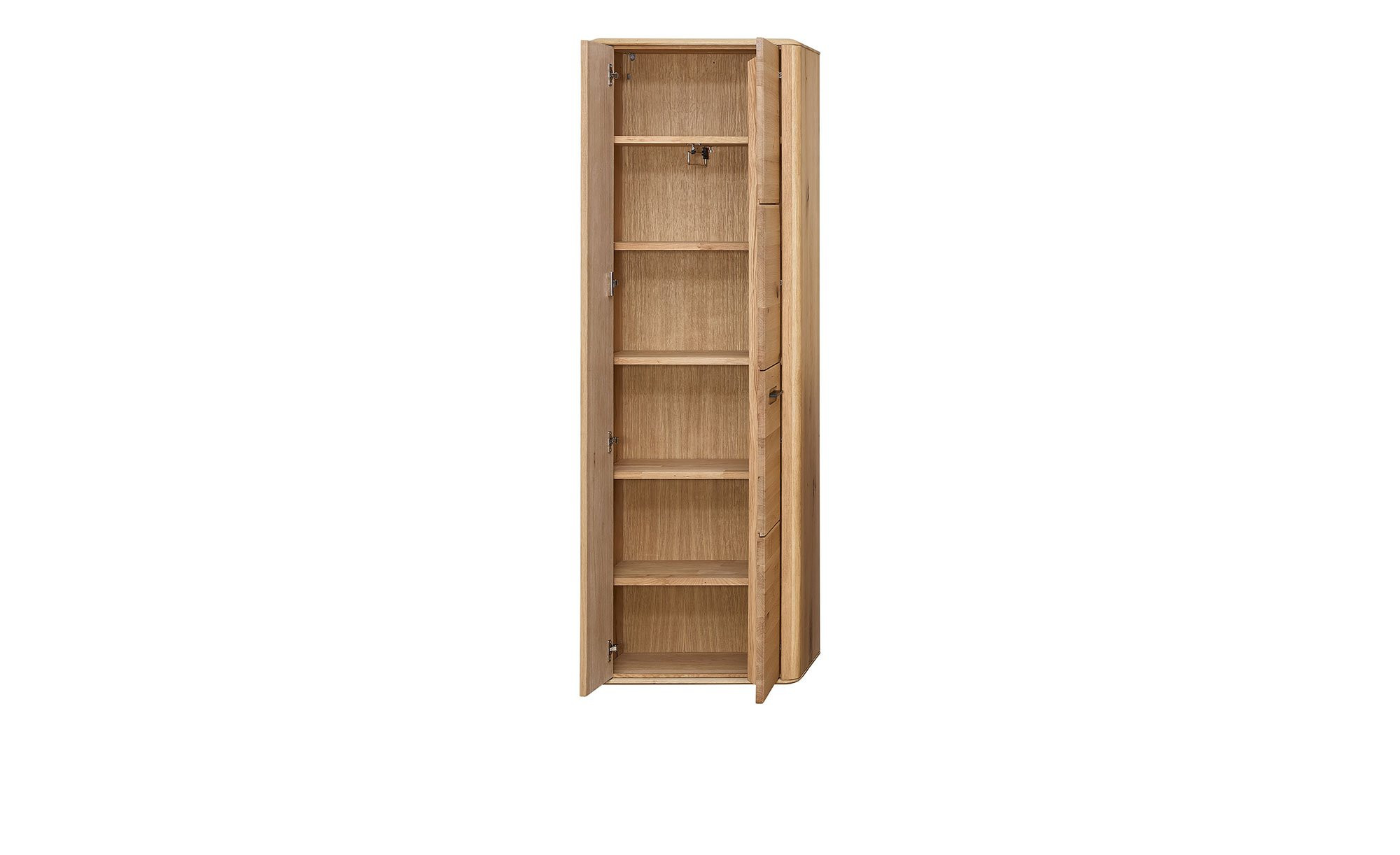 Front und Korpus des ca. 60 x 180 x 34 cm großen Möbelstücks wurden aus massiver Wildeiche gefertigt. Deren herrlich natürlicher Charme wird durch eine Absetzung in Form eines Granit-Stein Furniers gelungen kontrastiert. Jede Menge Stauraum bietet sich Ihnen hinter den beiden gedämpften Türen des Artikels. Hier erwarten Sie fünf Böden und eine ausziehbare Kleiderstange.