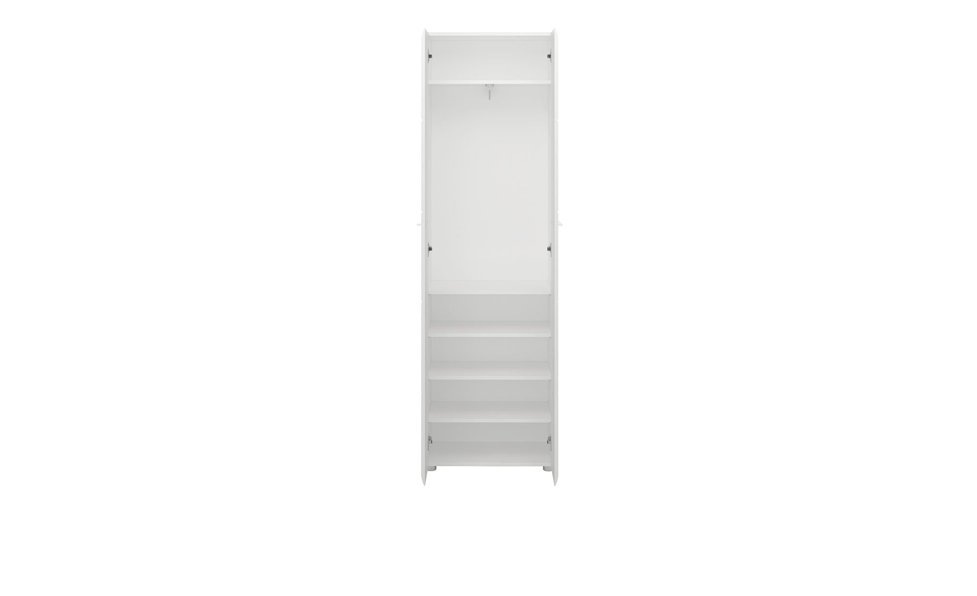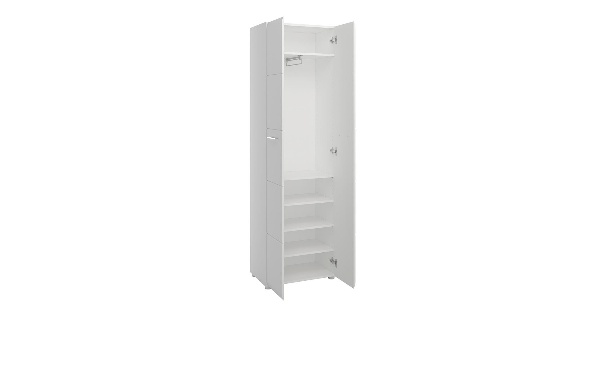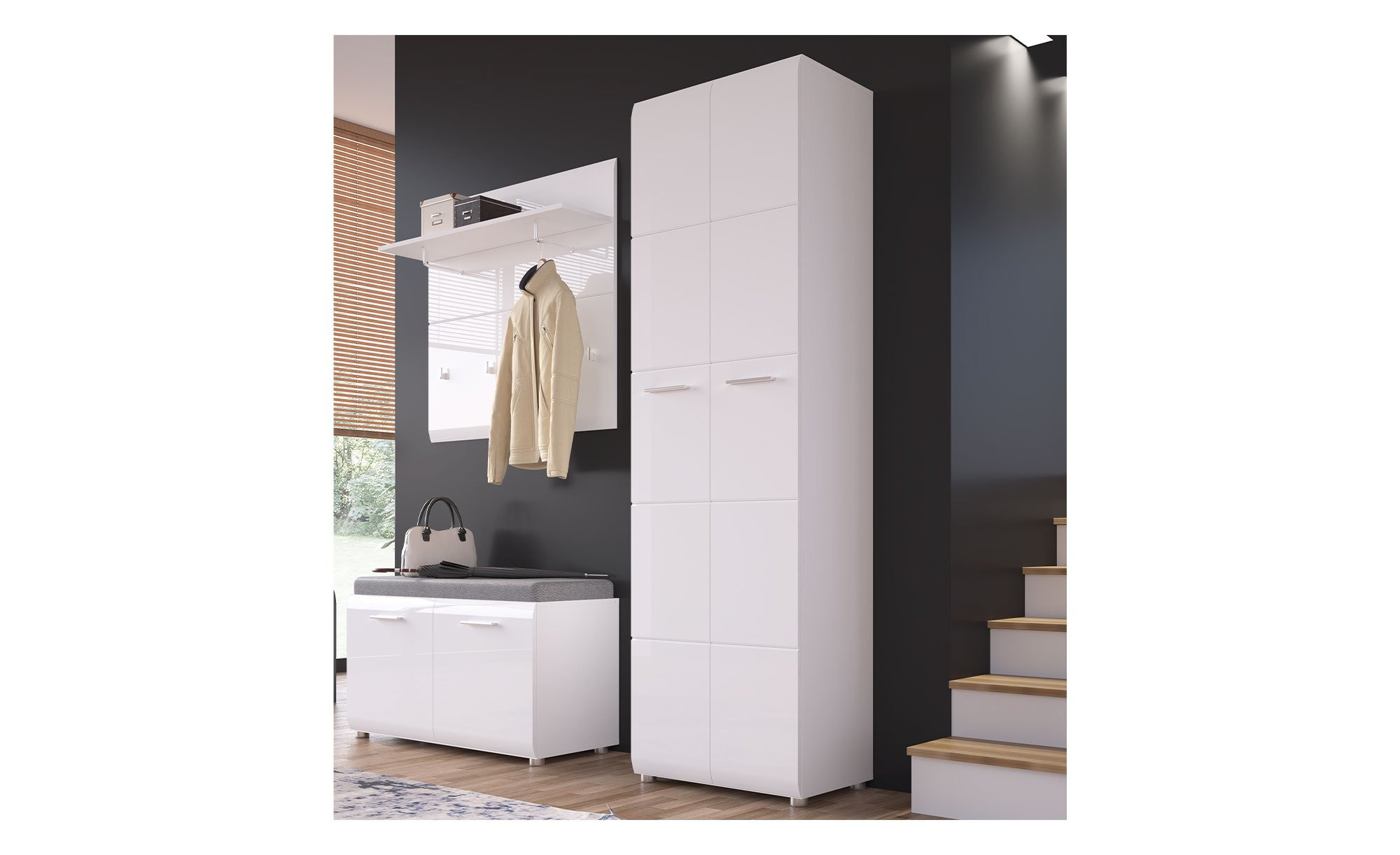 Mit seinen 5 Einlegeböden bietet Mestre optimalen Stauraum für Ihre Schuhe. Zusätzlich verfügt der Schrank über eine herausziehbare Kleiderstange für Ihre Jacken und Mäntel. Der komplette Garderobenschrank ist in einem weißen Farbton gehalten und die Front ist in einer edlen Hochglanzausführung.