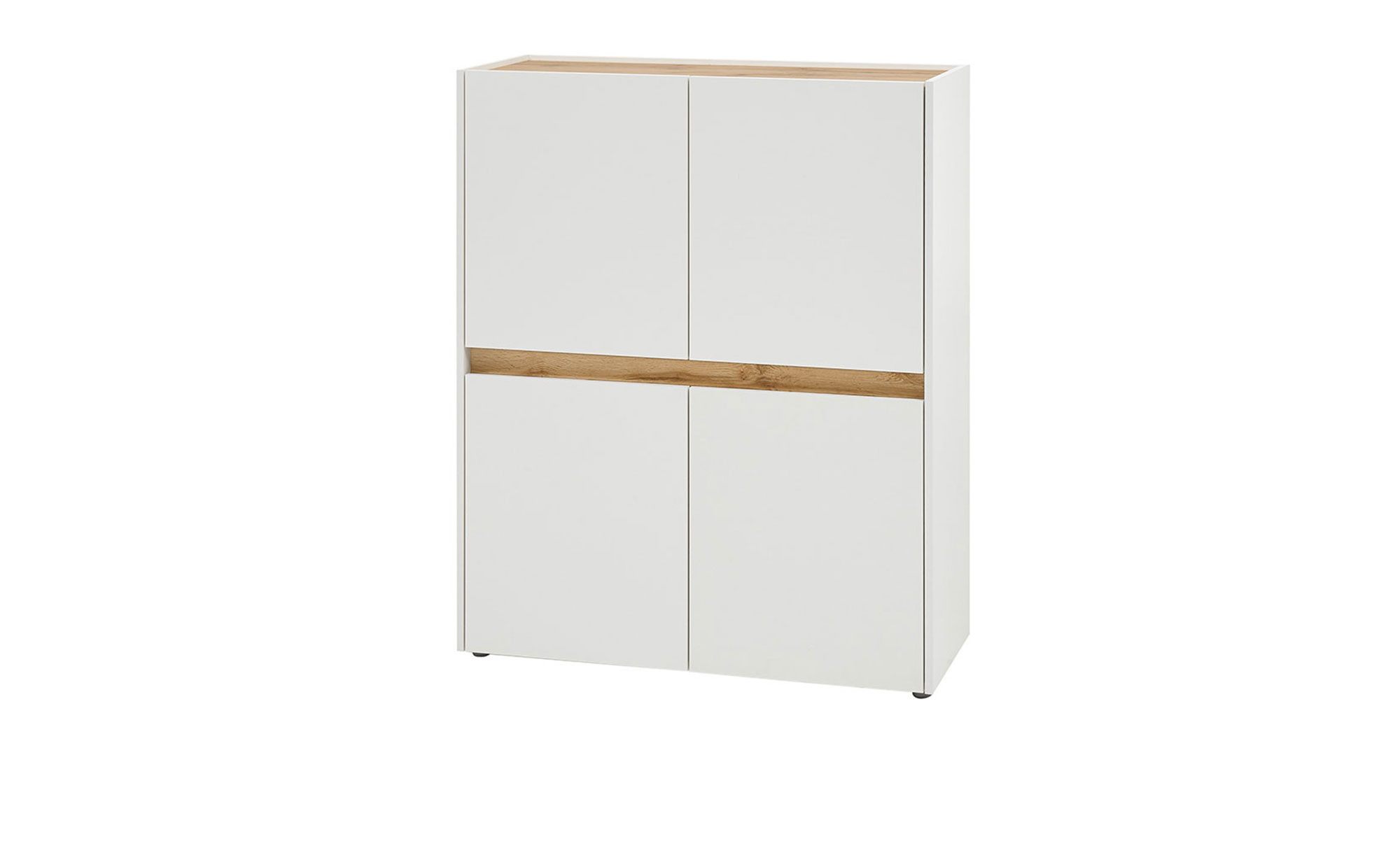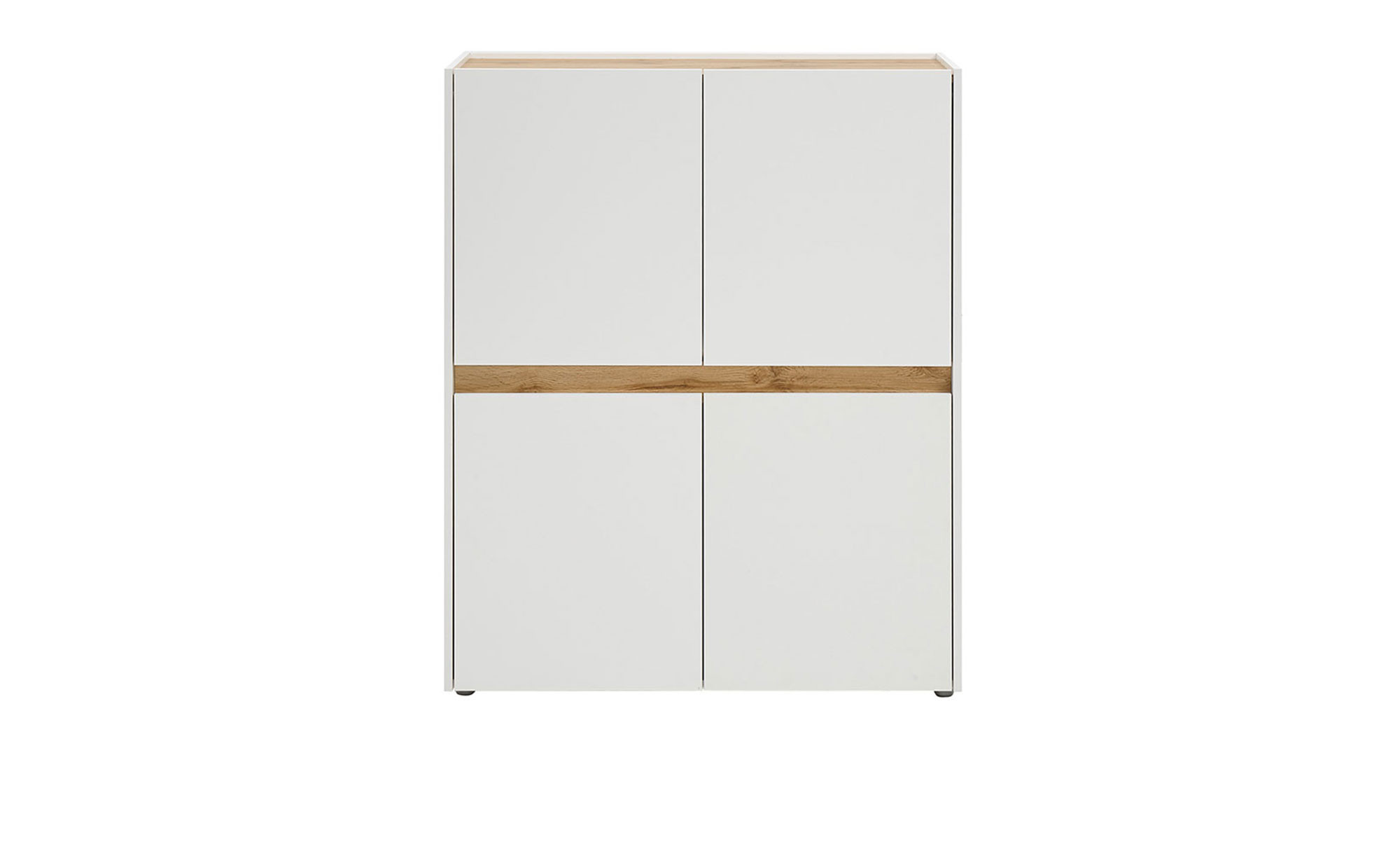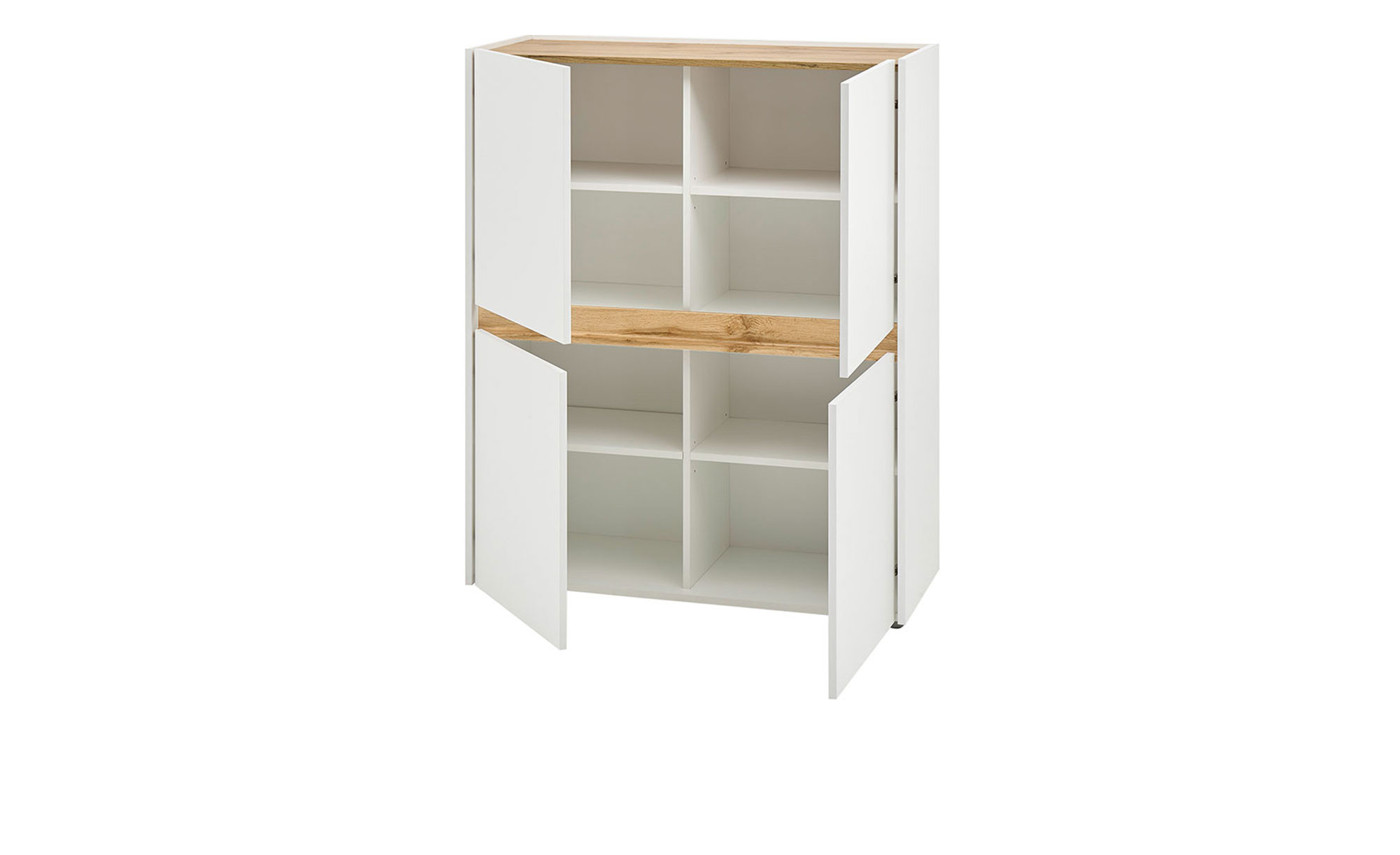 Damit Sie lange Freude an dem ca. 120 x 100 x 40 cm großen Highboard haben, wurden seine weißen Oberflächen mit Melaminharz beschichtet. Dieses sorgt für Unempfindlichkeit gegenüber Kratzern und Schmutz. Die weiße Farbe findet sich auch im Innern wieder. Einzig auf der Oberseite sowie an der Front gibt es Absetzungen im Dekor Wotan Eiche. Schwarze Kunststofffüße gewährleisten den sicheren Stand.