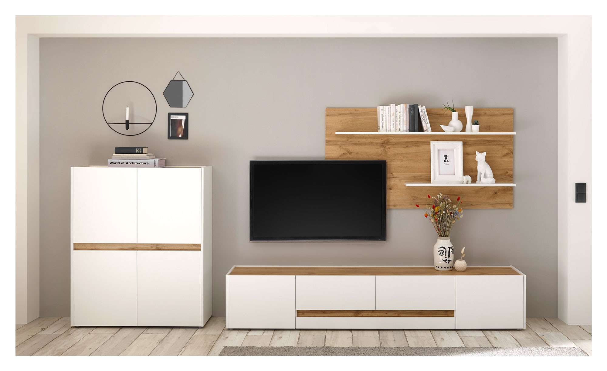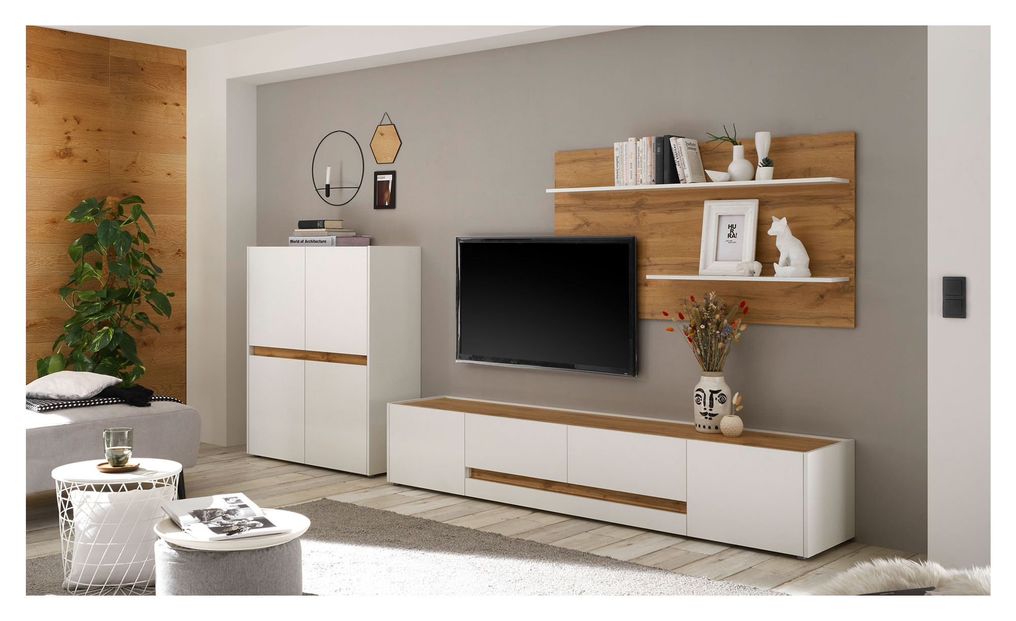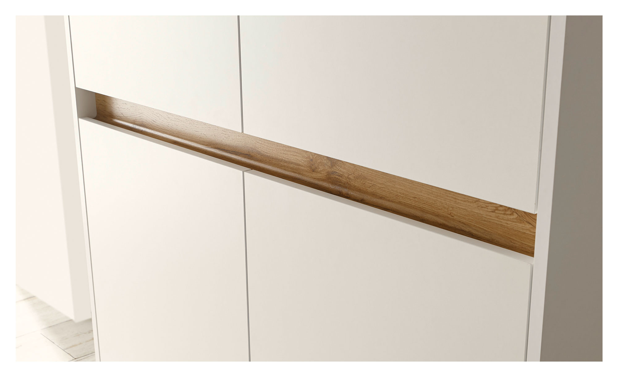 Damit Sie lange Freude an dem ca. 120 x 100 x 40 cm großen Highboard haben, wurden seine weißen Oberflächen mit Melaminharz beschichtet. Dieses sorgt für Unempfindlichkeit gegenüber Kratzern und Schmutz. Die weiße Farbe findet sich auch im Innern wieder. Einzig auf der Oberseite sowie an der Front gibt es Absetzungen im Dekor Wotan Eiche. Schwarze Kunststofffüße gewährleisten den sicheren Stand.