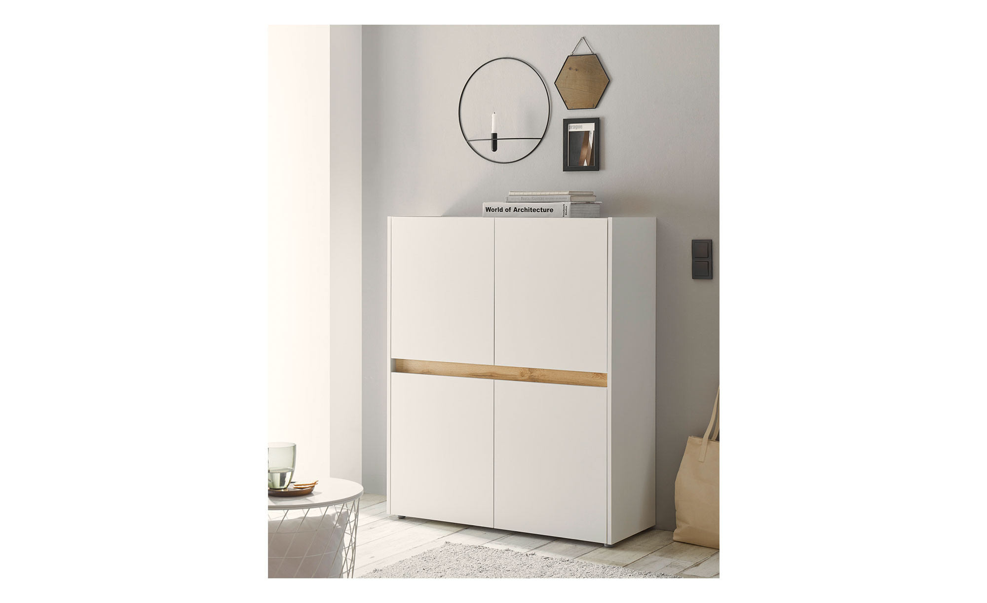Insgesamt ist Highboard Cintia mit vier Türen und vier Einlegeböden ausgestattet. Aus letzteren entstehen schließlich acht Fächer mit jeder Menge Platz für diverse Utensilien.