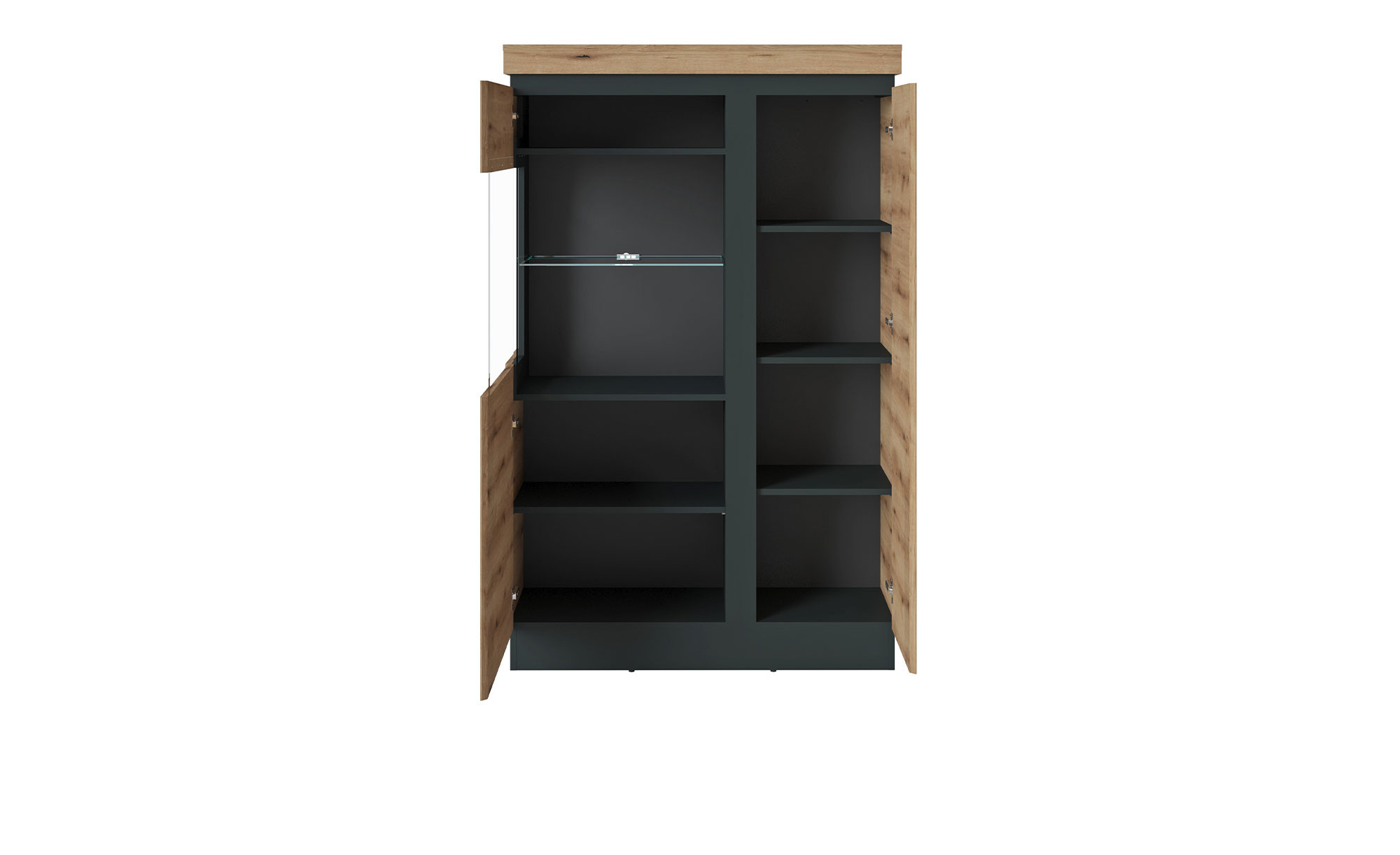 Korpus und Front des ca. 104 x 164 x 40 cm großen Highboards wurden im Dekor Front Coast Evoke Eiche gestaltet. Als Kontrast wirken die graue Absetzung sowie ein schwarzes Innendekor und ebensolche Rückwände und Kunststofffüße. Damit Sie lange Freude am Artikel haben, wurden seine Oberflächen mit widerstandsfähigem Melaminharz beschichtet.