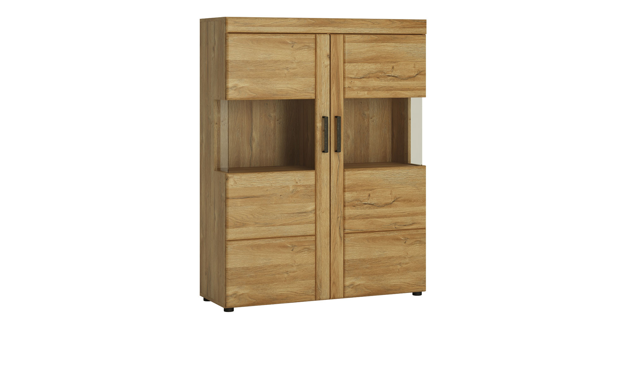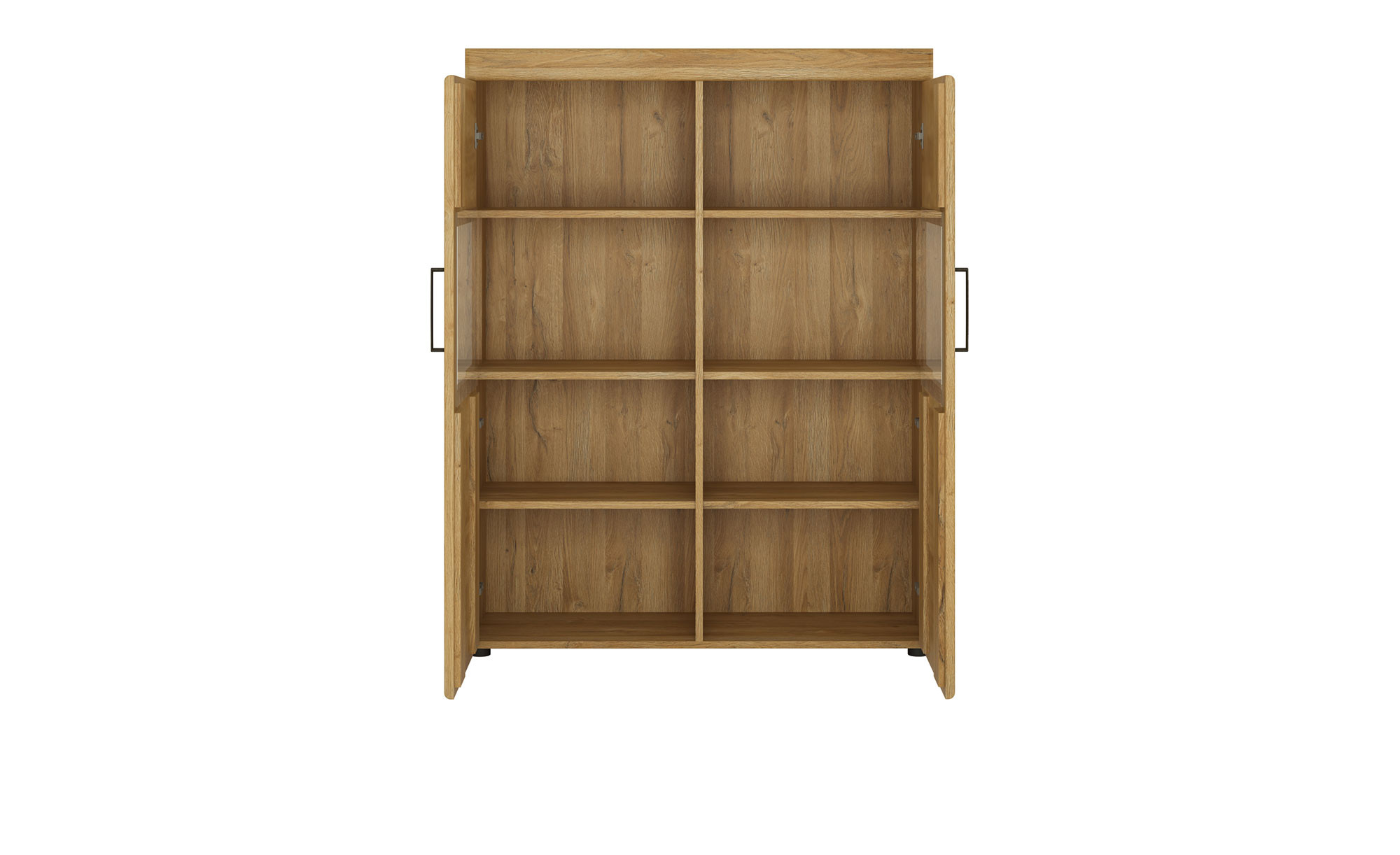 Mit dem zeitlosen Stil des Grandson Eiche-Dekors an Korpus und Front verströmt das ca. 103 x 133 x 37 cm große Highboard ein gemütliches Flair. Das Innendekor und die Rückwände hingegen wurden im Design Wotan Eiche gestaltet. Ein besonderer Hingucker ist ein Glasausschnitt in beiden Türen, welcher den Blick auf das Innere des Möbels freigibt. Hochwertige Metallgriffe in einem Antik Zinn-Look sowie schwarze Kunststofffüße runden das Bild ab.