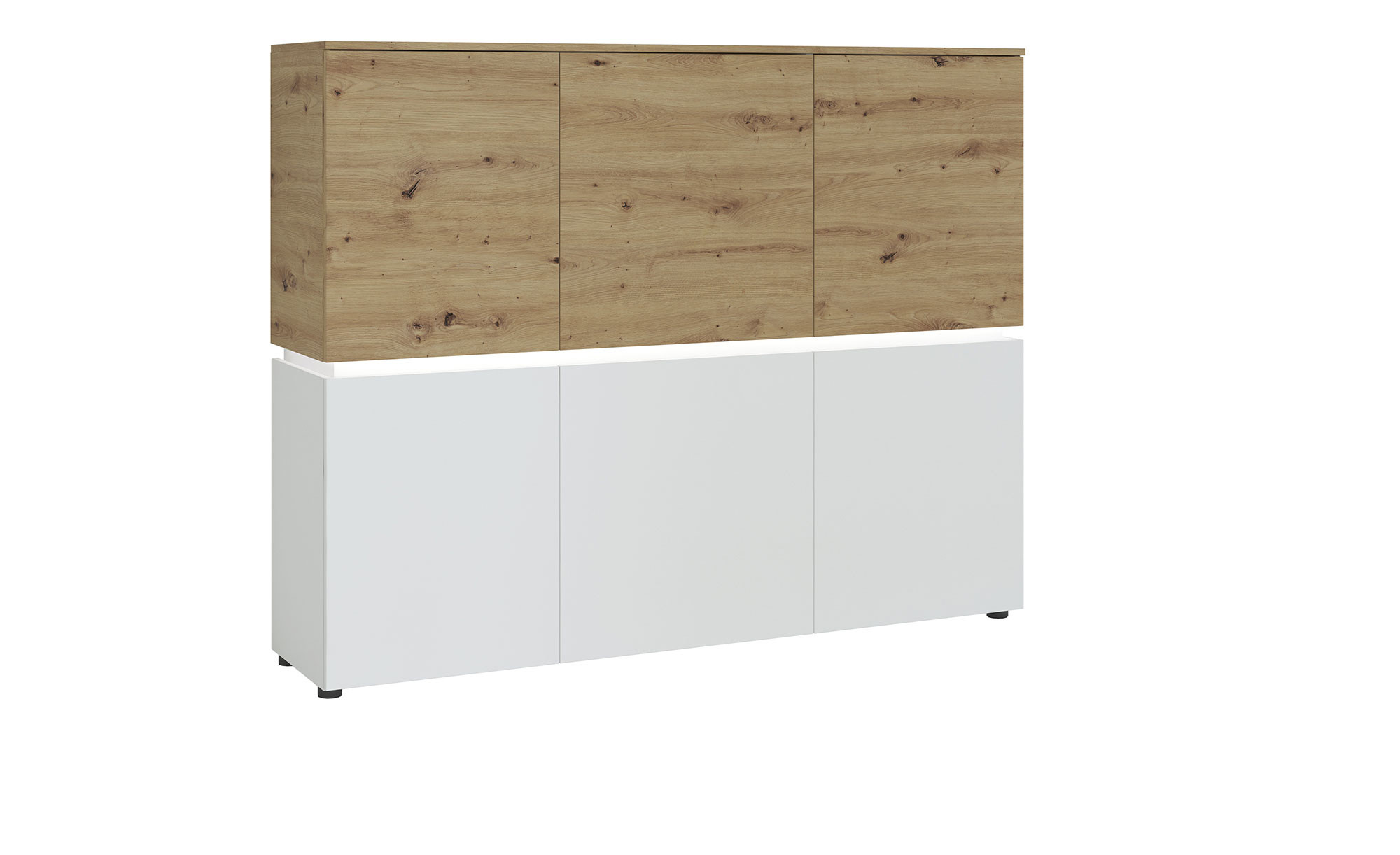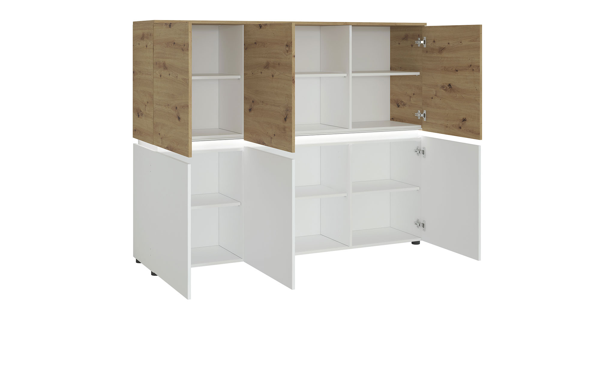 Korpus und Front sind optisch jeweils zweigeteilt – während unten alles ganz in Alpinweiß gehalten wurde, erwartet Sie in der oberen Hälfte das naturnahe Dekor Artisan Eiche. Innendekor und Rückwände des ca. 166 x 132 x 40 cm großen Schranks sind hingegen komplett weiß. Auf schwarzen Kunststofffüßen hat das Board einen sicheren Halt, außerdem gewährleisten die mit Melaminharz beschichteten Oberflächen eine lange Lebensdauer.