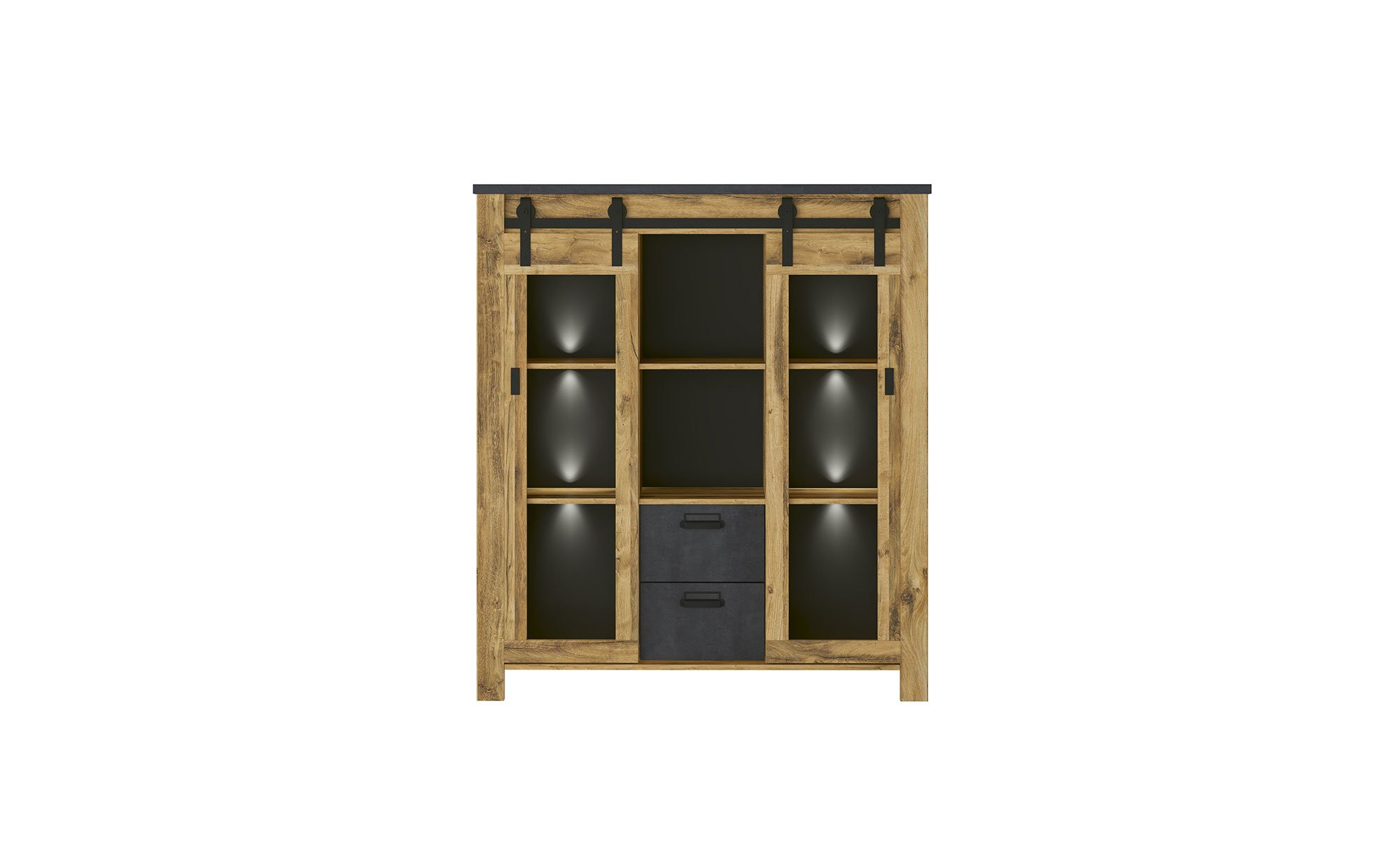 Front und Korpus des ca. 132 x 150 x 37 cm großen Möbelstücks bestehen aus Holzwerkstoff in einem naturnahen Hunton Eiche Dekor. An der Vorderseite dürfen Sie sich zusätzlich auf Applikationen in Fresco matt freuen, die HDF-Rückwand und Teile des Innendekors sind zudem in edlem Anthrazit gehalten.
