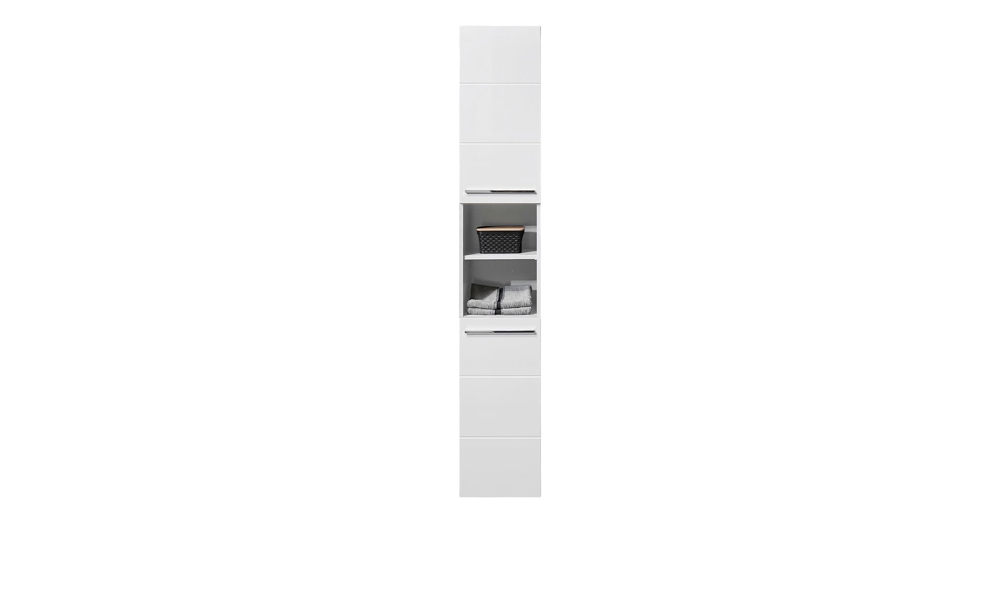 Auch die MDF-Front ist weiß, allerdings in einer hochglänzenden Variante. Neben schwarzen Kunststofffüßen komplettieren Kunststoffgriffe in Hochglanzchrom-Optik das Erscheinungsbild.
