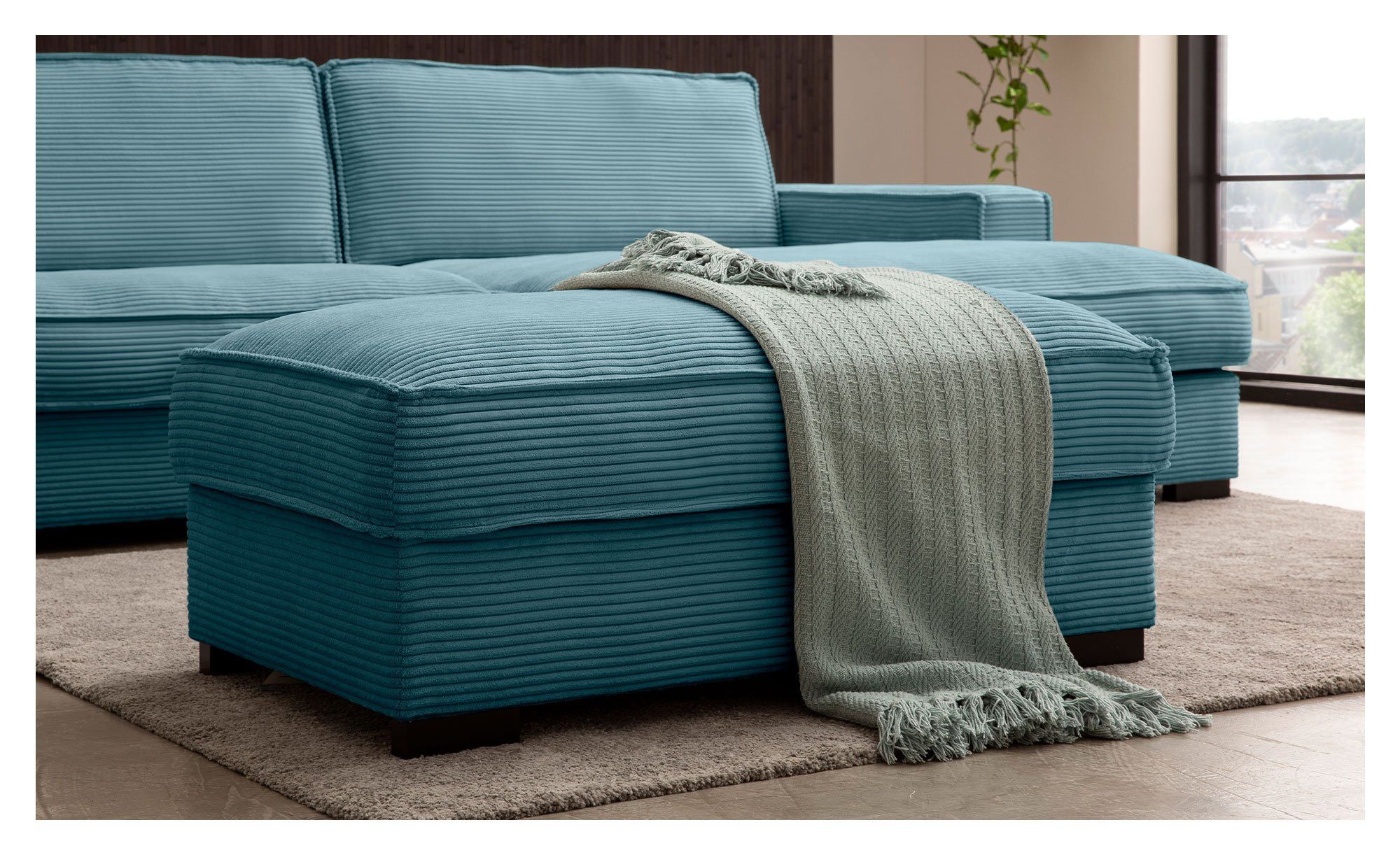 Das Möbelstück misst ca. 105 x 45 x 60 cm. Genau wie das Sofa ist es mit einem türkisblauen Cordstoff bezogen und versprüht damit ein positives Flair. Abgerundet wird die Erscheinung durch Holzfüße in der Farbe Wenge.
