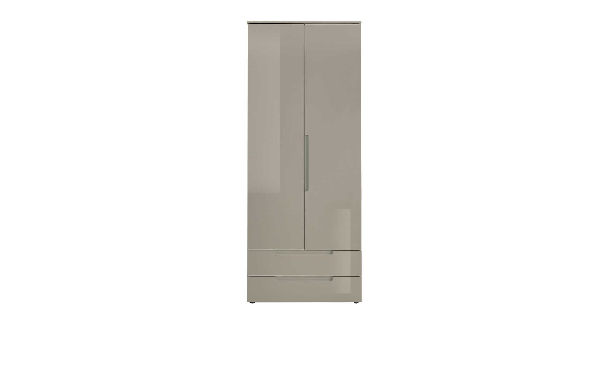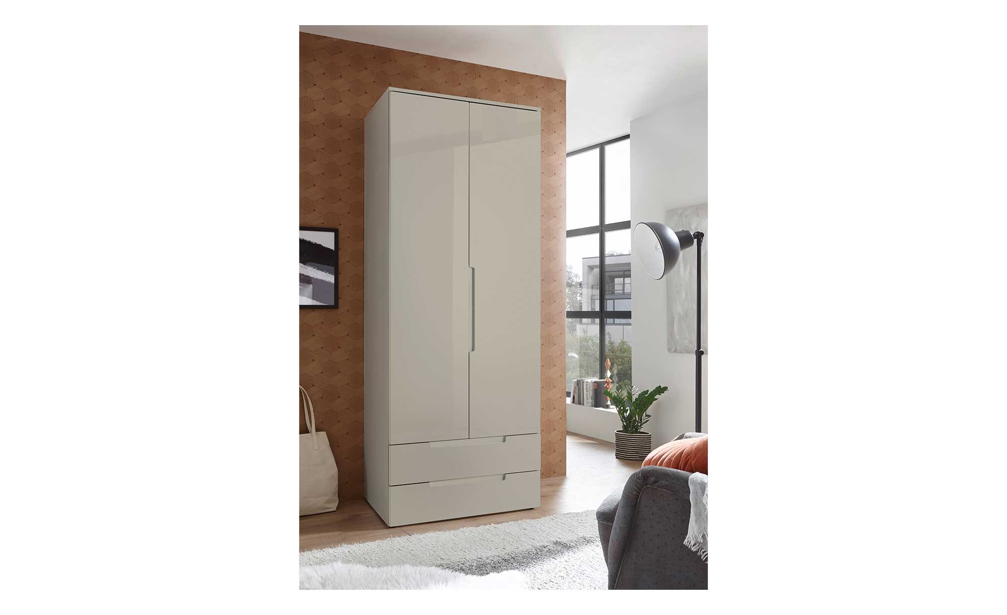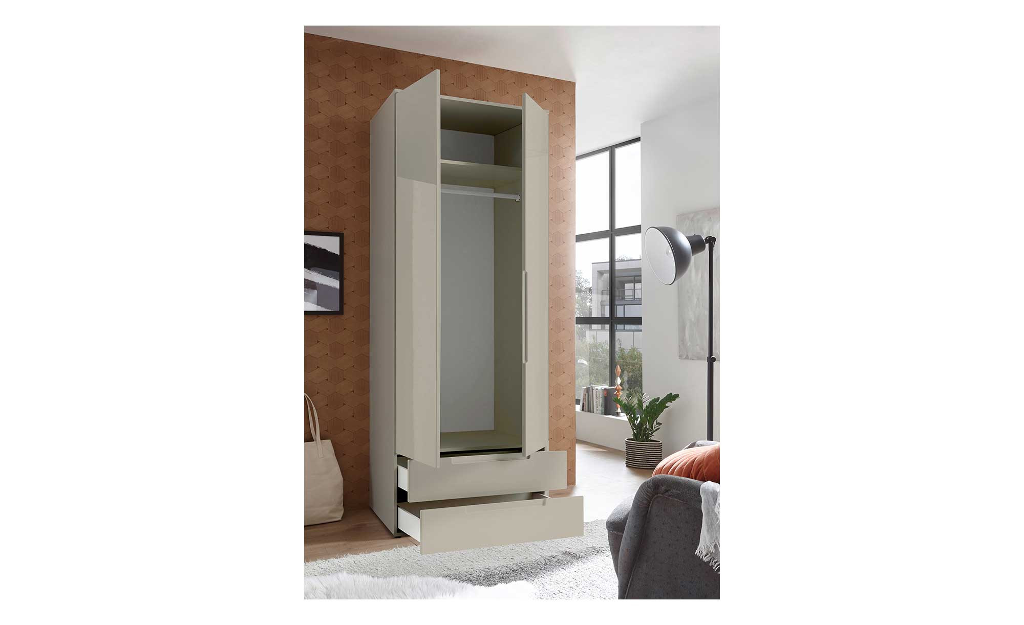Mit seinem champagnerfarbenen Korpus und hochglänzenden Fronten im gleichen Dekor zieht der ca. 84 x 208 x 57 cm große Schrank alle Blicke auf sich. Im Innern ist er in Grau und Weiß gehalten, außen begeistert das moderne, grifflose Design.