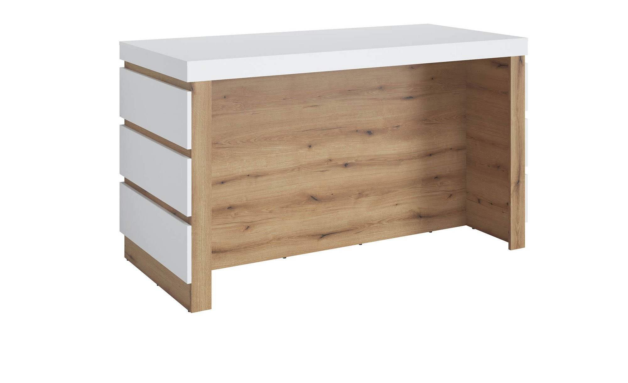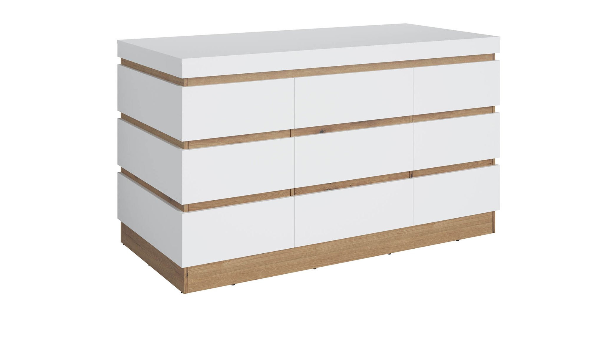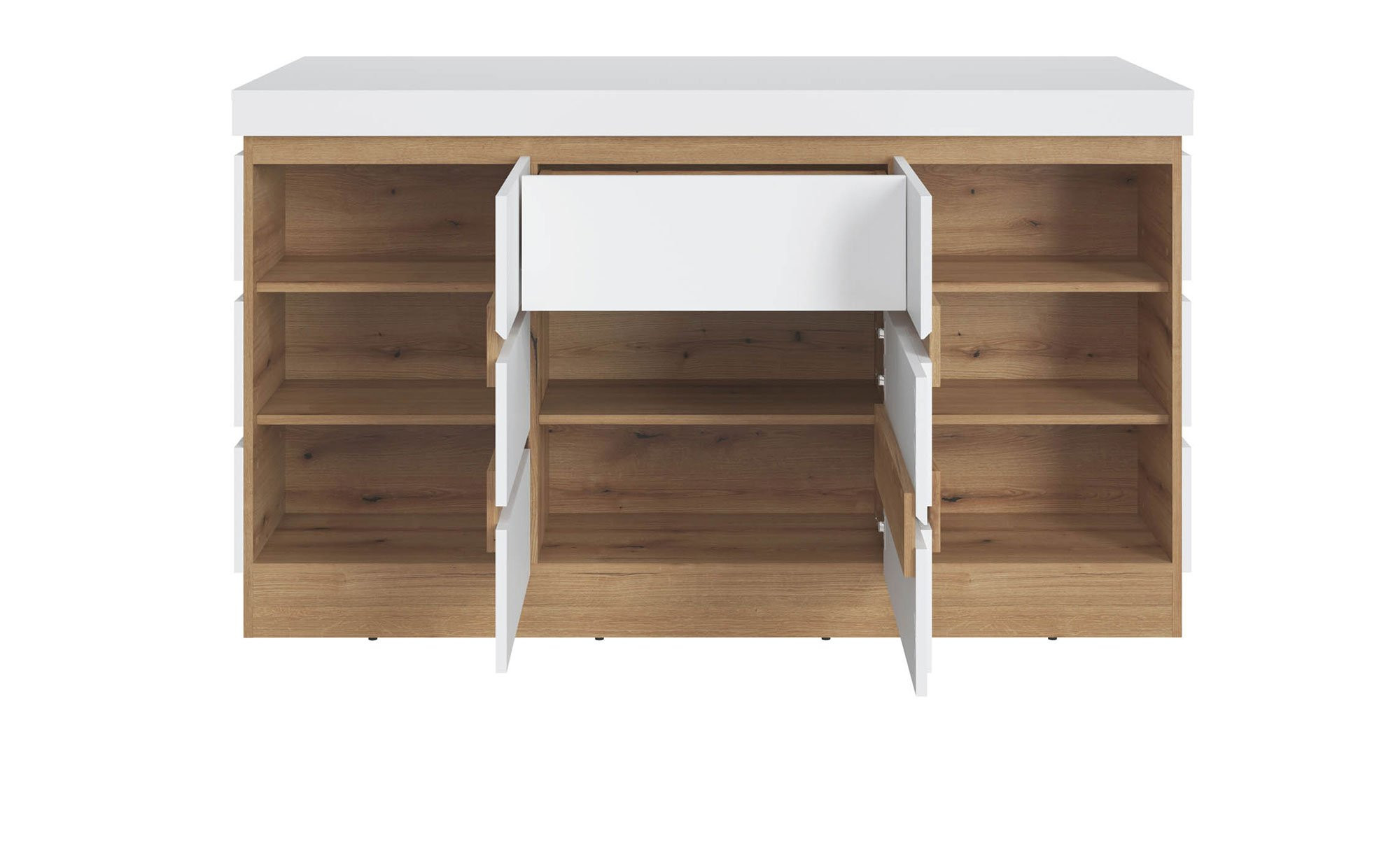 Front und Korpus des ca. 160 x 93 x 75 cm großen Artikels wurden aus Holzwerkstoff hergestellt und sind in Alpinweiß gehalten. Die mit Melaminharz beschichteten Oberflächen sind zudem wirkungsvoll vor Verschleiß geschützt. Sowohl als Absetzung als auch als Innendekor fungiert ein natürlicher Coast Evoke Eiche-Look.