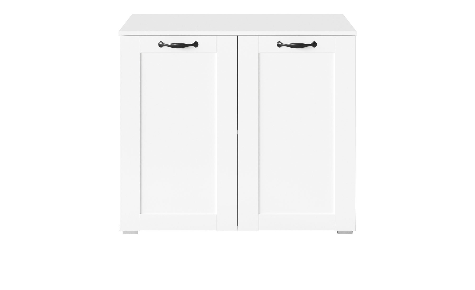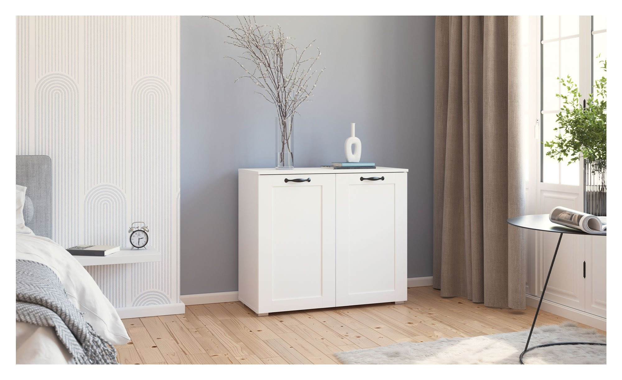 Das ca. 93 x 81 x 42 cm große Möbelstück besteht aus Holzwerkstoff und ist komplett in einem frischen Alpinweiß gehalten. Eine Rahmen-Optik an den beiden Fronttüren springt ebenso ins Auge, wie die Metallgriffe im Farbton Schwarz Cottage. Abgerundet wird das Angebot durch alufarbige Füße aus Kunststoff.
