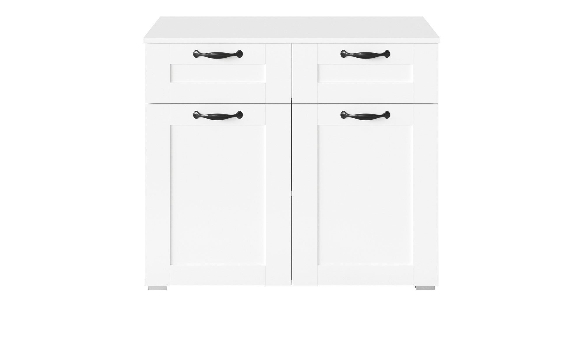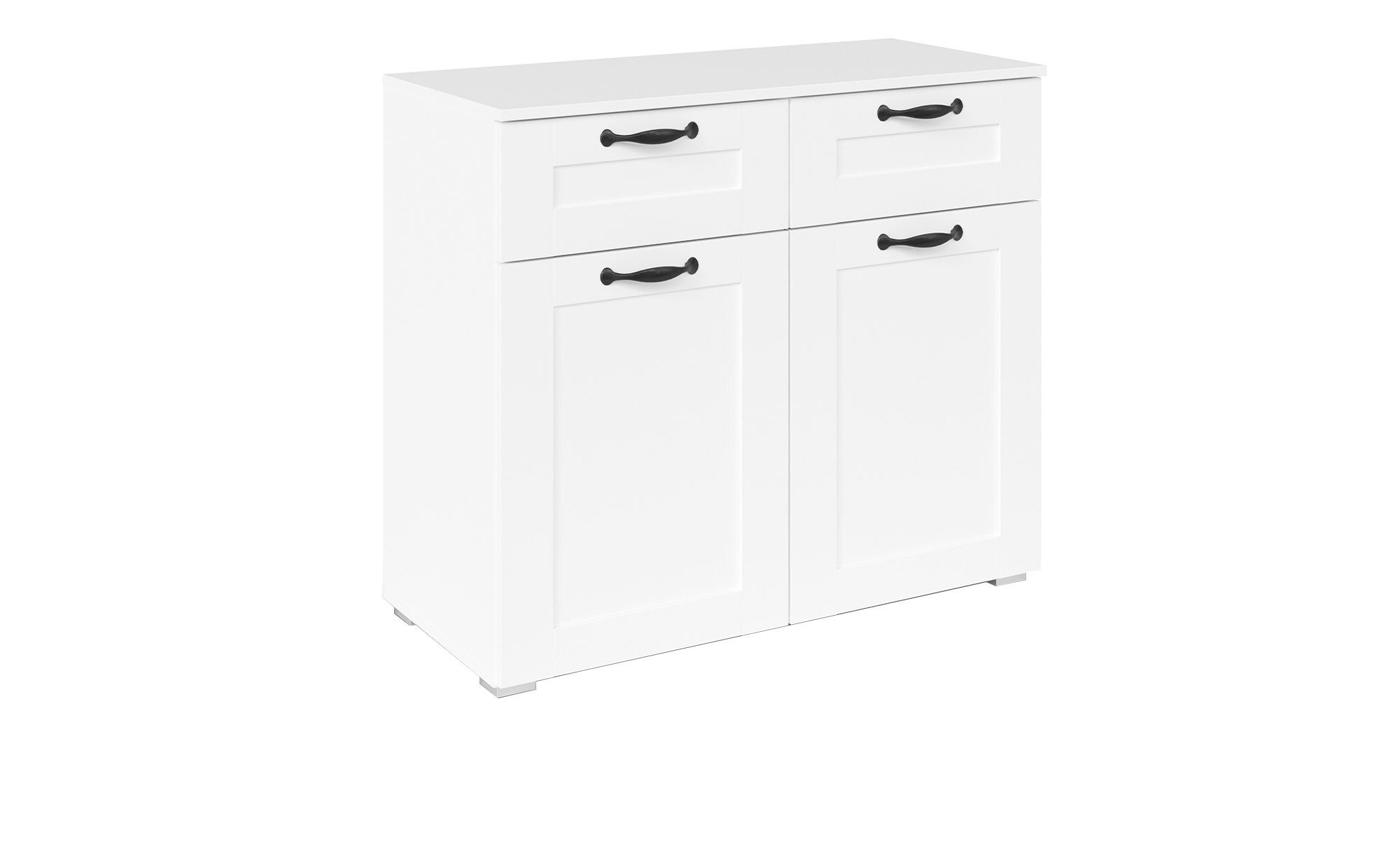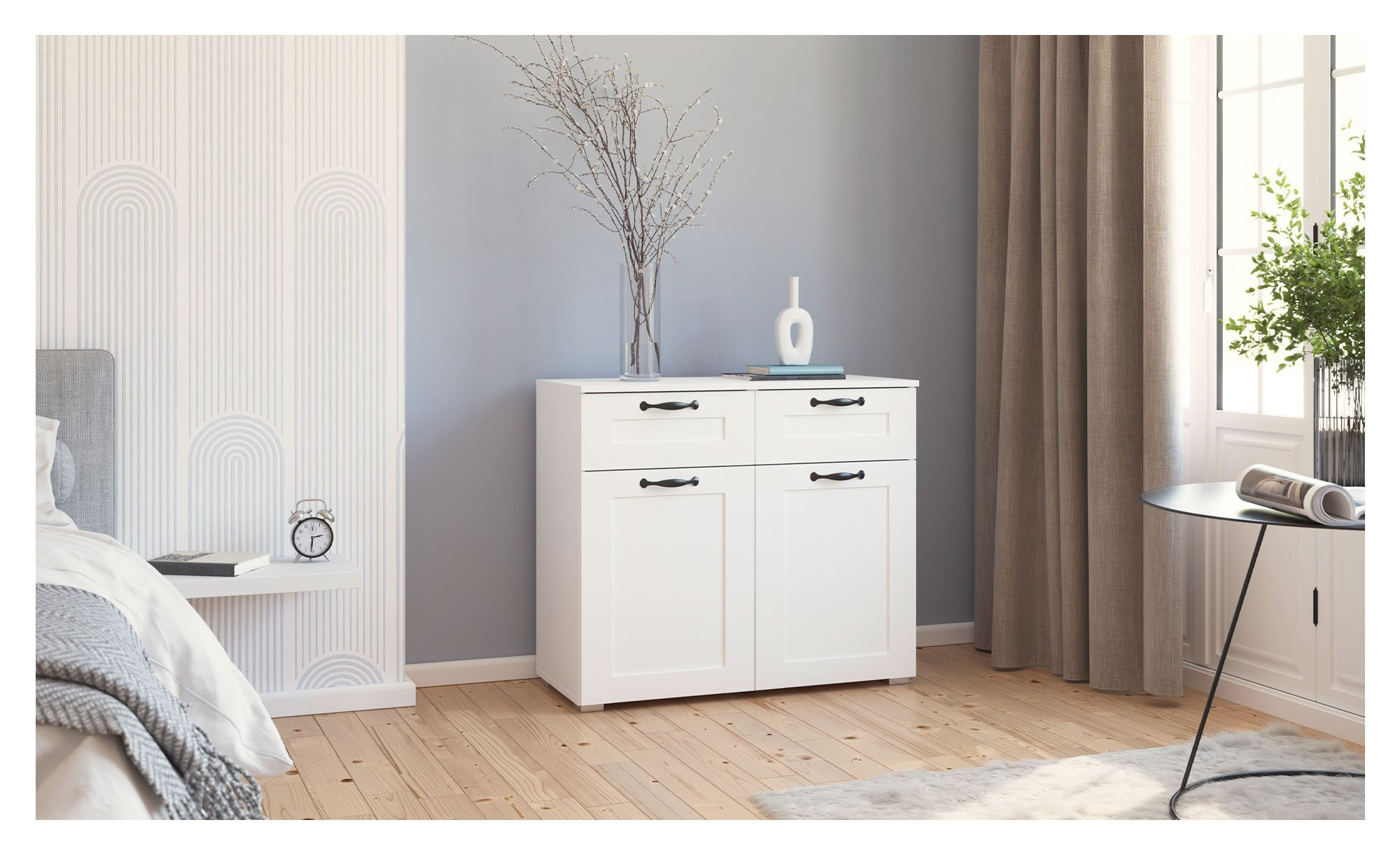 Front und Korpus der Kommode bestehen aus Holzwerkstoff und sind komplett in Alpinweiß gestaltet. Unmittelbar ins Auge springen zudem die Rahmen-Optik der Fronttüren sowie Metallgriffe im Ton Schwarz Cottage. Für den sicheren Stand sorgen alufarbige Kunststofffüße.
