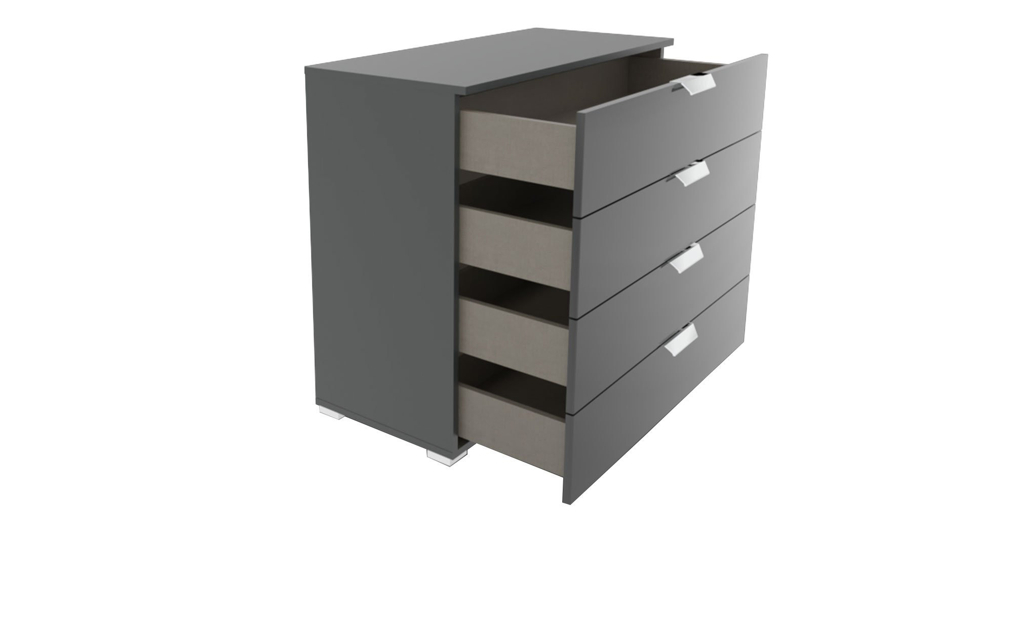 Das Möbelstück bietet mit seinen vier Soft-Close-Schubkästen die Möglichkeit, auf geräuscharme Weise diverse Gegenstände ordentlich zu verstauen.