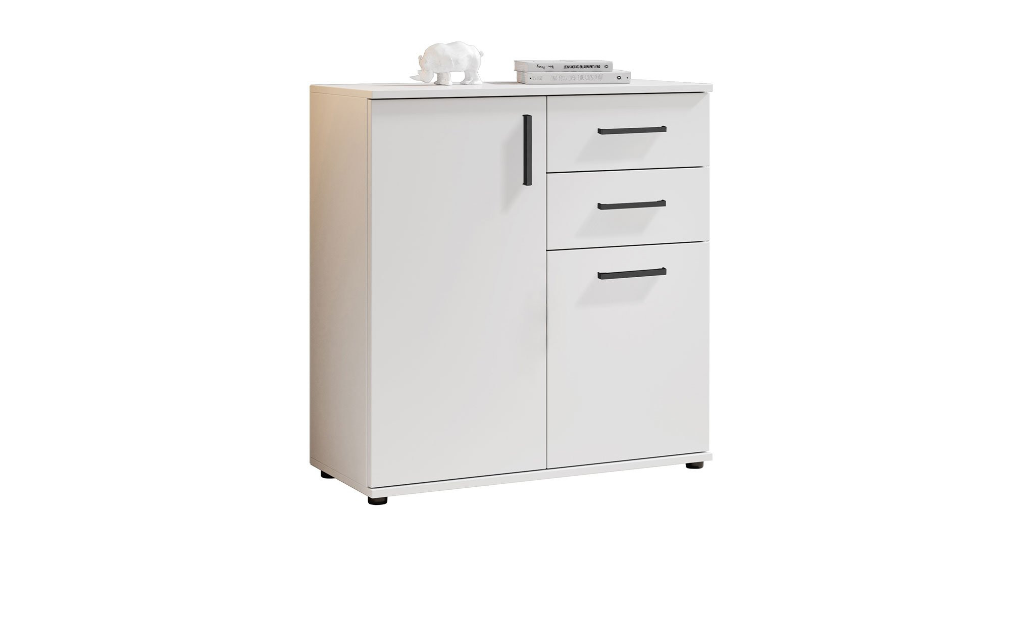 Der Artikel misst ca. 80 x 83 x 35 cm und besteht aus weiß foliertem Holzwerkstoff. Schwarze Kunststofffüße und ebensolche Stangengriffe sorgen für eine stilvolle Zweifarbigkeit. Hinter einer der zwei Türen finden Sie einen Einlegeboden, der den Stauraum optimal gliedert. Außerdem wurden zwei Schubladen integriert.