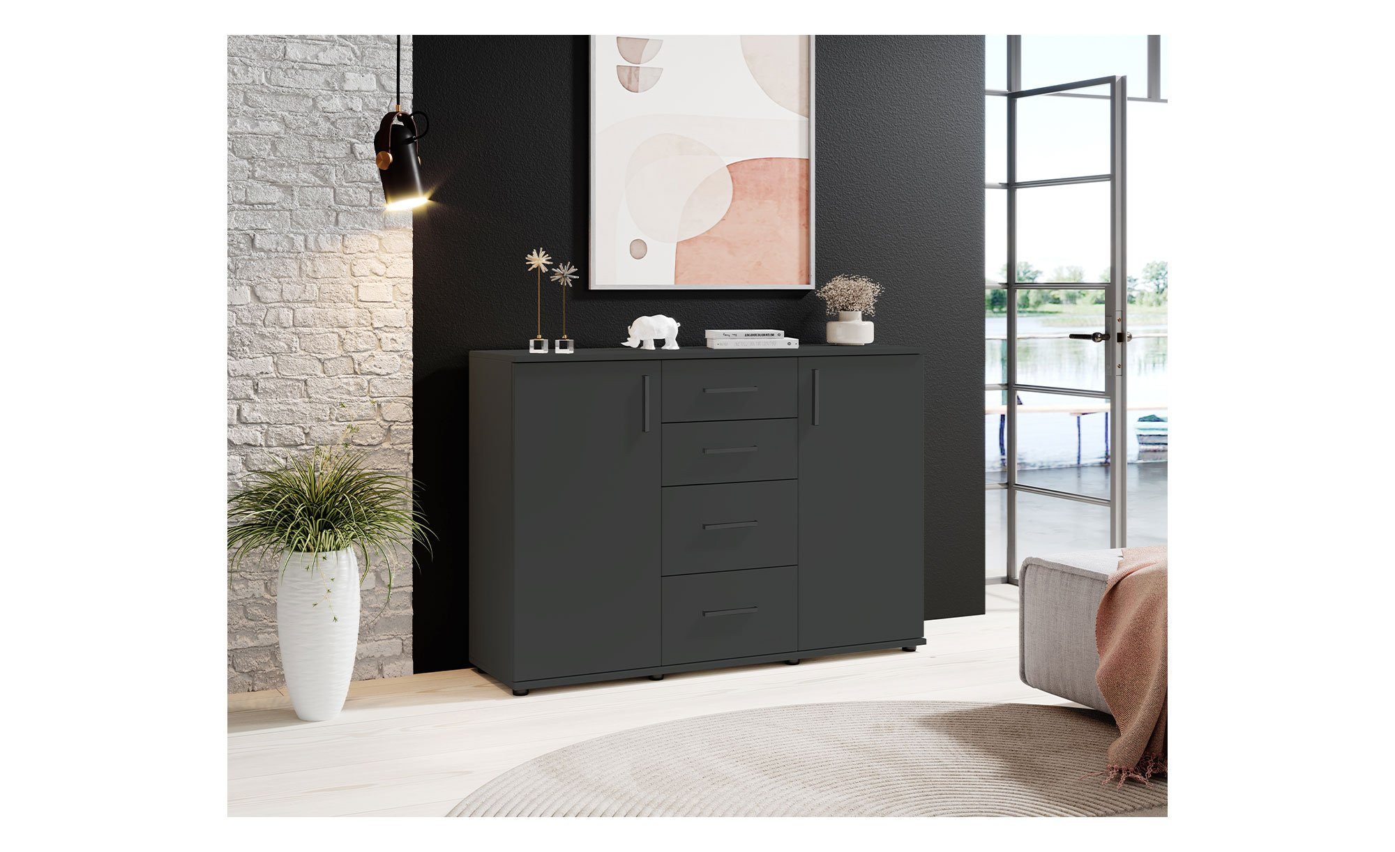 Der ca. 120 x 83 x 35 cm große Artikel kombiniert im Ton Anthrazit folierte Flächen aus Holzwerkstoff mit schwarzen Stangengriffen und Füßen aus Kunststoff. Hinter den beiden Türen finden Sie zwei Einlegeböden, auf denen Sie verschiedene Dinge ordentlich verstauen können. Außerdem gehören vier mittig angeordnete Schubladen zum Angebot.