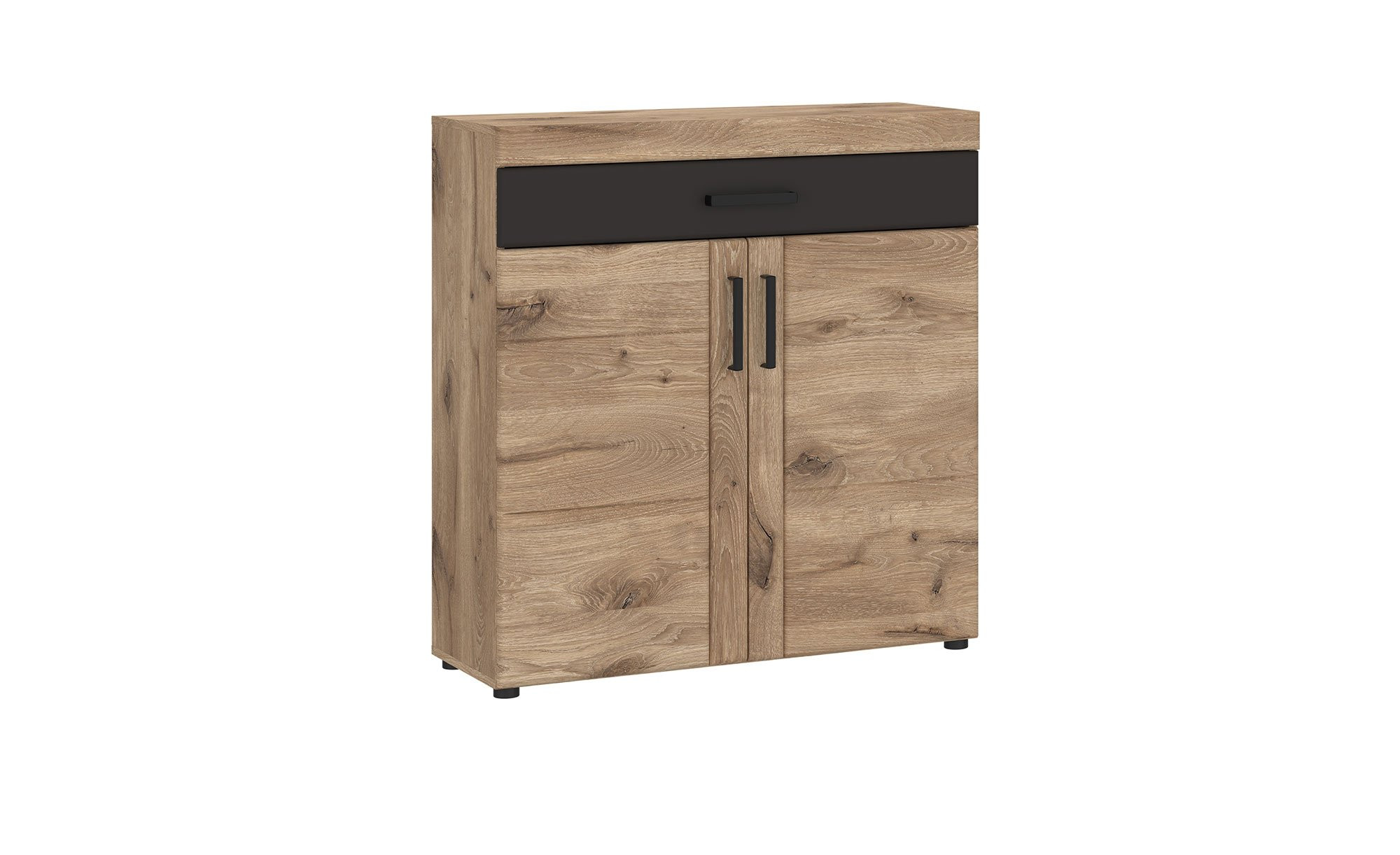 Der Artikel misst ca. 93 x 100 x 38 cm und besteht aus Holzwerkstoff. Mit seinem Viking Eiche-Dekor versprüht er ein natürliches Flair, außerdem schützt die Beschichtung mit Melamin zuverlässig vor Schmutz und Kratzern. Für einen modernen Akzent sorgt die Absetzung im Farbton Kosmos Grau. Schwarze Kunststofffüße und -griffe runden die Optik ab.