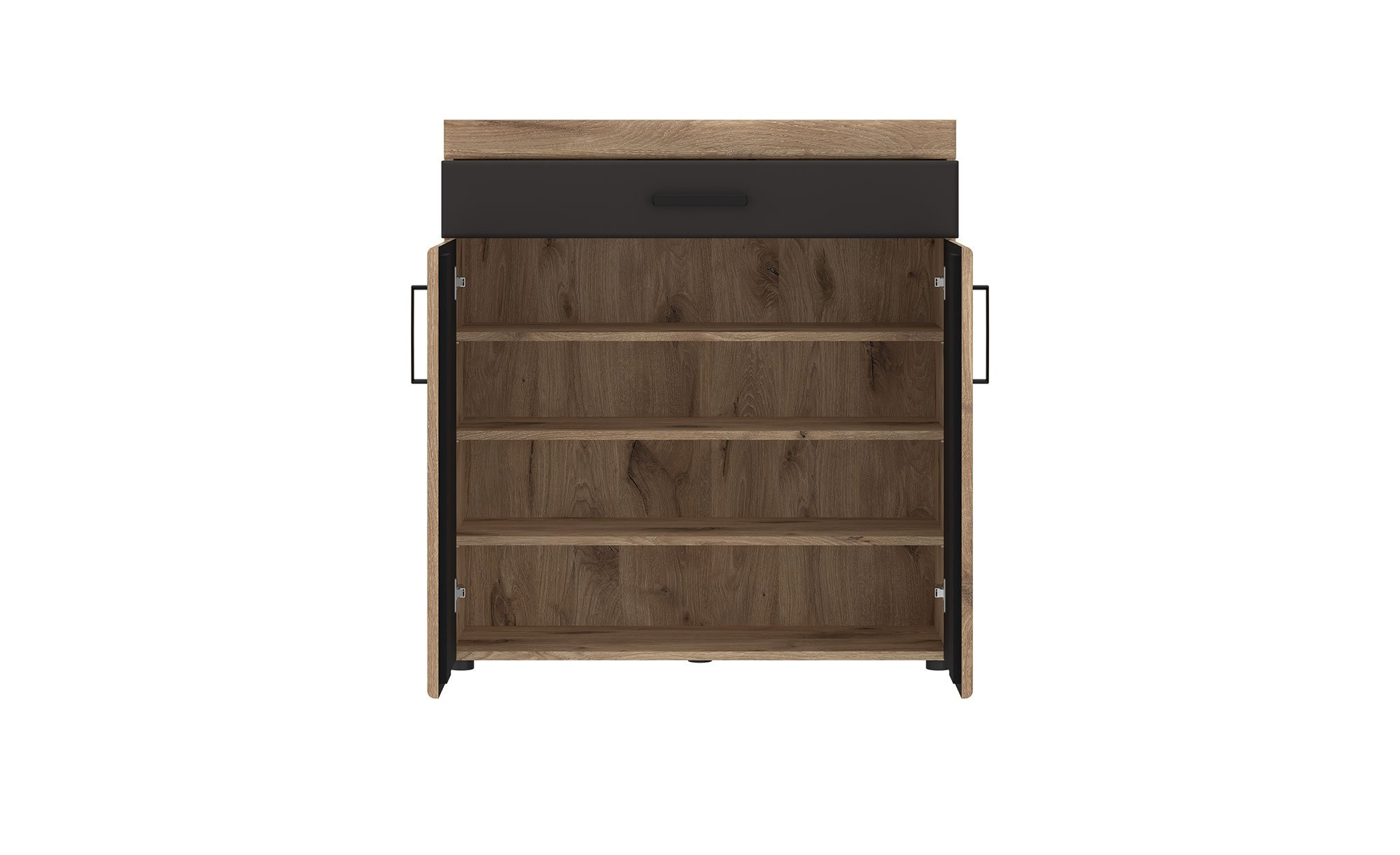 Hinter den beiden gedämpften Türen erwartet Sie ein Innenbereich mit drei Böden. Zusätzlichen Platz bietet die Schublade inkl. Soft-Close System.