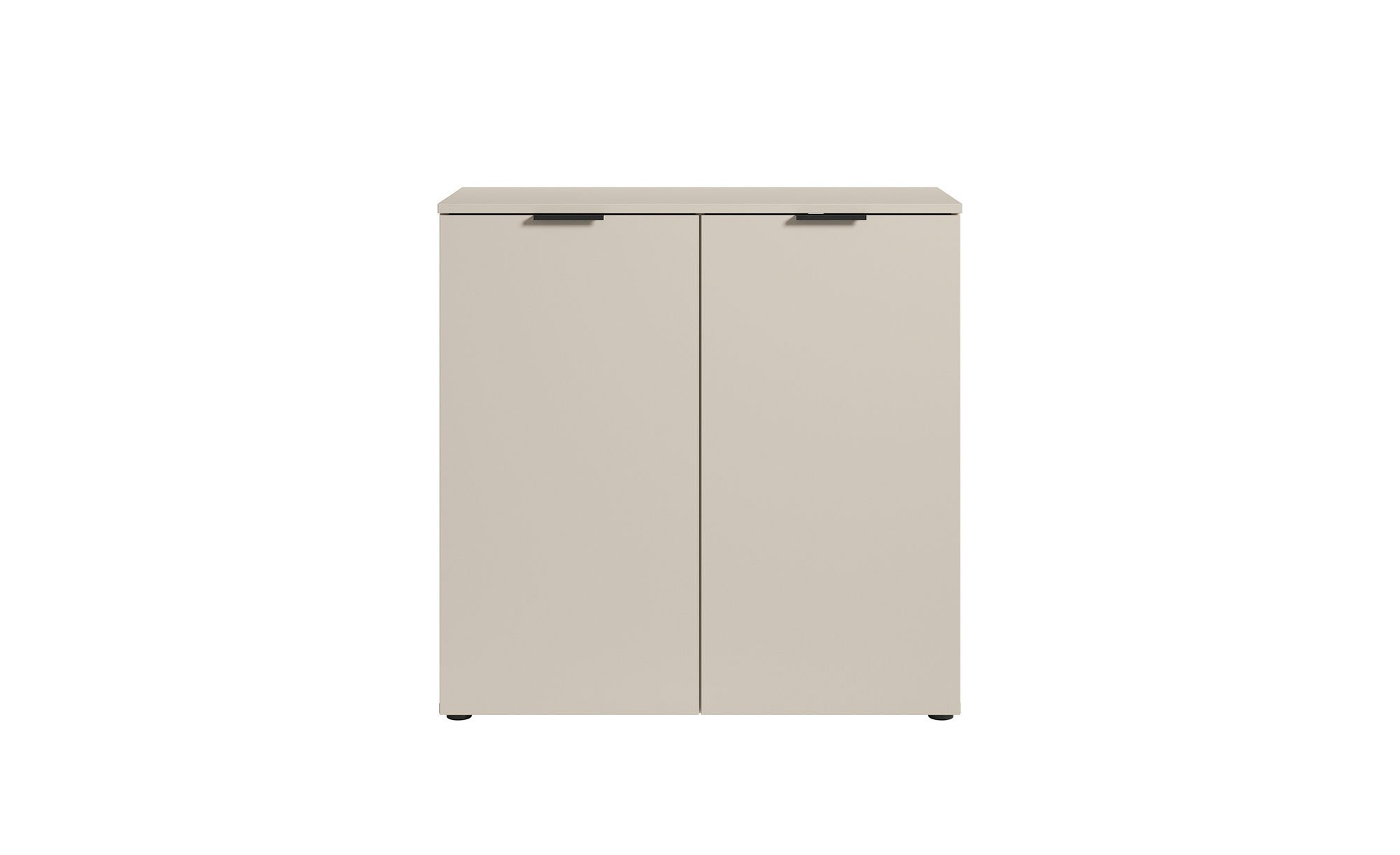 Das ca. 90 x 90 x 40 cm große Möbelstück besteht aus Holzwerkstoff in einem edlen Kaschmir-Ton. Eine Melaminbeschichtung schützt an der Vorderseite zusätzlich vor Verschleiß. Schwarze Kunststofffüße und Lip Griffe runden das Erscheinungsbild ab.