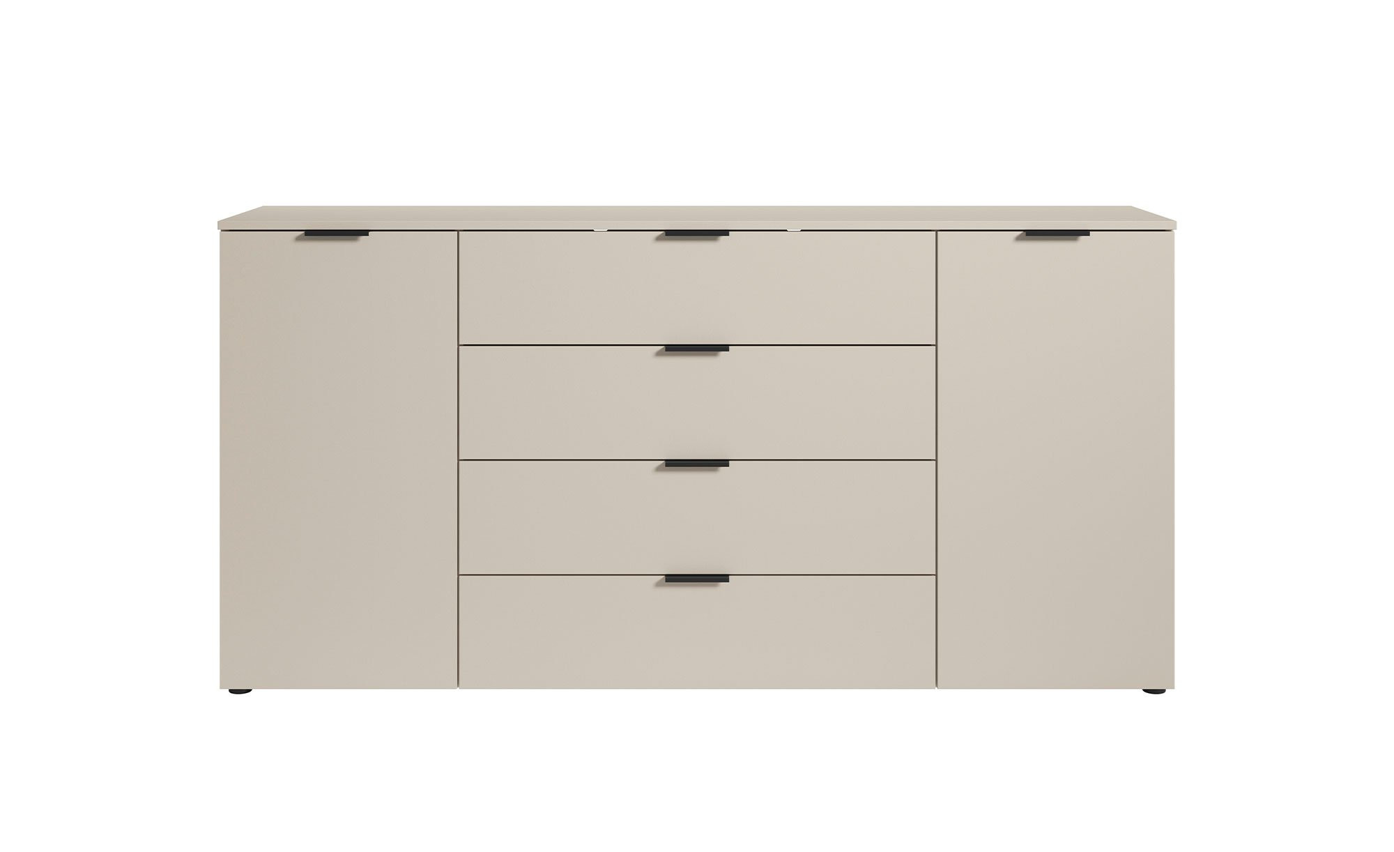 Abgerundet wird das Design durch schwarze Kunststofffüße und dezente Lip Griffe. Im Inneren finden Sie hinter den beiden Türen zwei Böden, die viel Platz für Alltagsgegenstände bieten. Darüber hinaus wurden mittig vier geräumige Schubladen angebracht.