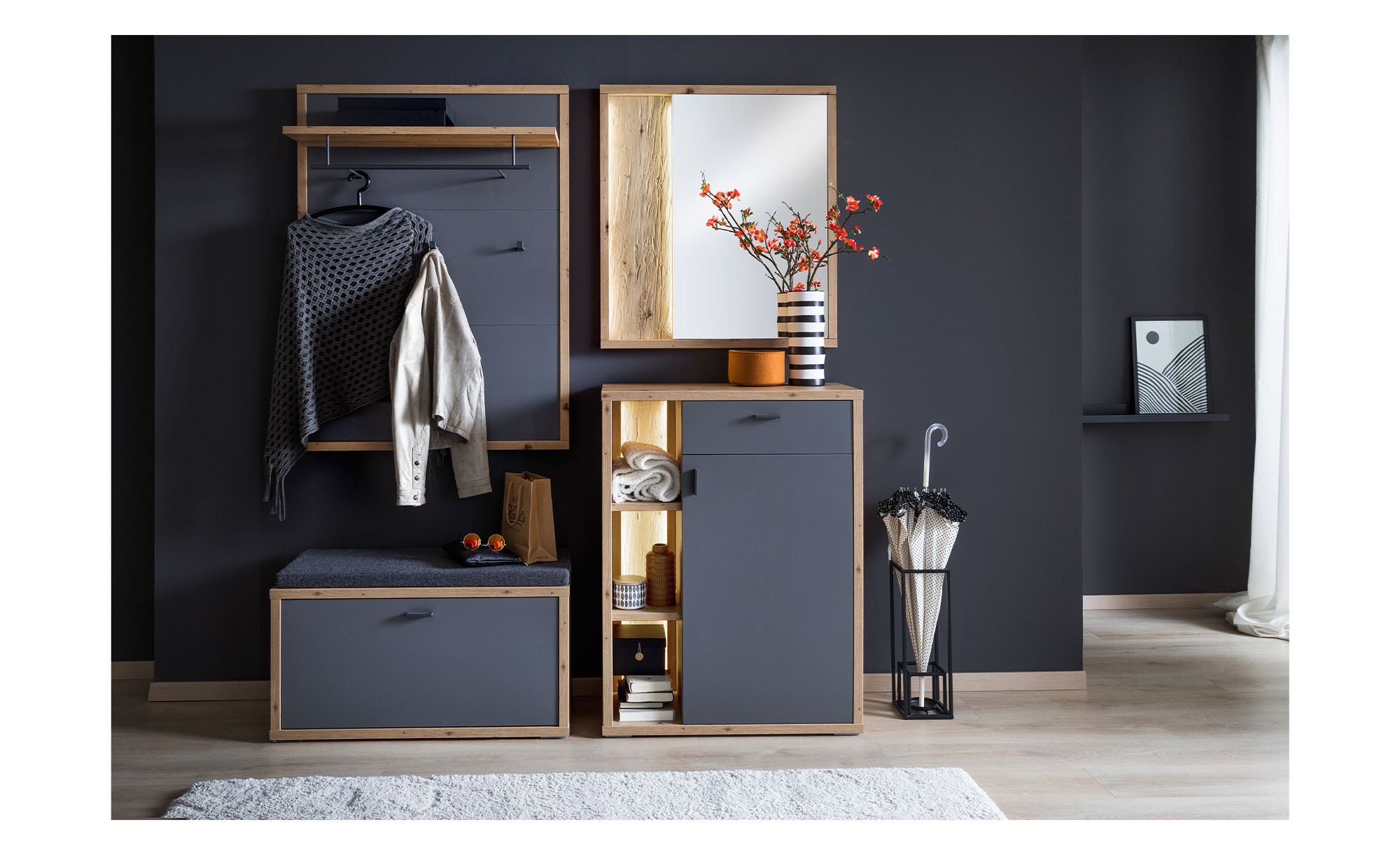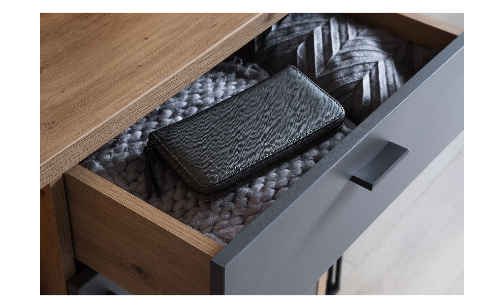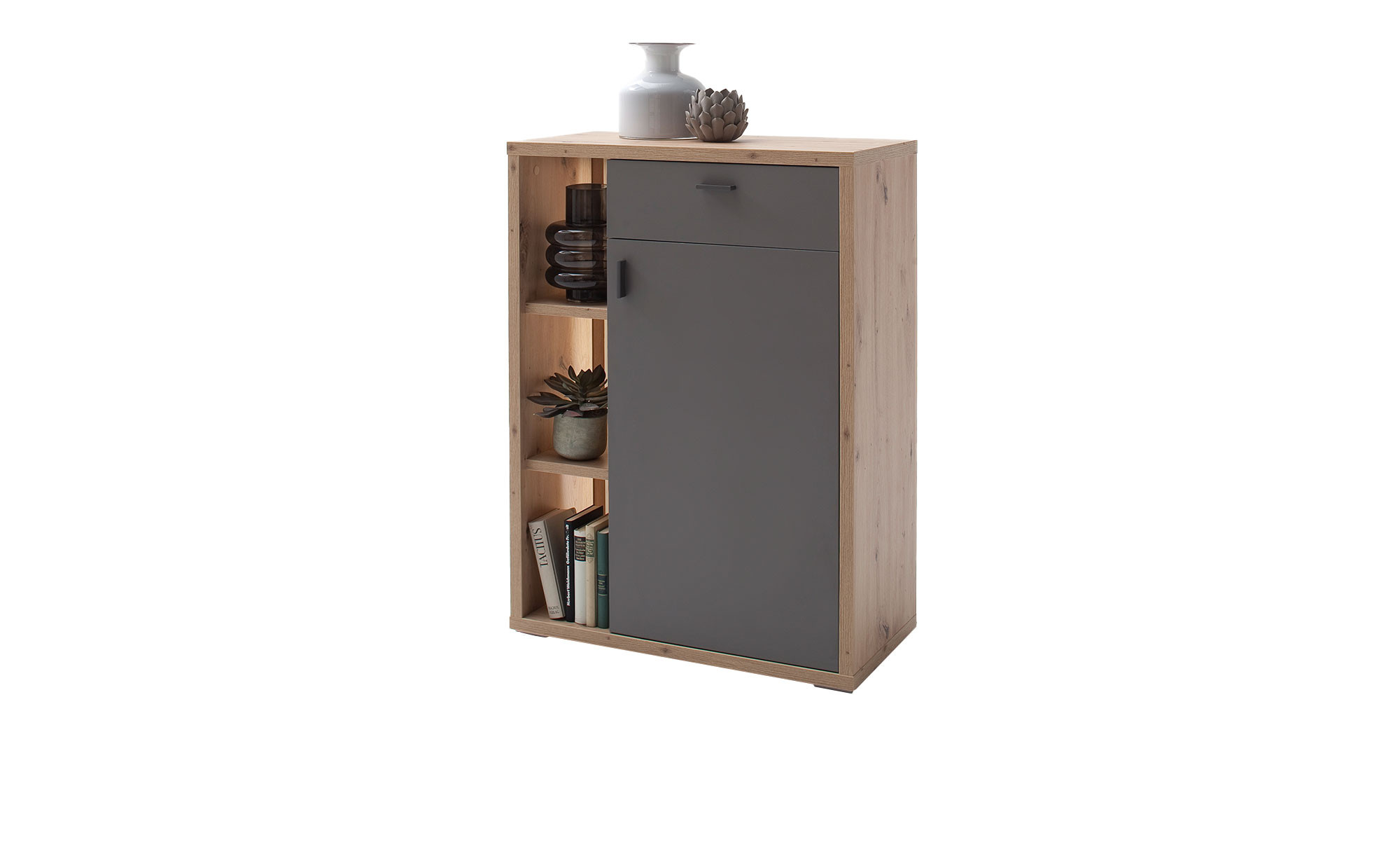 Mit ihrem im Dekor Balkeneiche gestalteten Korpus versprüht die ca. 76 x 103 x 37 cm große Kommode ein naturnah-gemütliches Flair. Auch an den Rückwänden findet sich der Balkeneiche-Look, beim sichtbaren Bereich sogar mit einem strukturierten 3D-Effekt. Die Front hingegen sorgt in Royal Grey für einen gelungenen Kontrast. Für eine lange Haltbarkeit wurde ihre Oberfläche mit Melaminharz beschichtet.