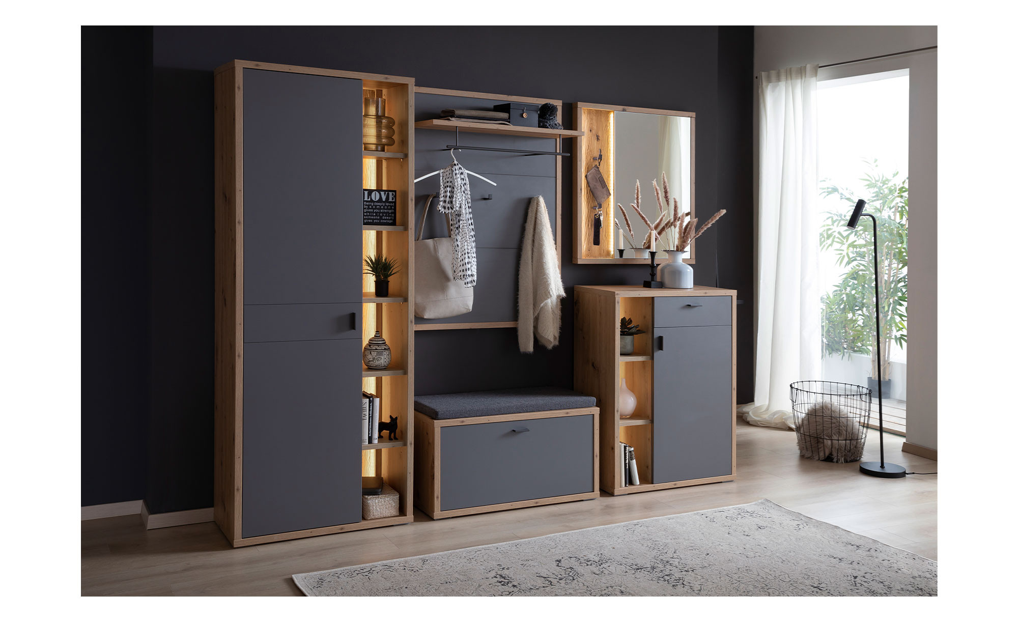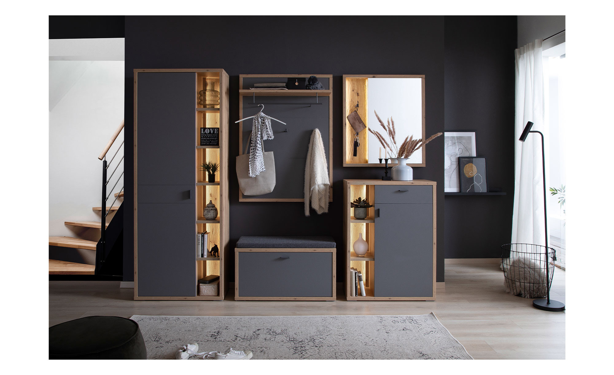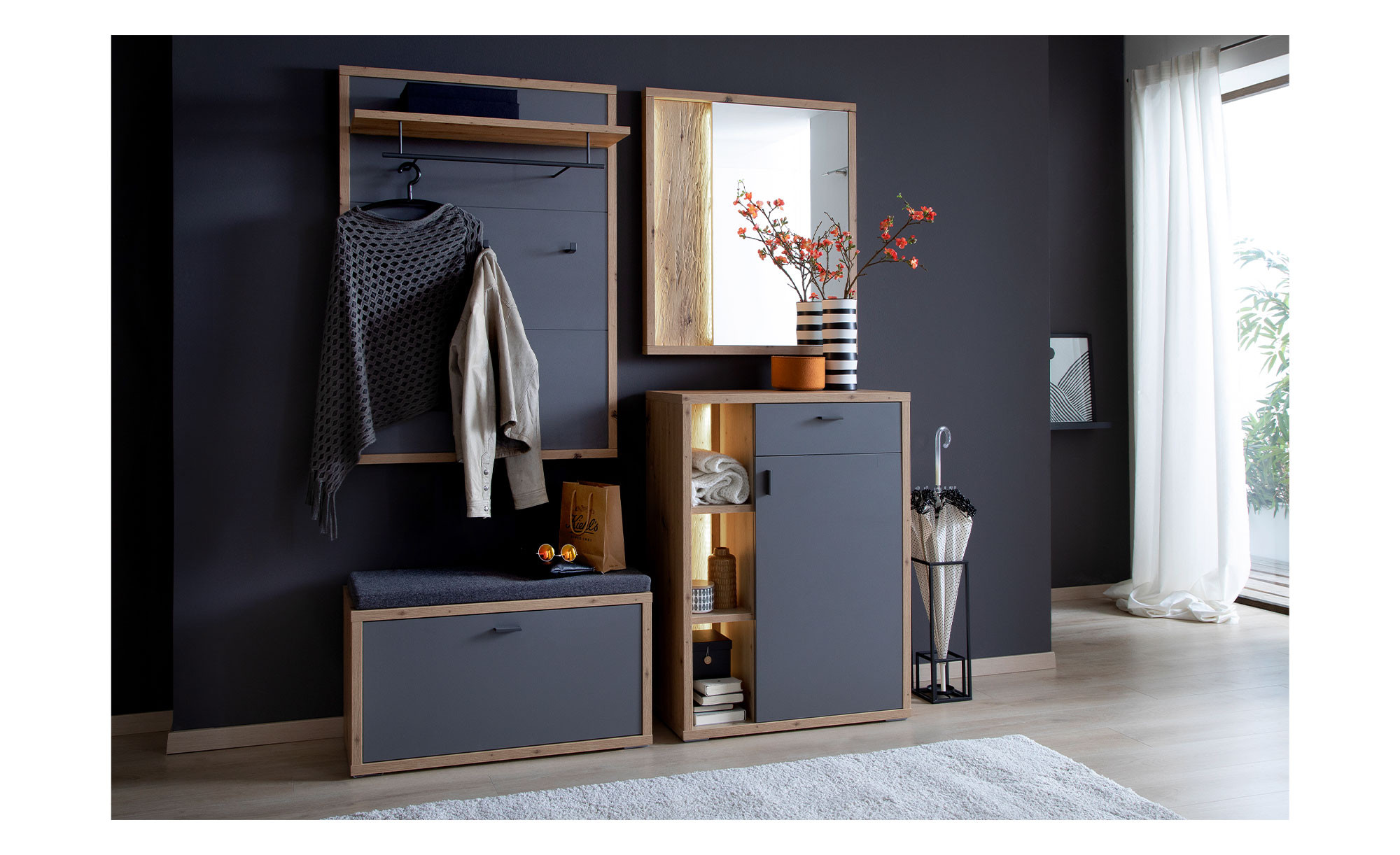 Mit ihrem im Dekor Balkeneiche gestalteten Korpus versprüht die ca. 76 x 103 x 37 cm große Kommode ein naturnah-gemütliches Flair. Auch an den Rückwänden findet sich der Balkeneiche-Look, beim sichtbaren Bereich sogar mit einem strukturierten 3D-Effekt. Die Front hingegen sorgt in Royal Grey für einen gelungenen Kontrast. Für eine lange Haltbarkeit wurde ihre Oberfläche mit Melaminharz beschichtet.