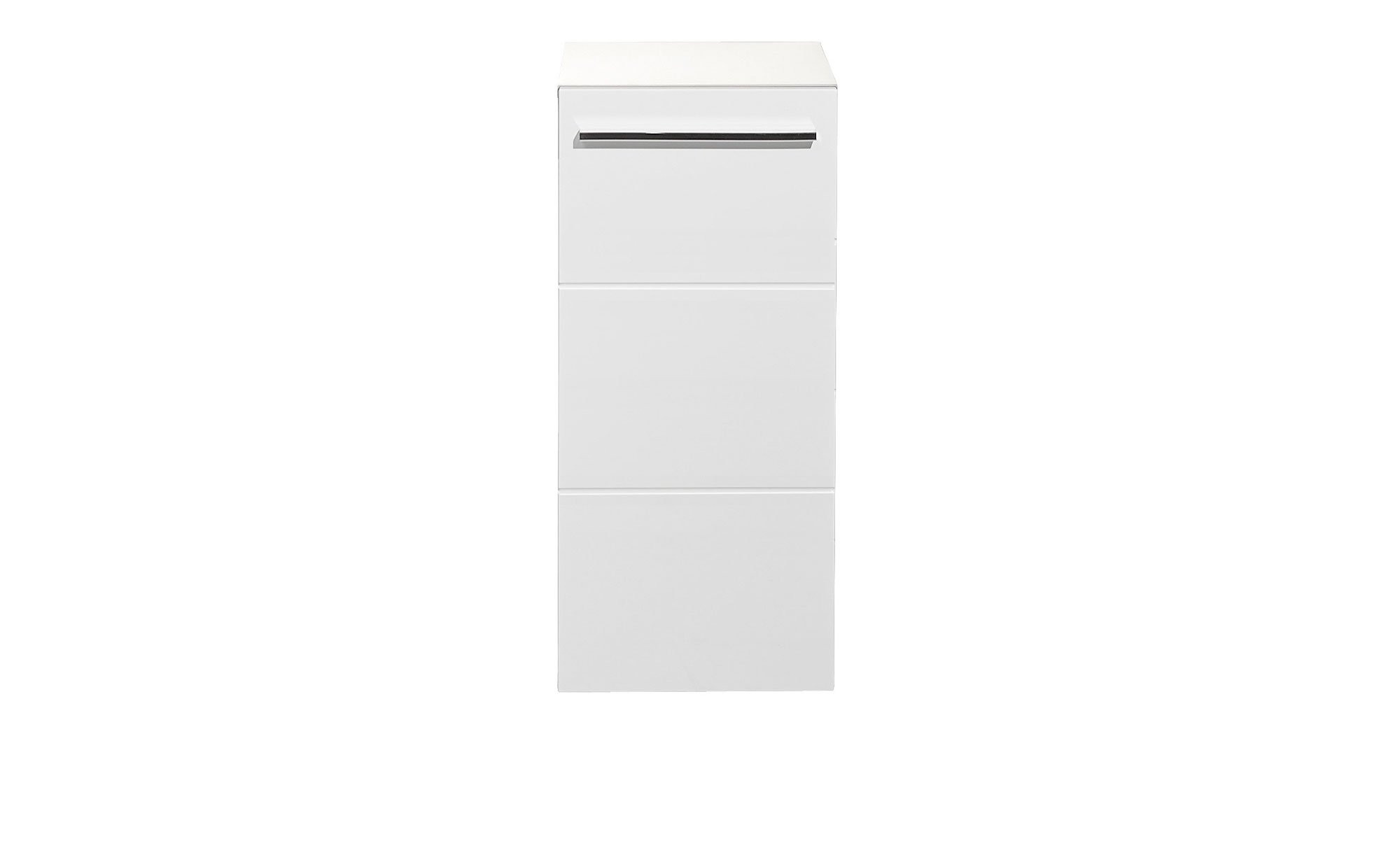 Der Korpus des ca. 34 x 72 x 31 cm großen Möbelstücks besteht aus Holzwerkstoff und ist in einem matten Weiß gehalten. Eine Beschichtung aus Melaminharz sorgt für Schutz vor Kratzern und sonstigem Verschleiß. Abgerundet wird das Bild durch eine hochglänzend weiß folierte Vorderseite.